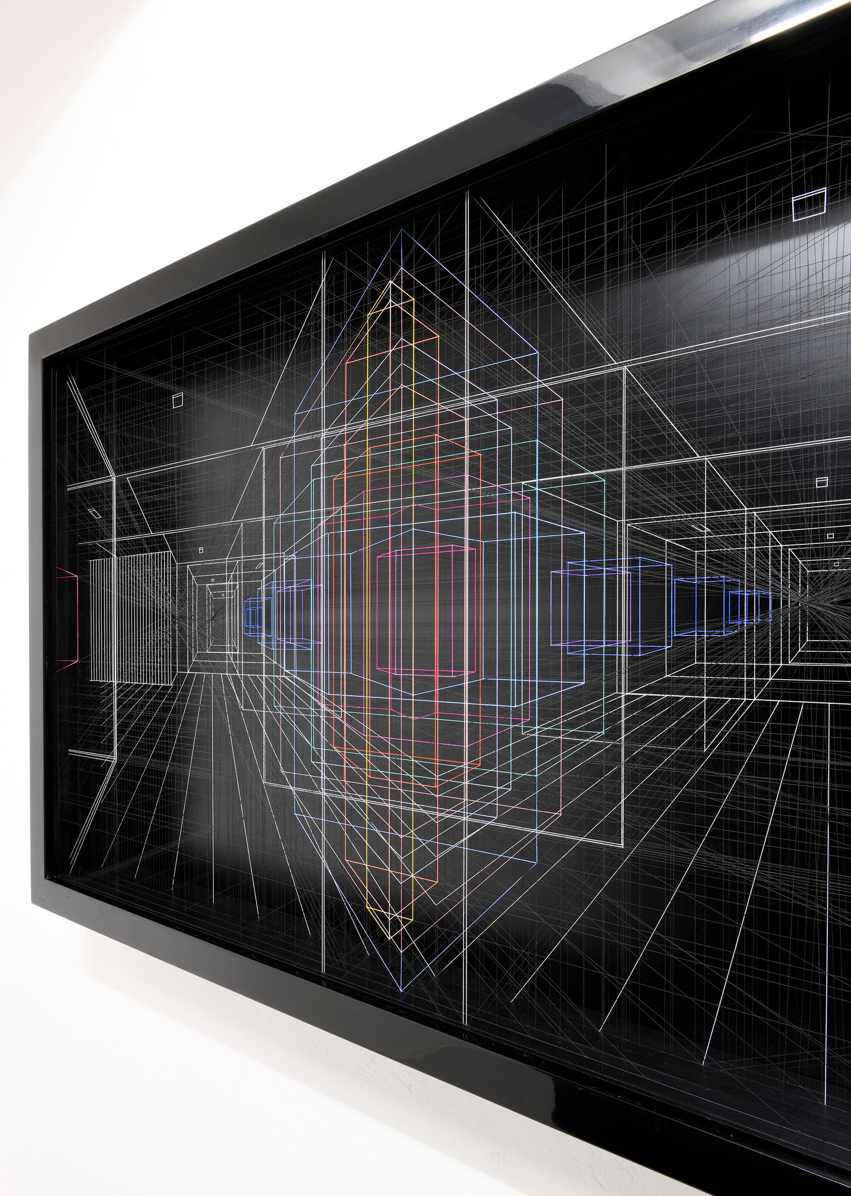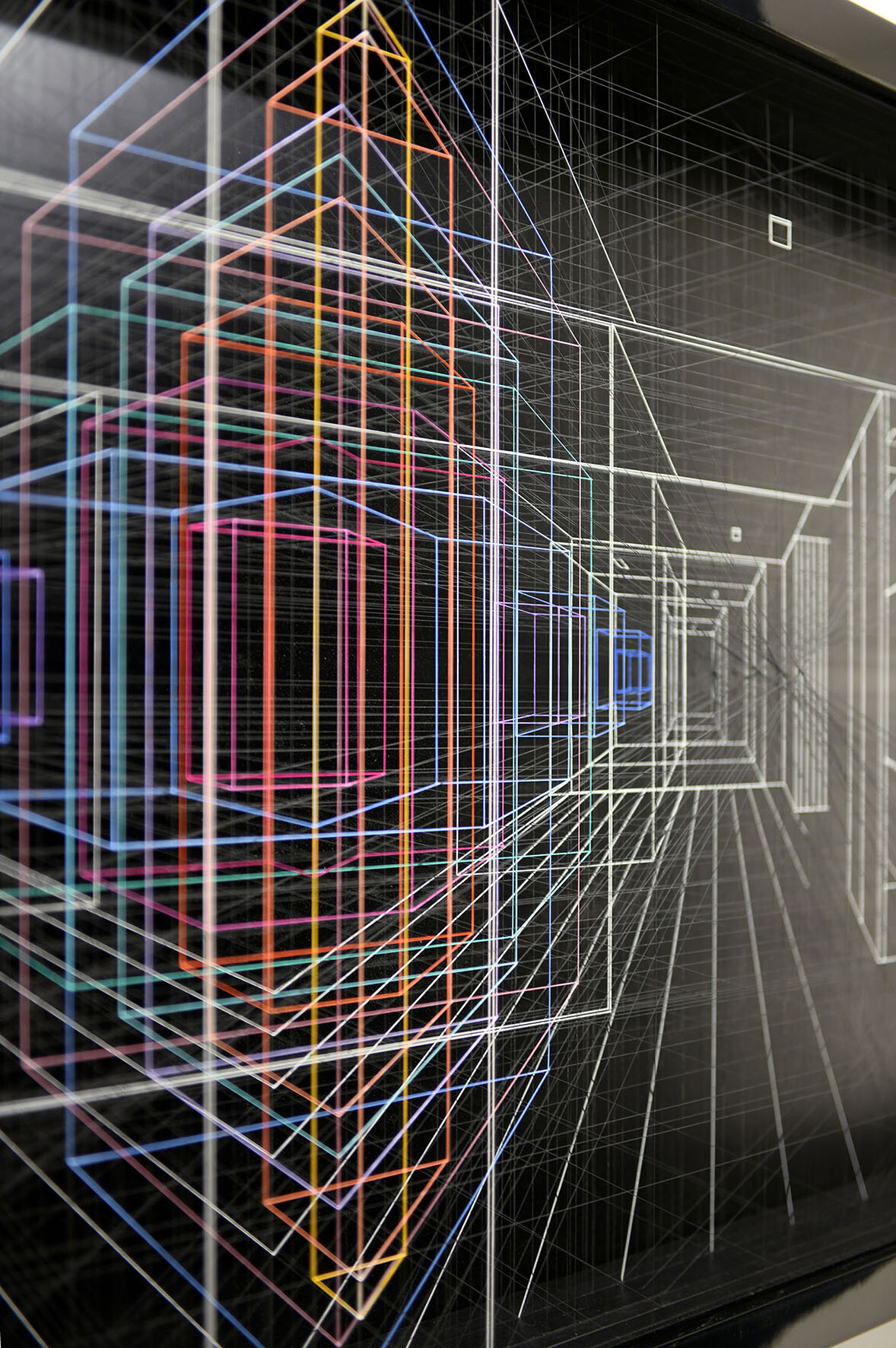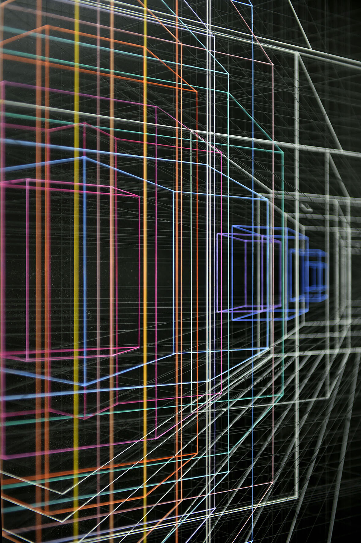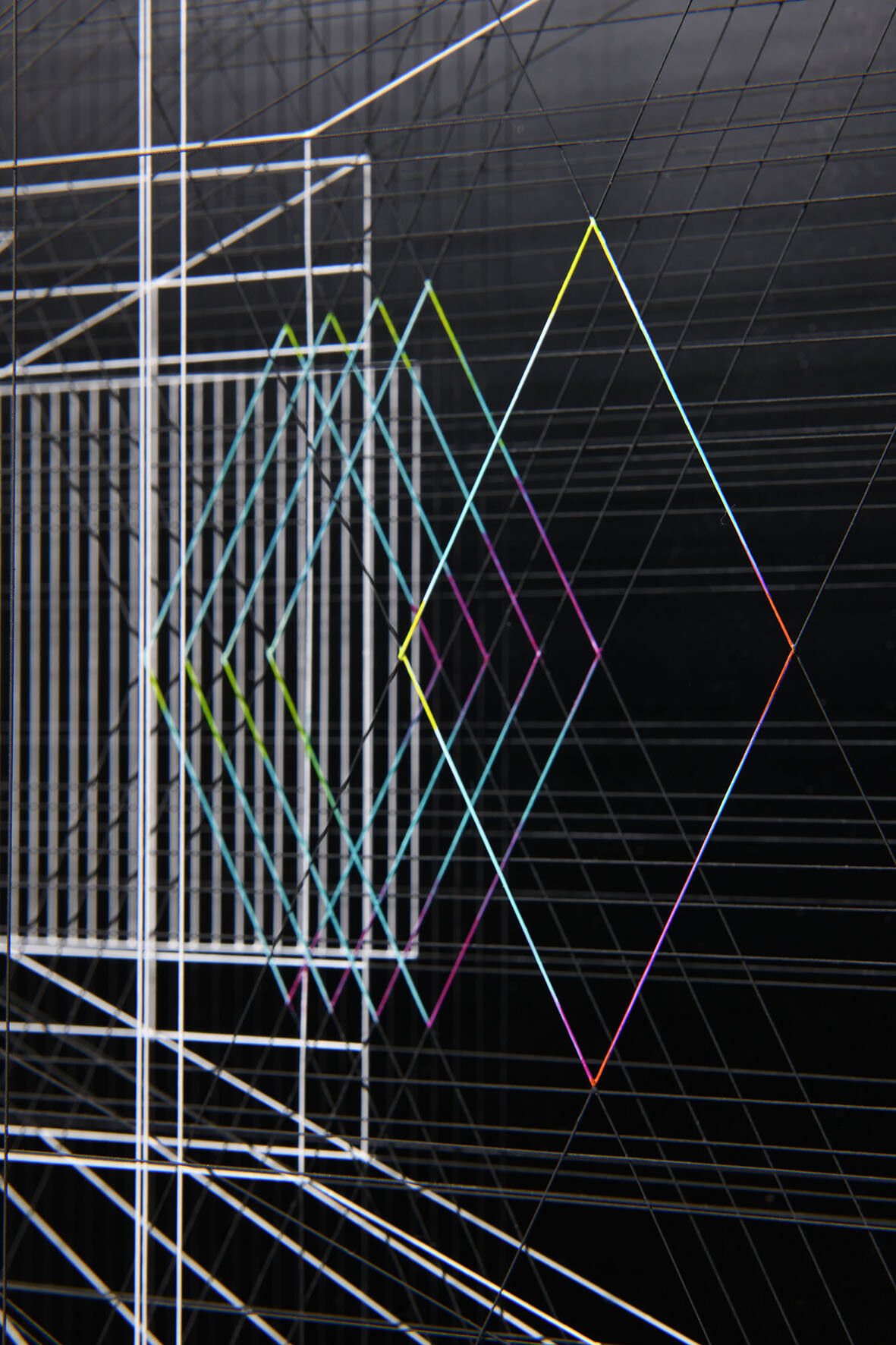 Smalto e acrilico su filo di fluorocarbonio, cornice in legno laccato, telai interni in legno laccato e acciaio, fondo in alluminio verniciato, Vetro Museale