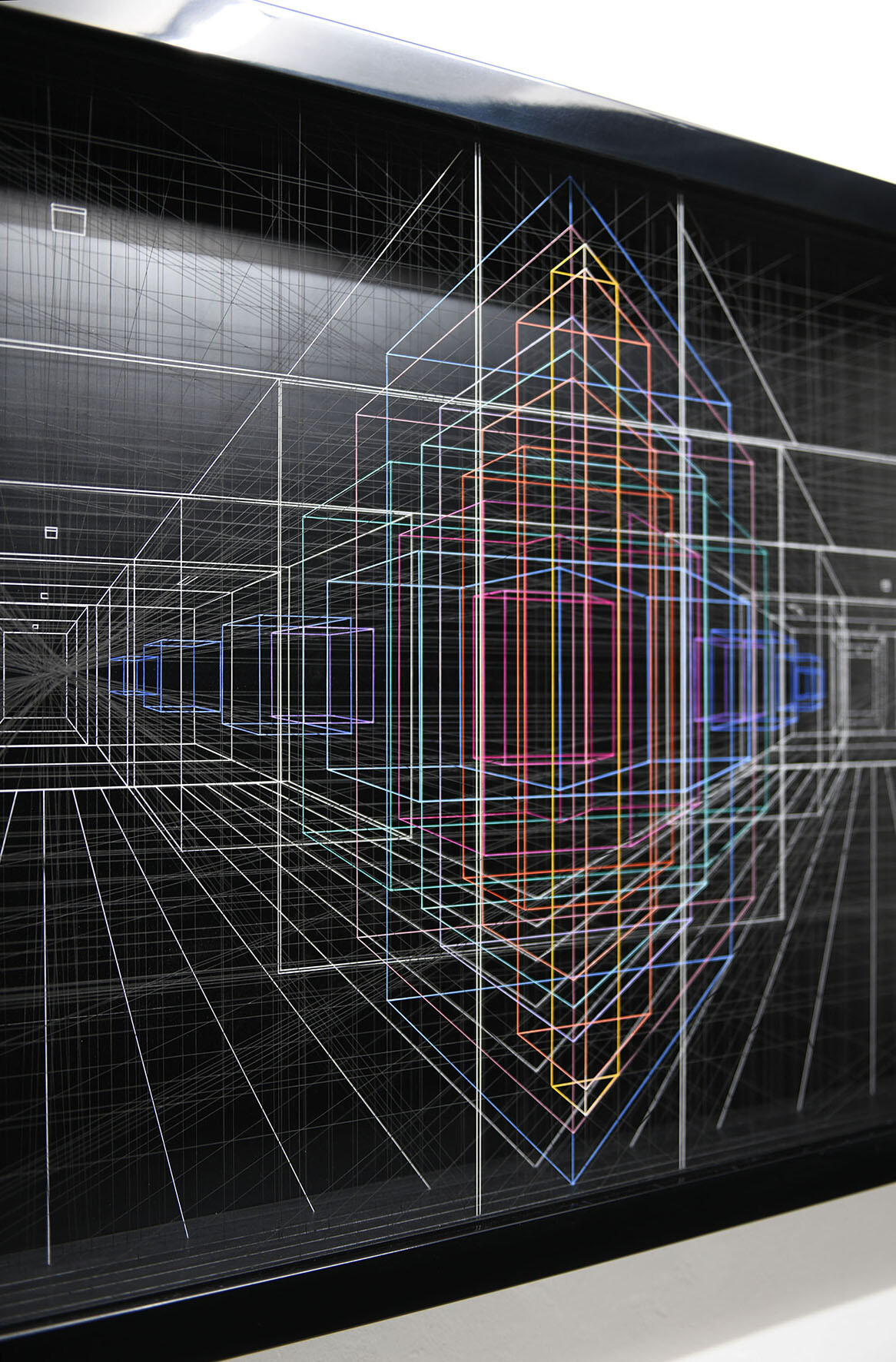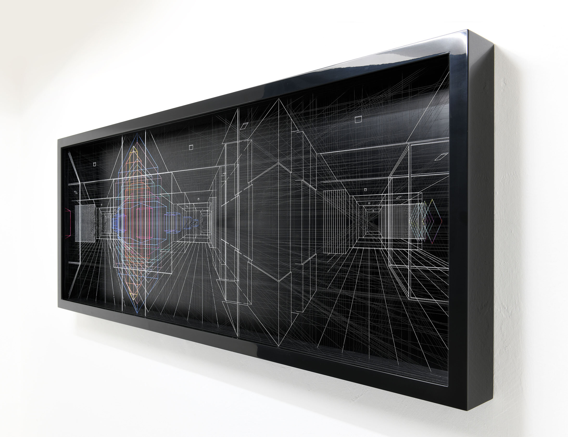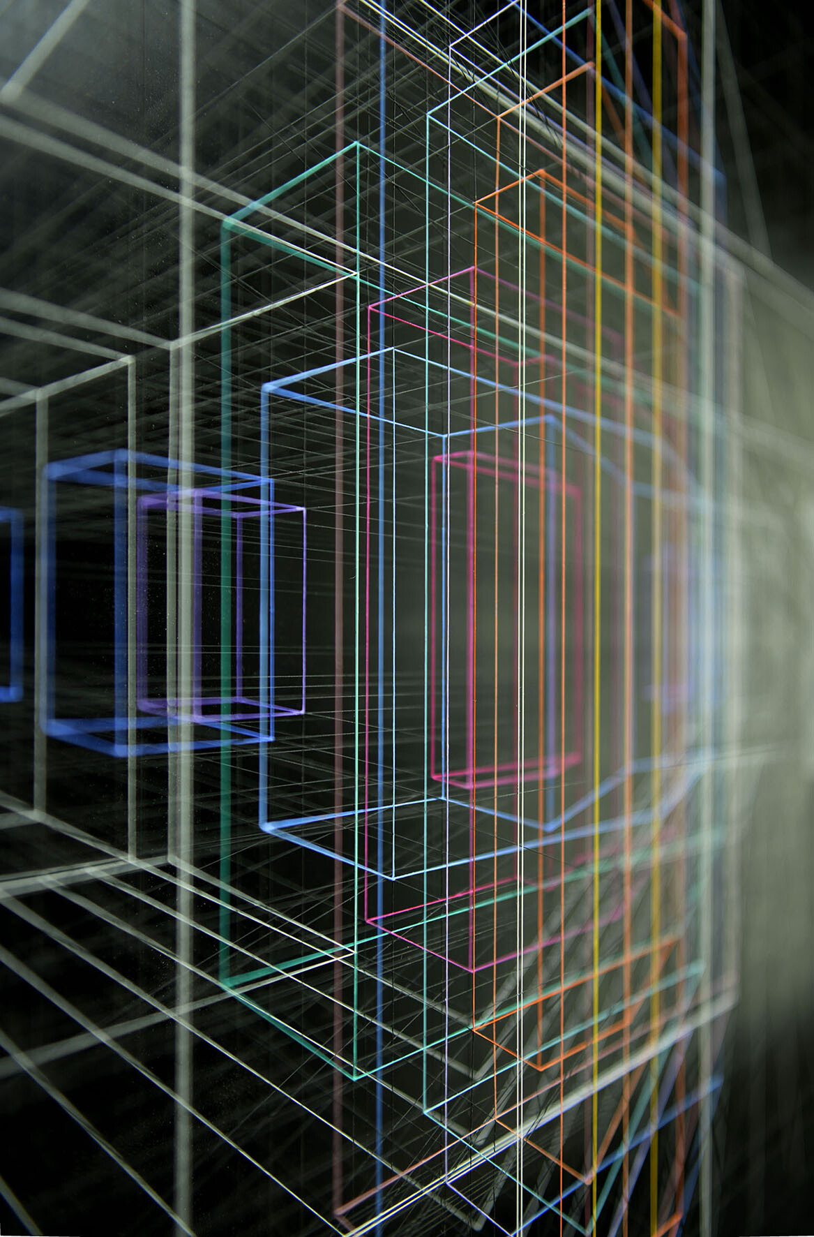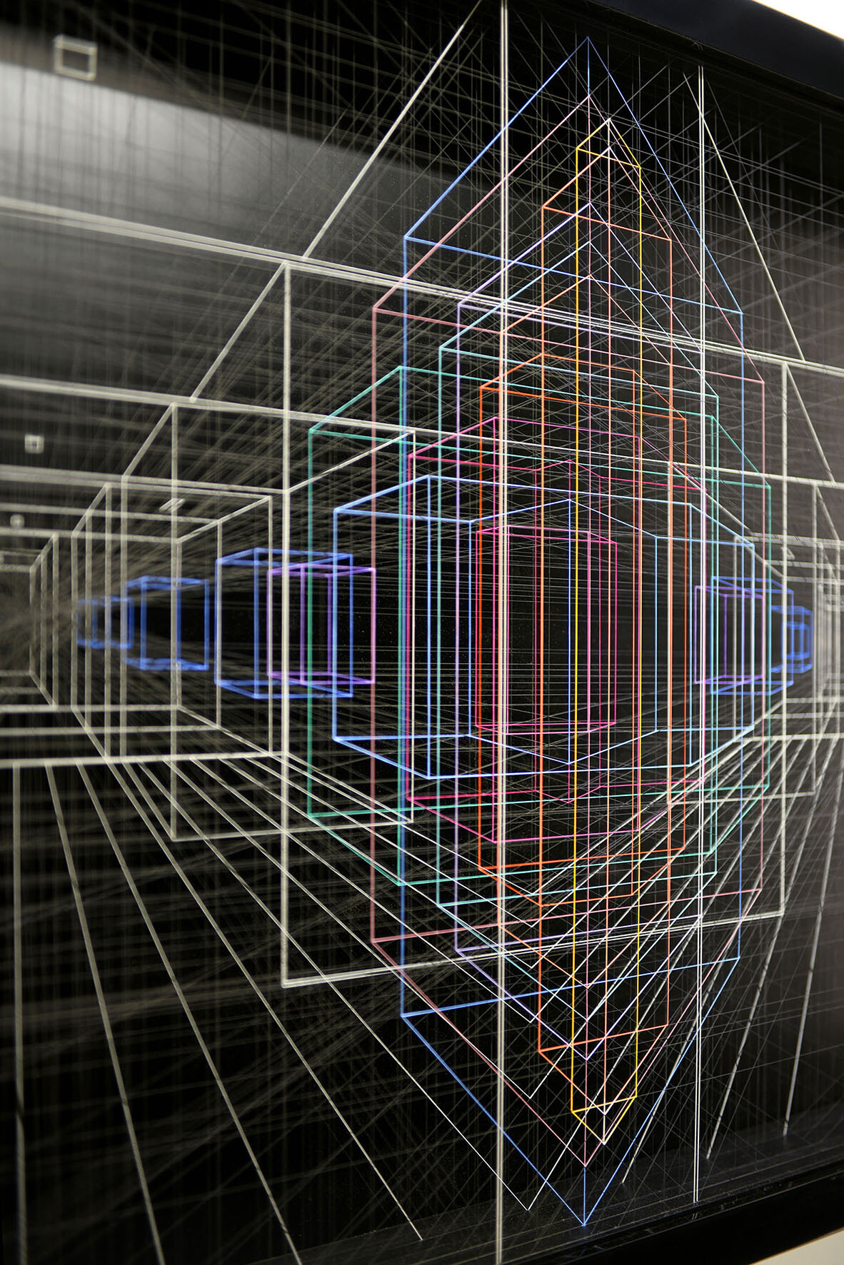 Smalto e acrilico su filo di fluorocarbonio, cornice in legno laccato, telai interni in legno laccato e acciaio, fondo in alluminio verniciato, Vetro Museale