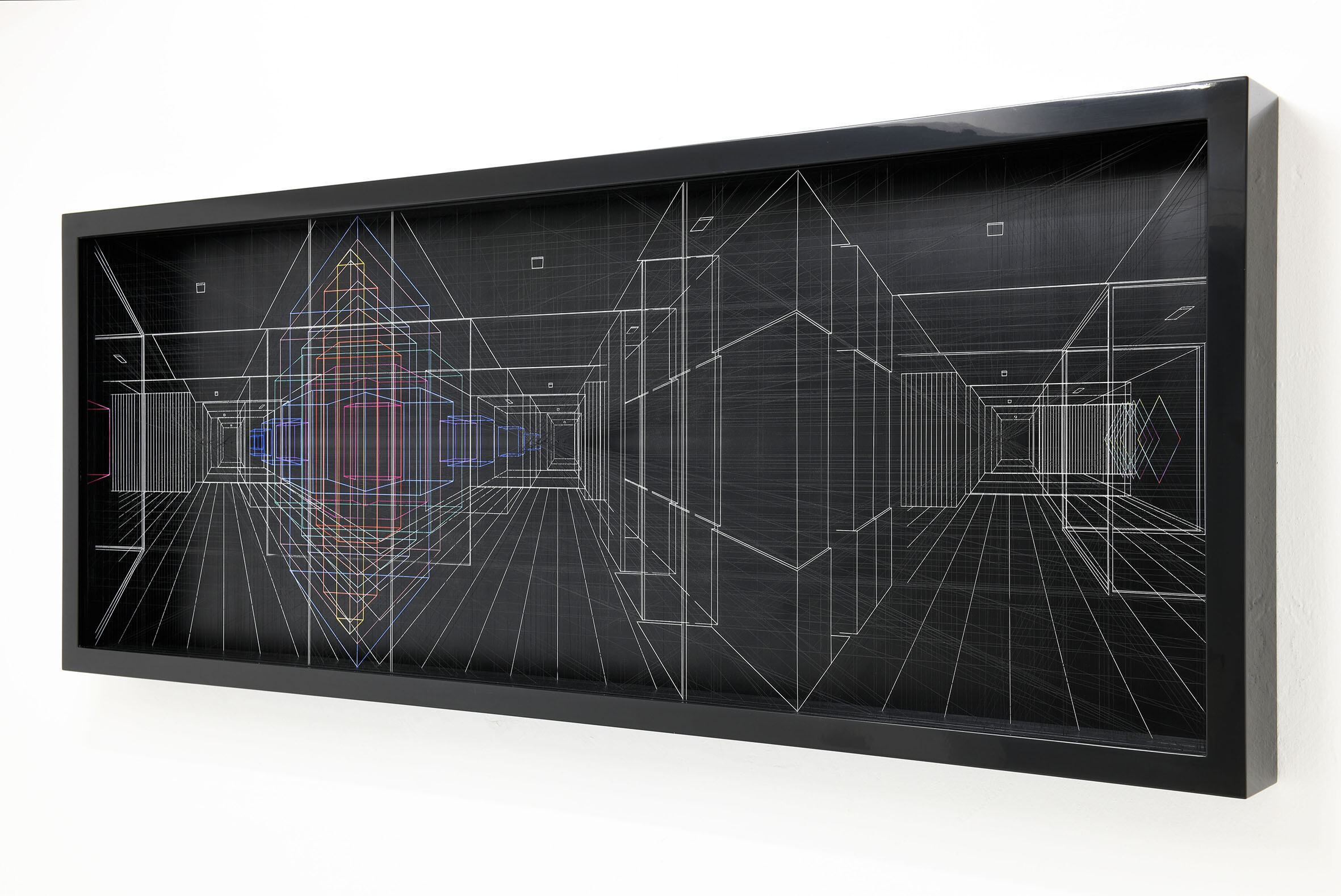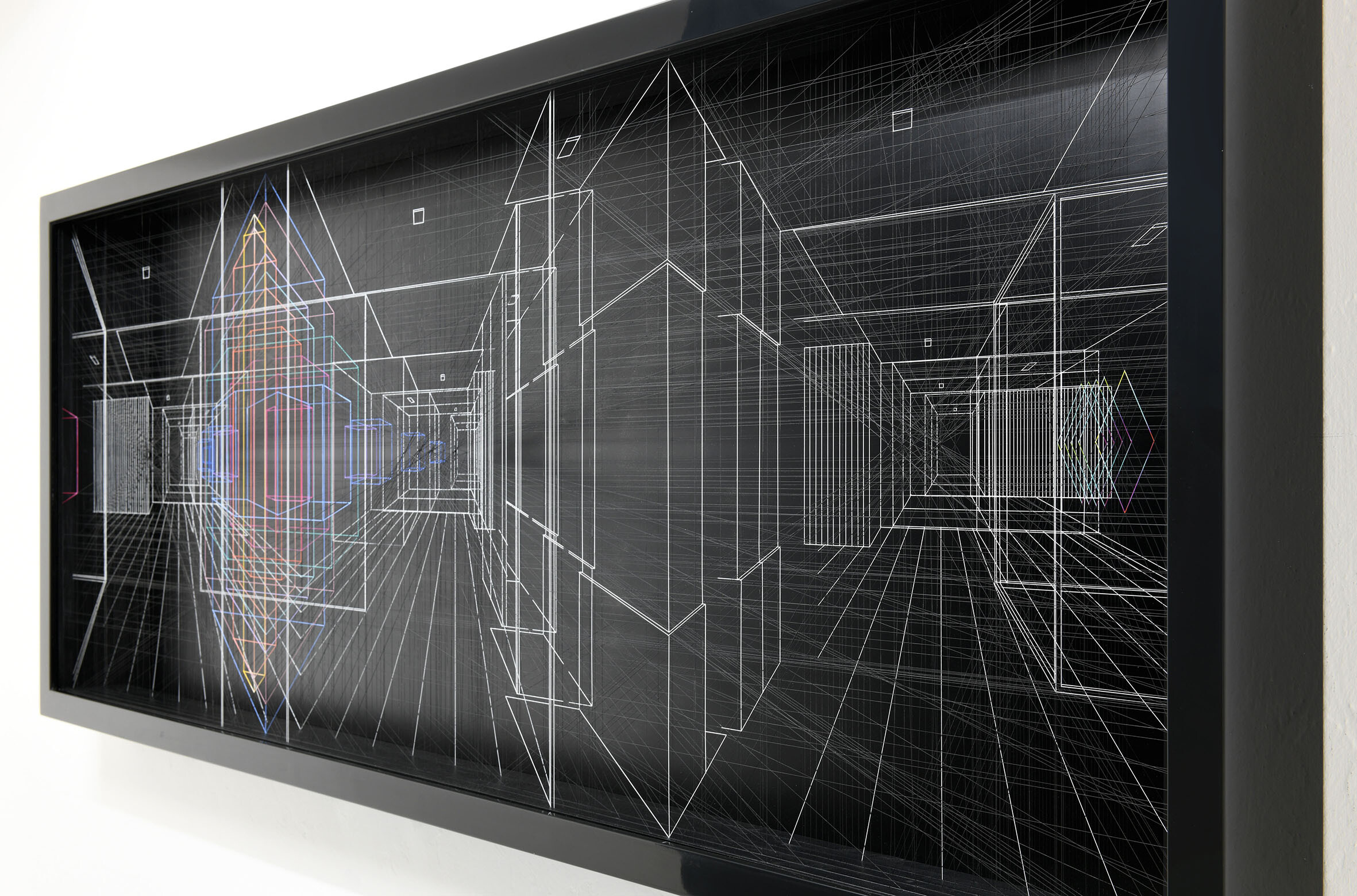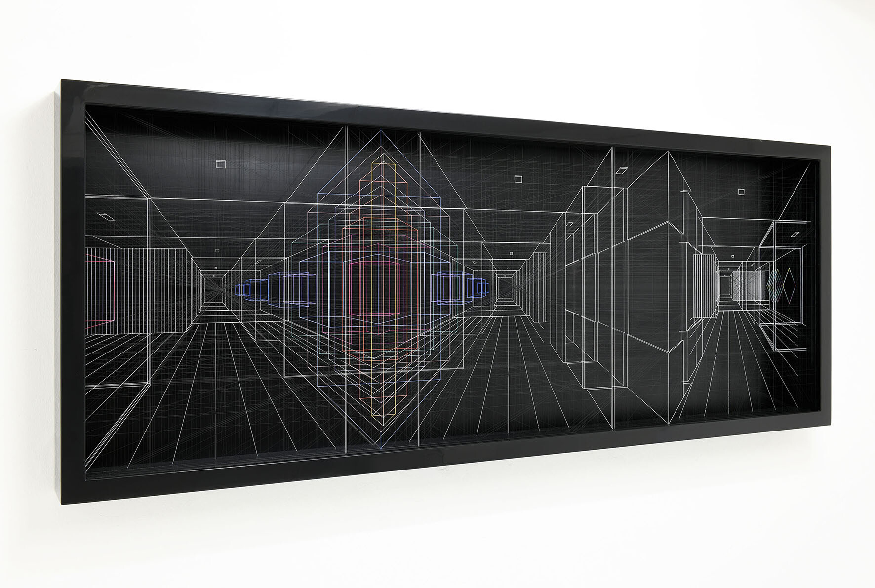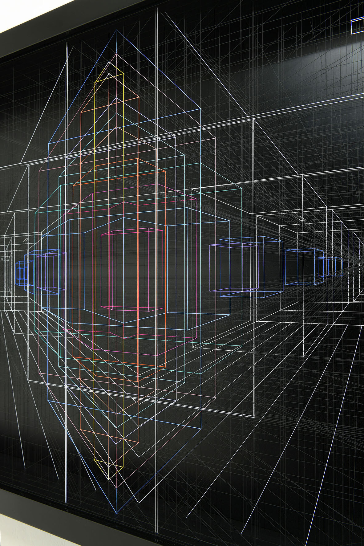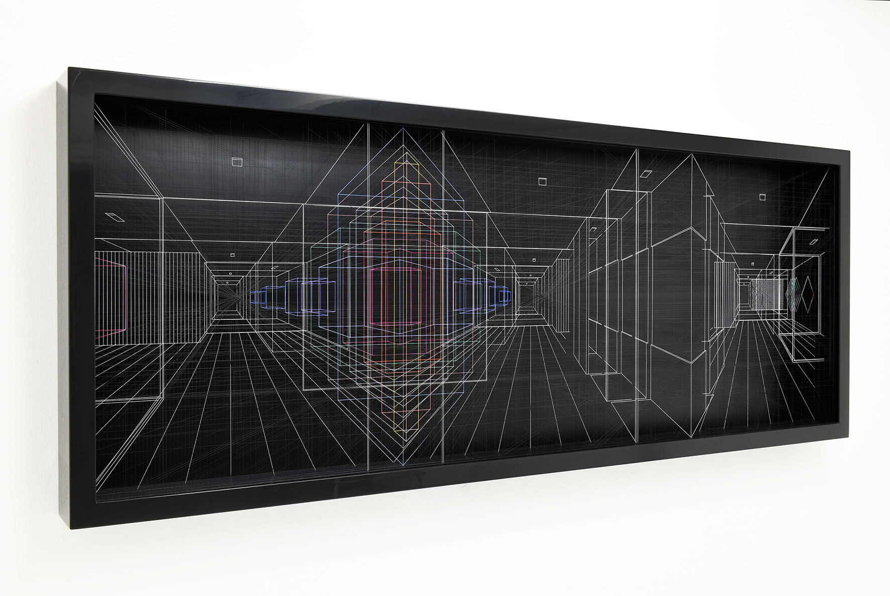 Smalto e acrilico su filo di fluorocarbonio, cornice in legno laccato, telai interni in legno laccato e acciaio, fondo in alluminio verniciato, Vetro Museale