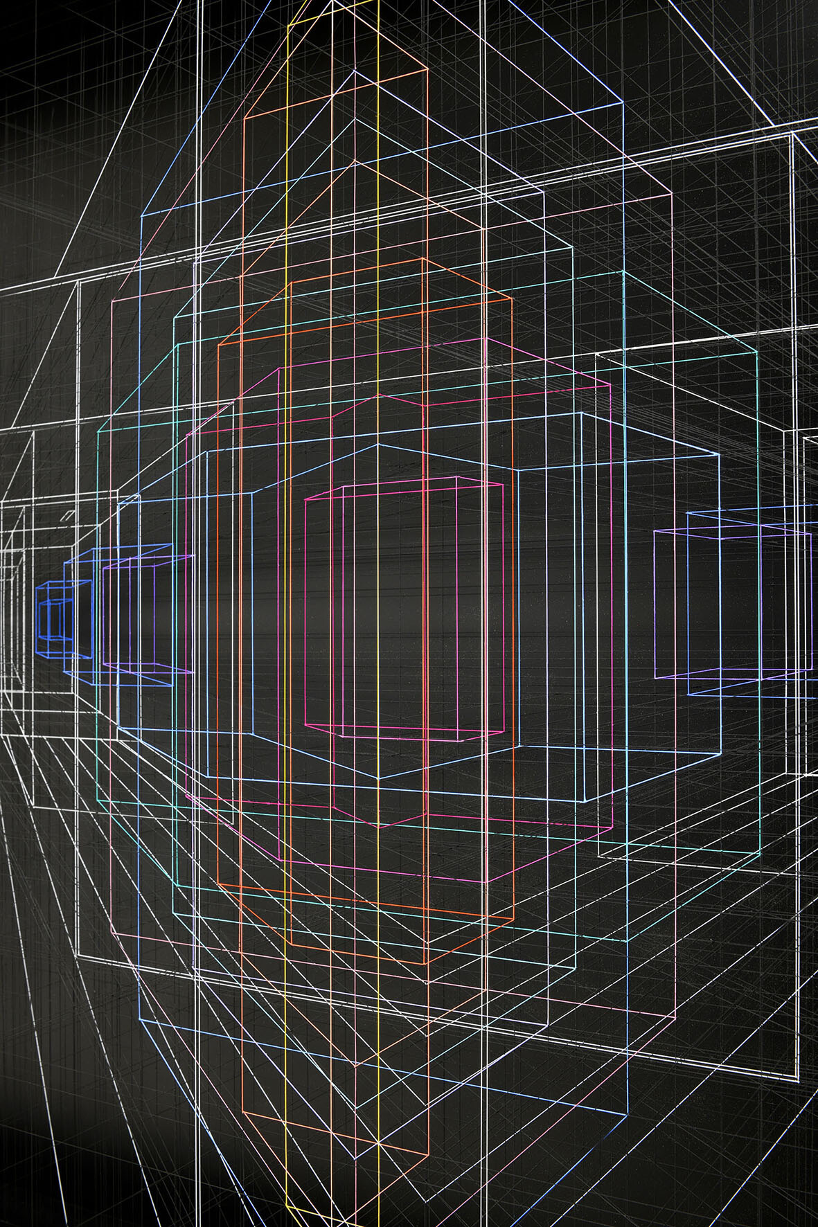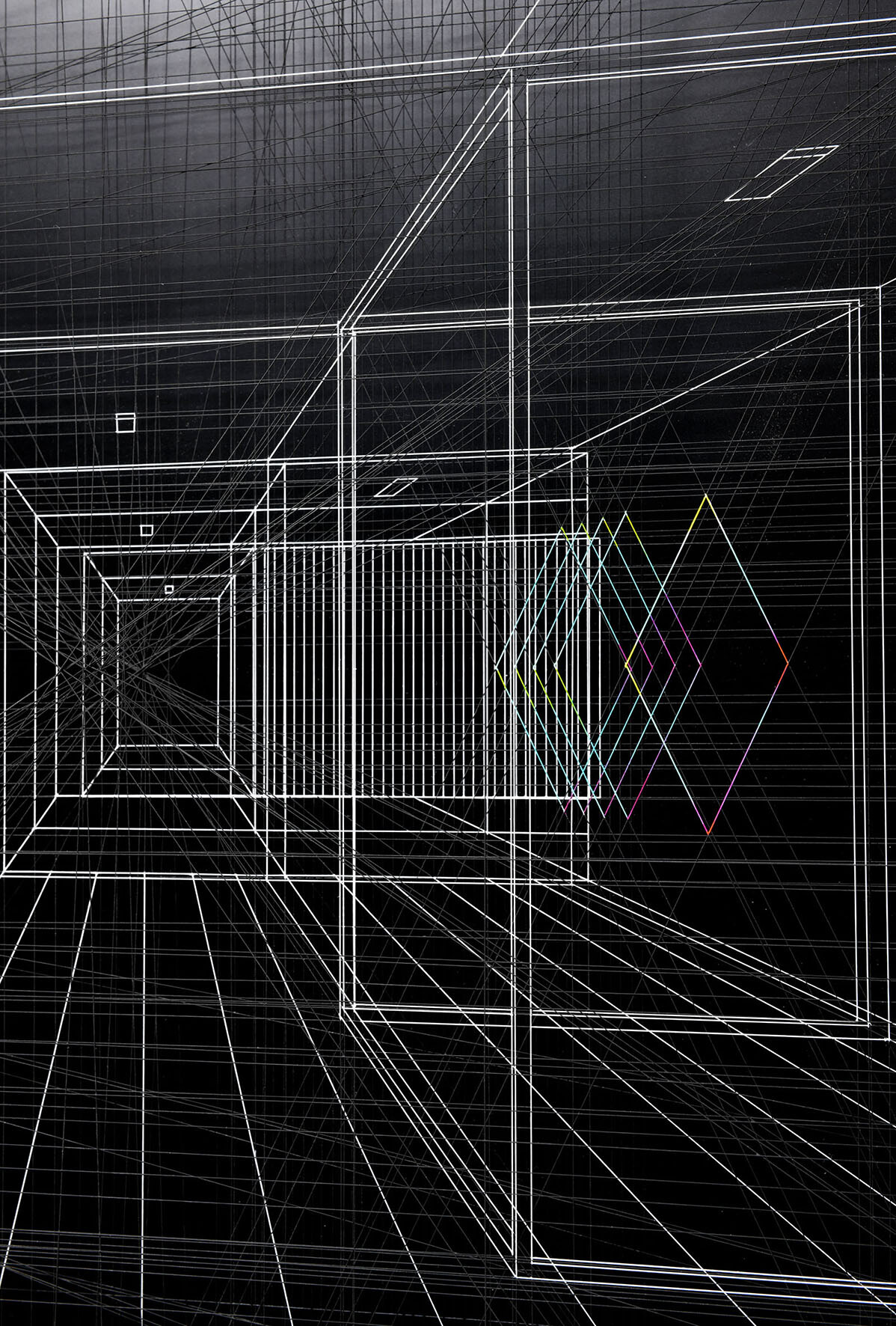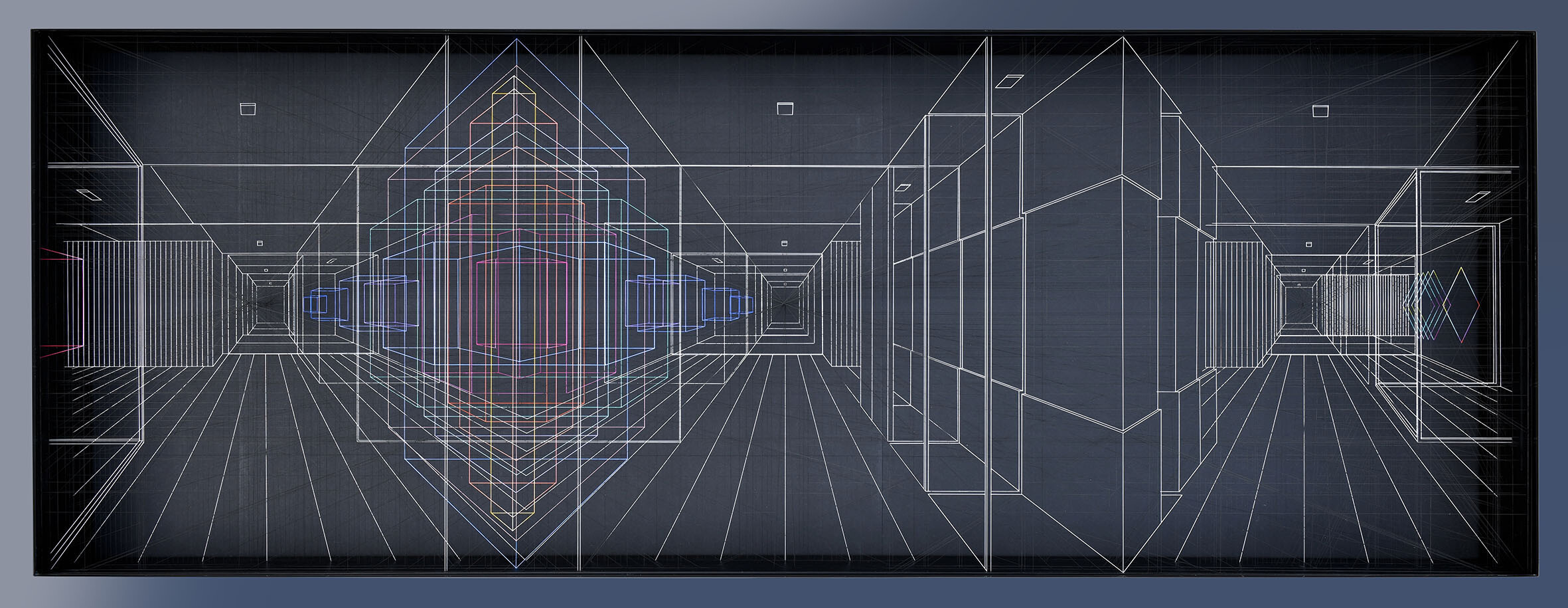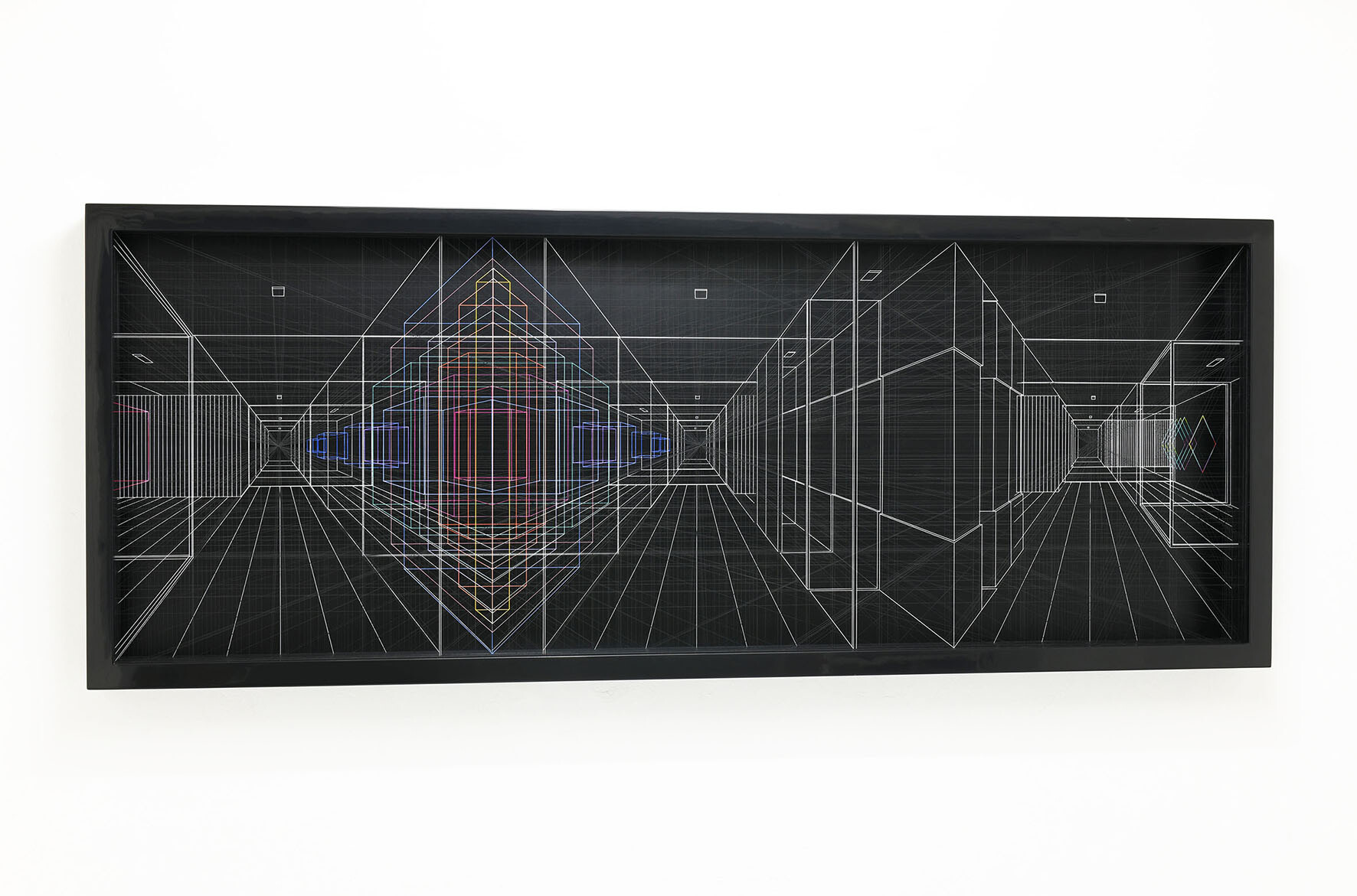 Smalto e acrilico su filo di fluorocarbonio, cornice in legno laccato, telai interni in legno laccato e acciaio, fondo in alluminio verniciato, Vetro Museale