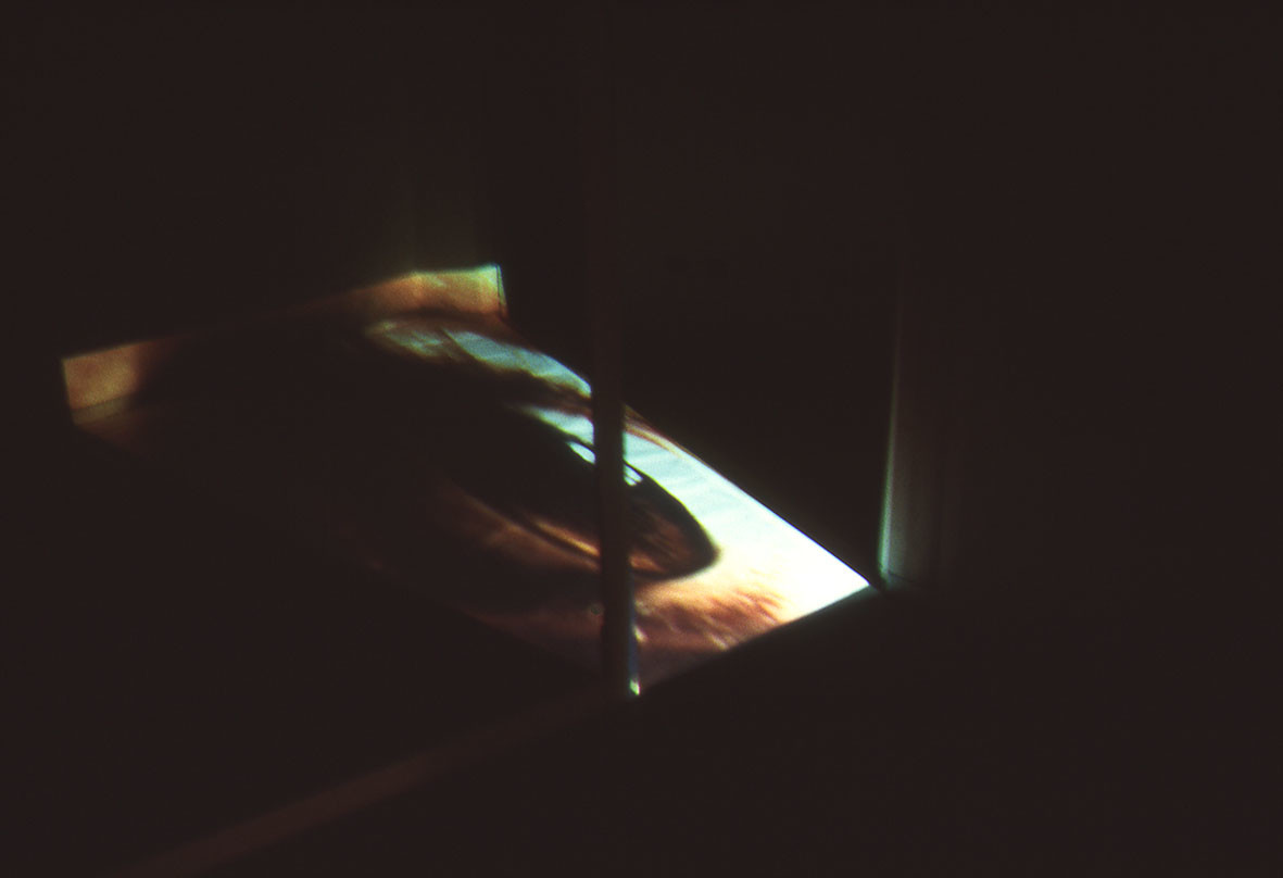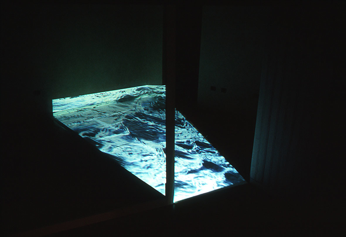 The site specific video installation was made and placed at the beginning of the exhibition path. A wide open door illuminates the floor with projected video images.The audience have to enter and cross the space of the room by walking on these projections: moving images of water, skies, eyes that look.