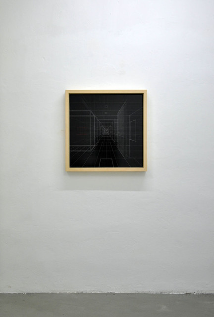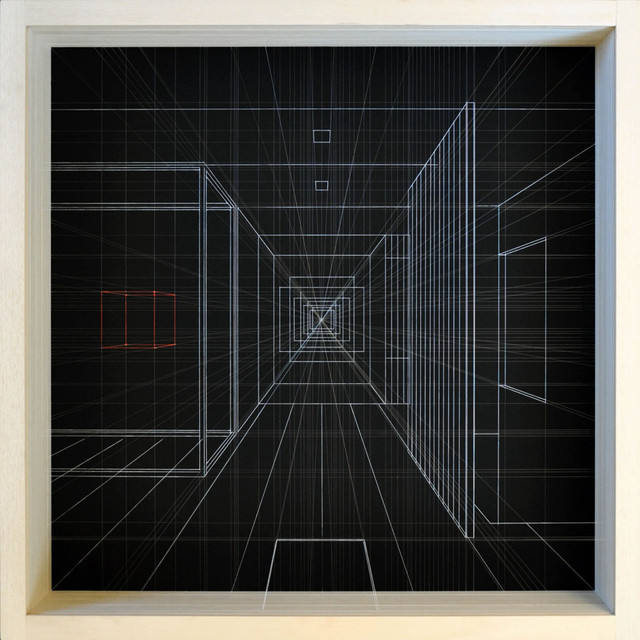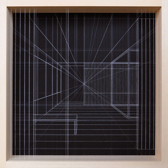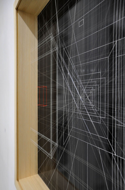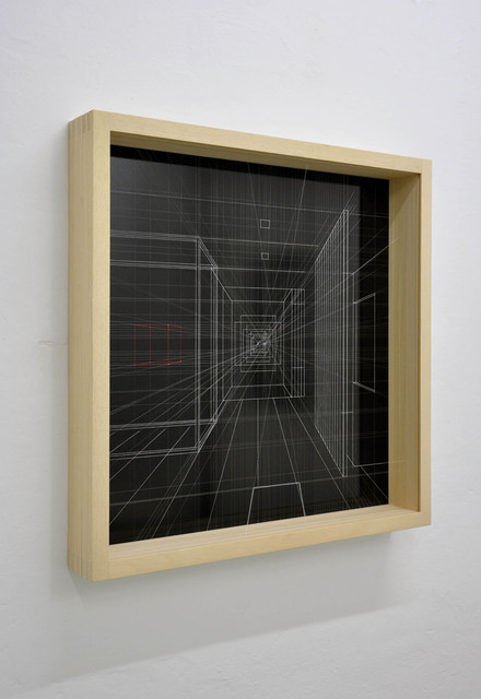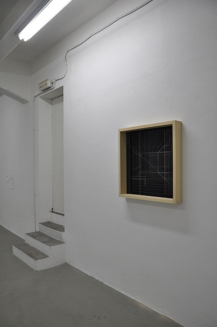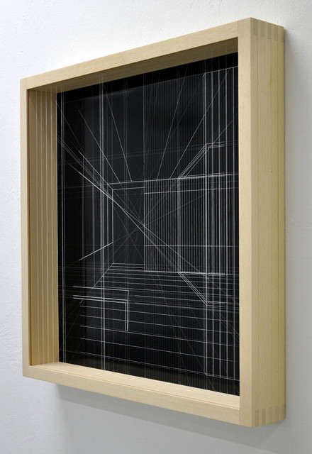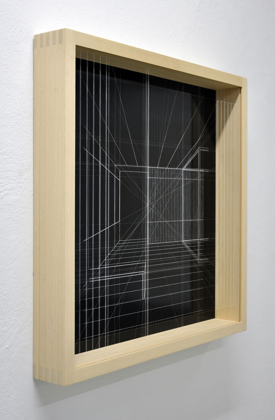 acrylic on nylon line, wood frame, metal background, plexiglas