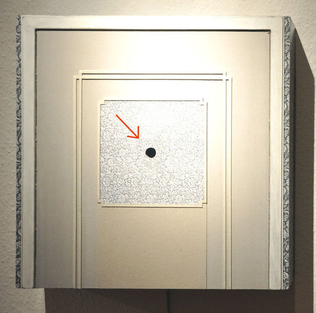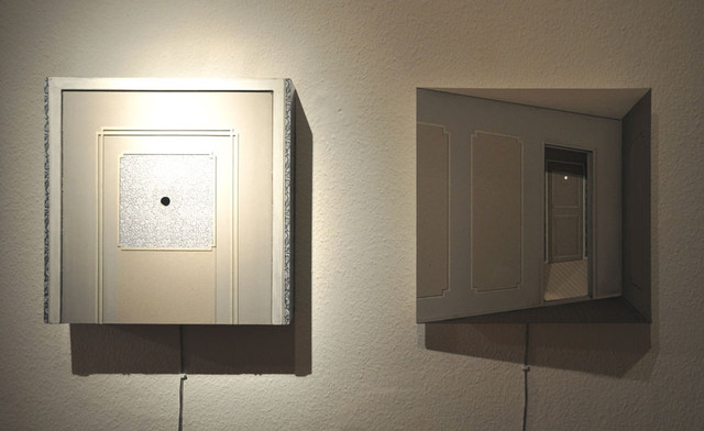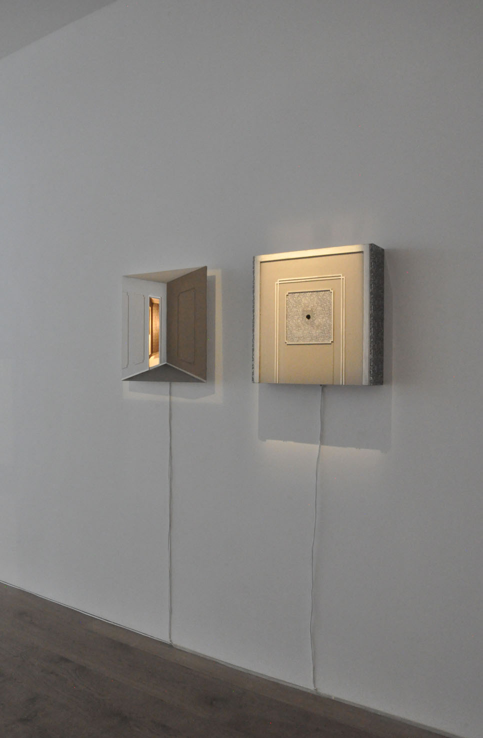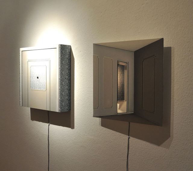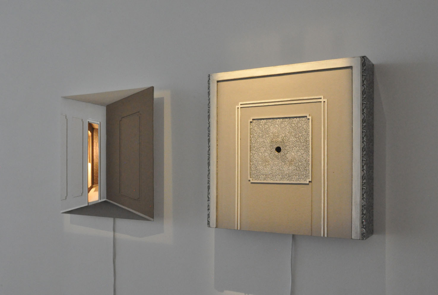 Cardboard, wood, paper, acrylic, mirror, lights with timer