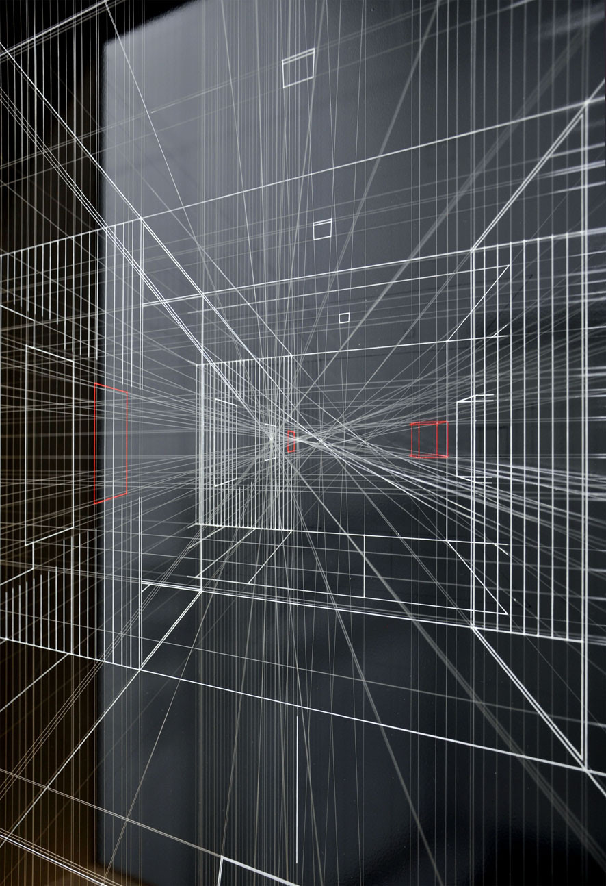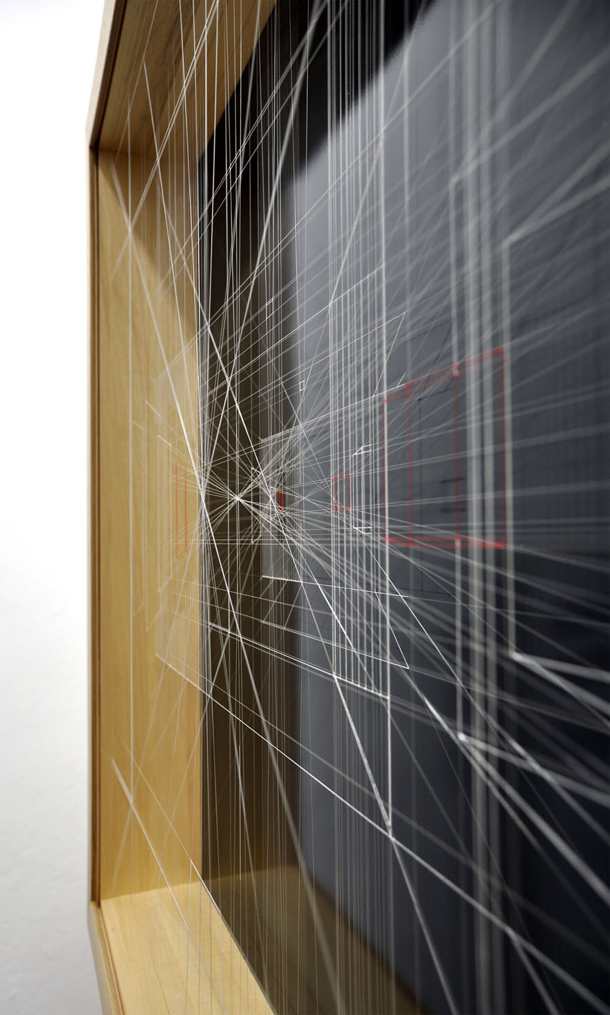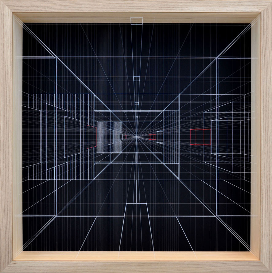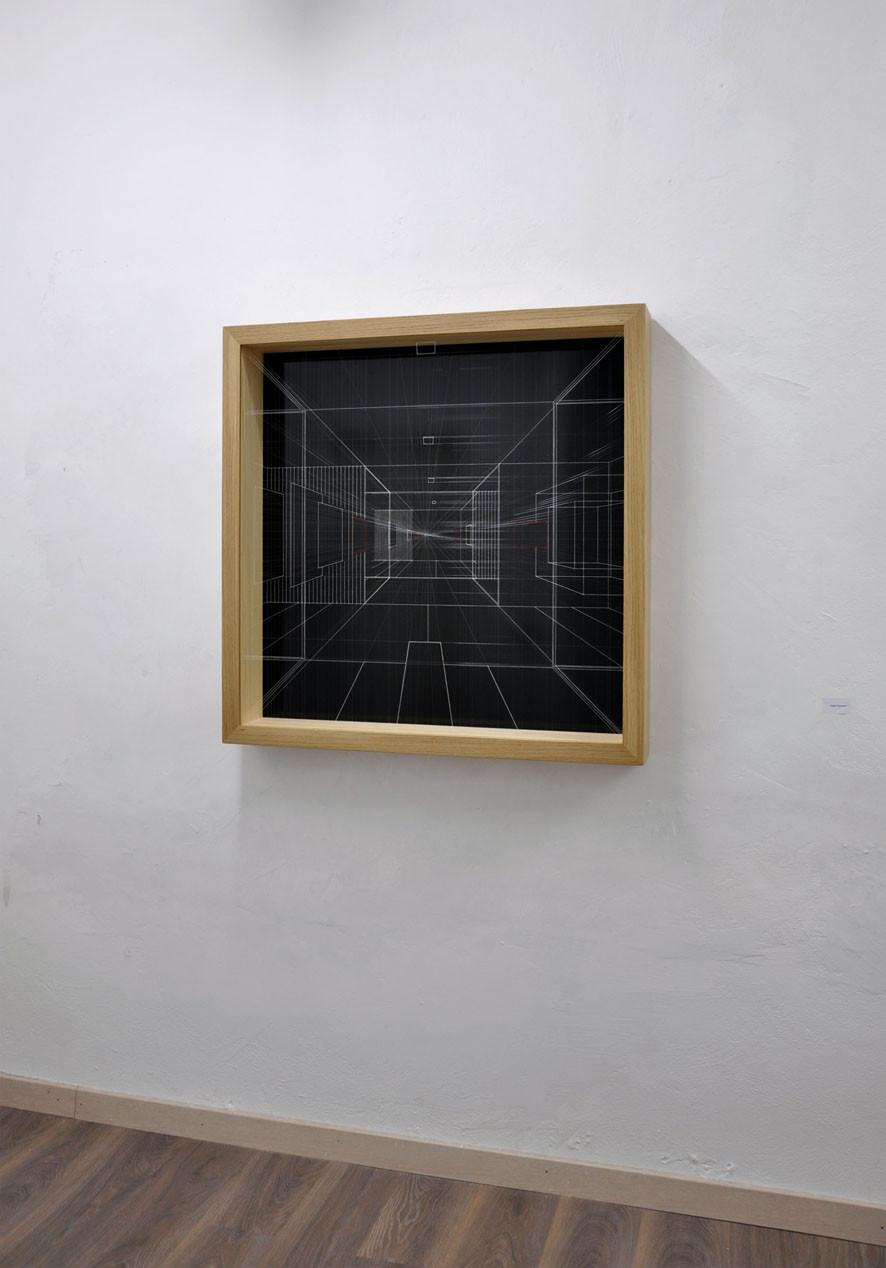Acrylic on fluorocarbon thread, wood frame, metal background, plexiglas