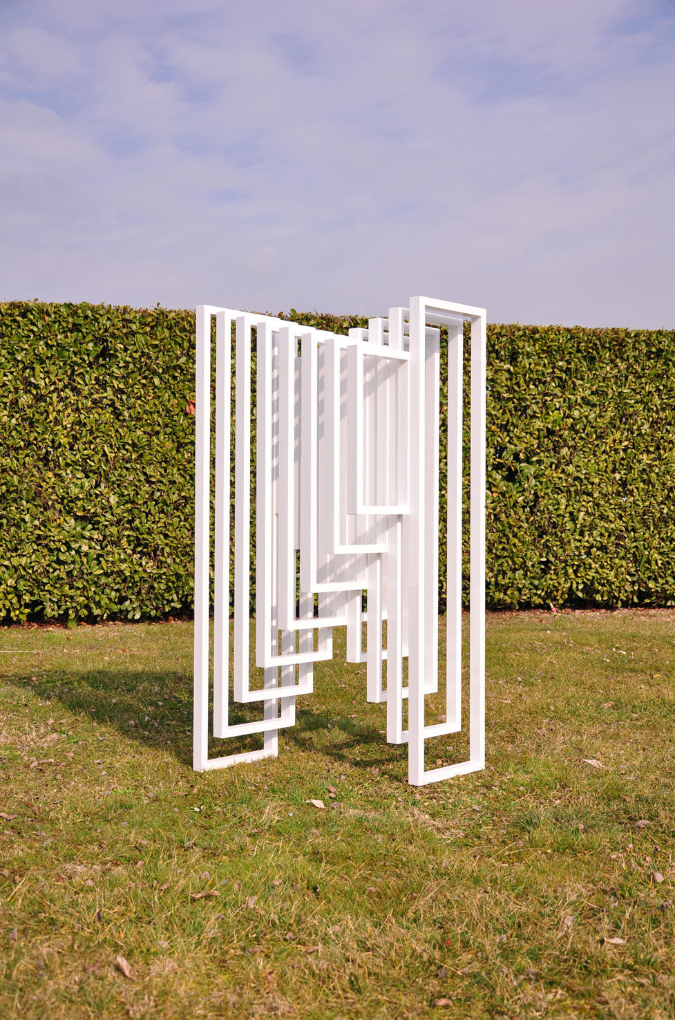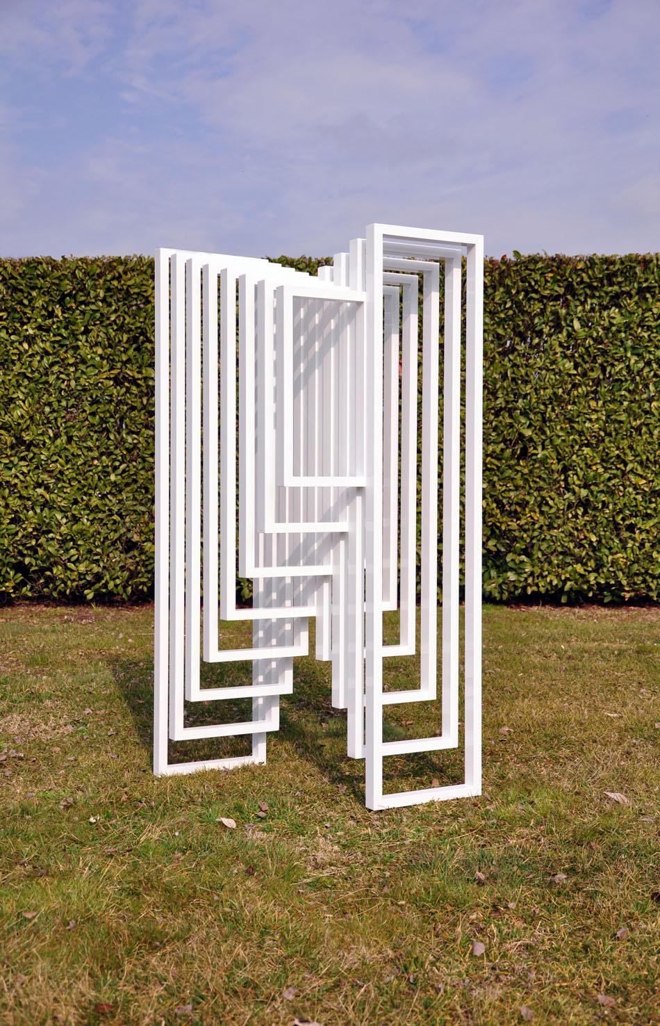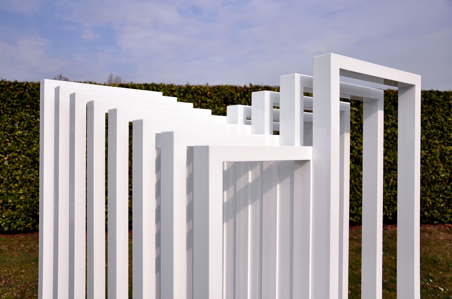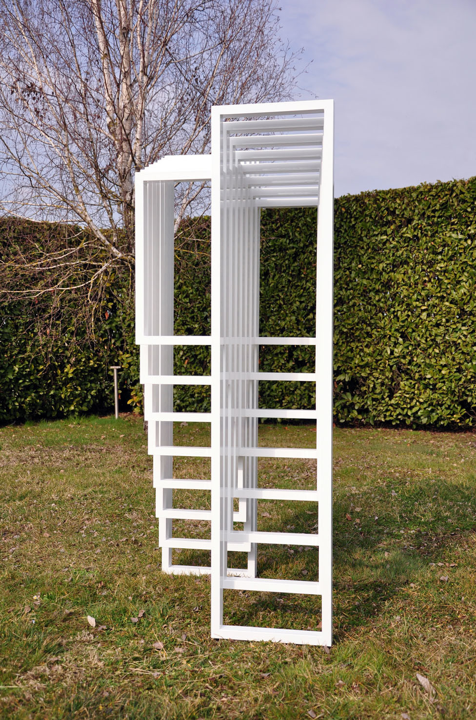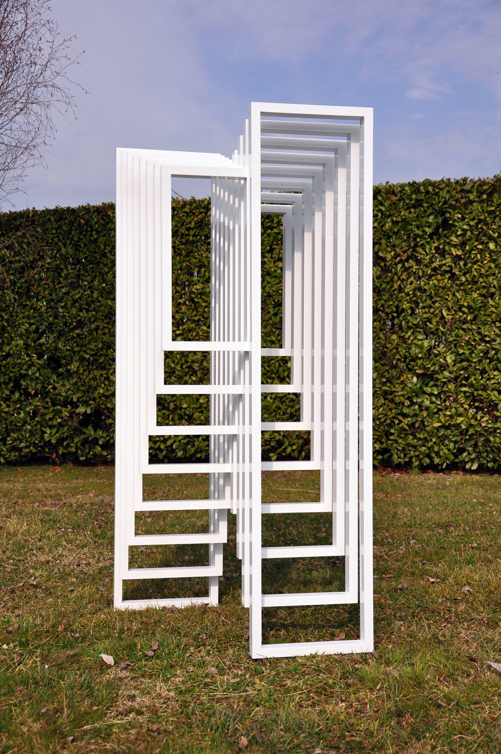 Hidden Steps was created on the concept of the “threshold” and on the mathematical theorem of Euclid, which says: “two parallel lines touch each other only at infinity”. It is a structure made in white thin aluminum frames, assembled together. The form consist in two symmetric abstract and opposite stairs: looking at one you will not see the other. The sculpture plays on full and empty rhythms, creating a dynamic perception of space.
