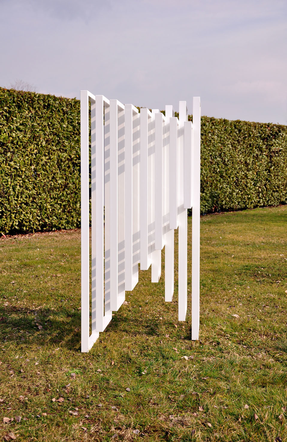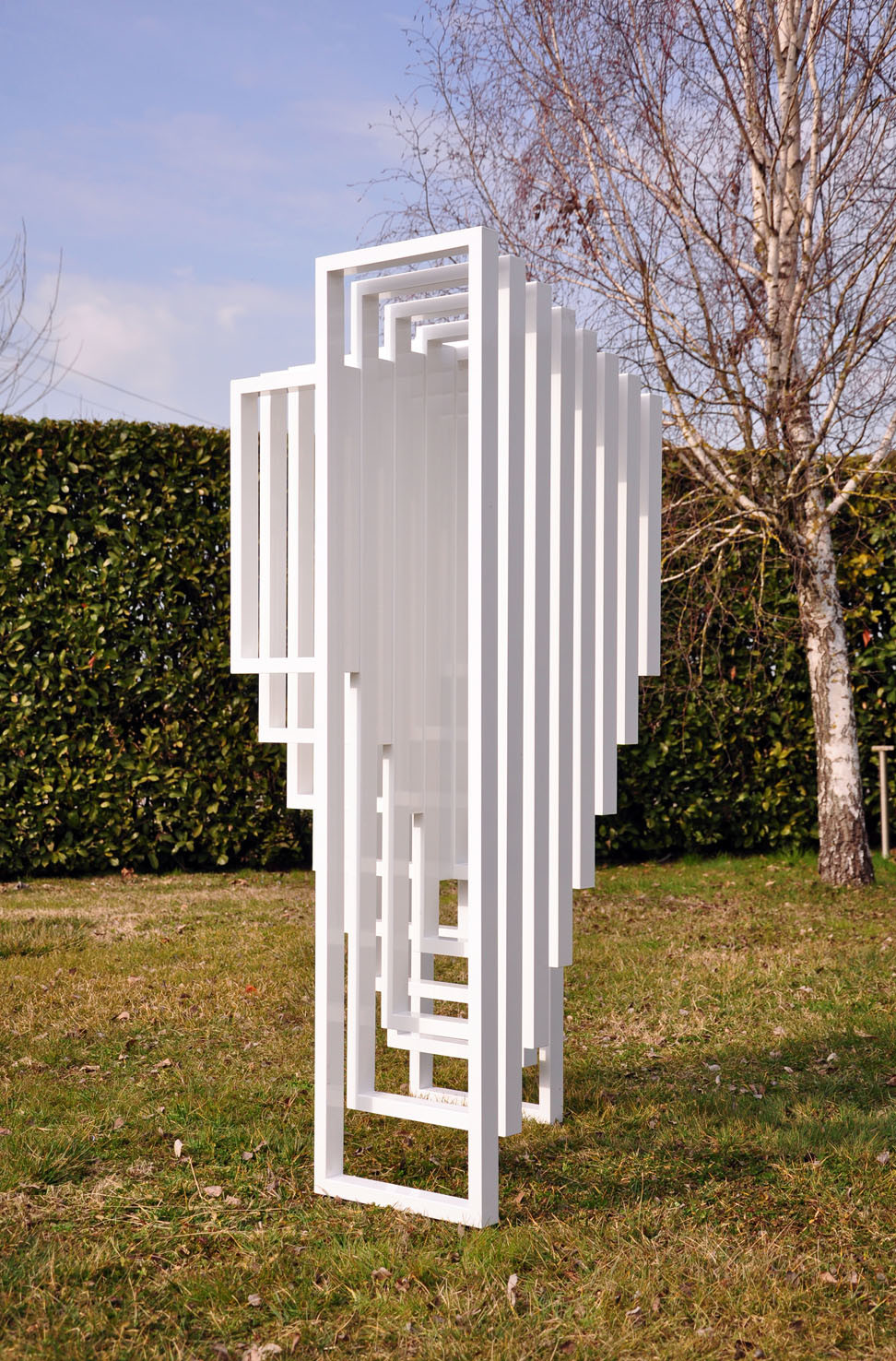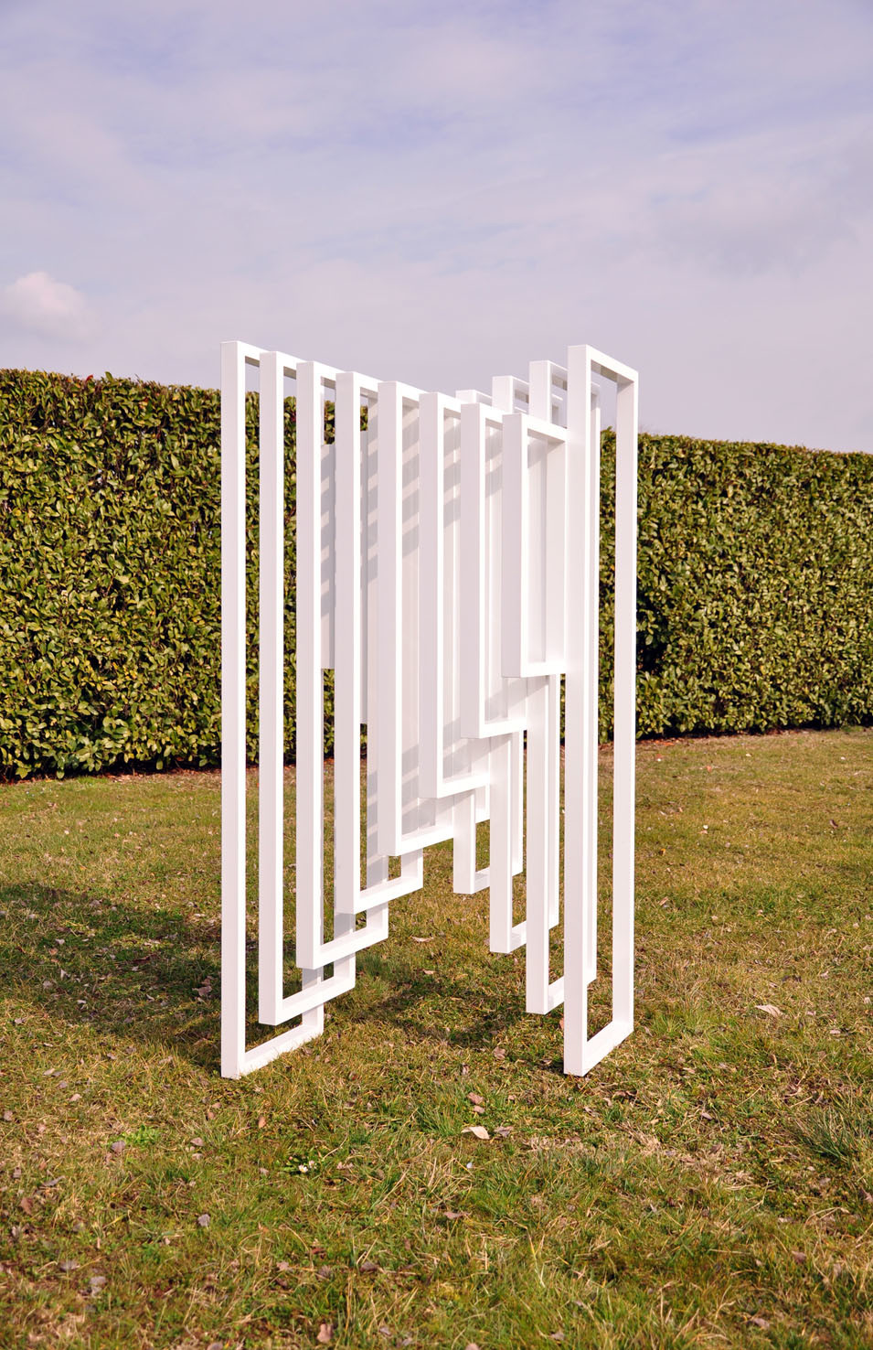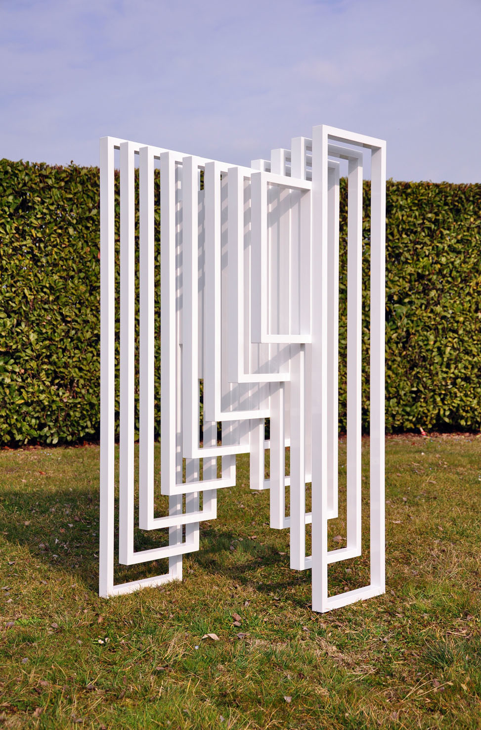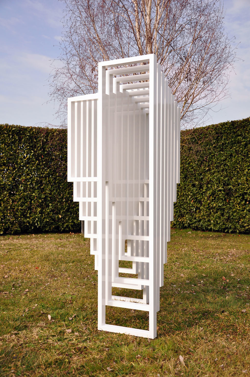 Hidden Steps was created on the concept of the “threshold” and on the mathematical theorem of Euclid, which says: “two parallel lines touch each other only at infinity”. It is a structure made in white thin aluminum frames, assembled together. The form consist in two symmetric abstract and opposite stairs: looking at one you will not see the other. The sculpture plays on full and empty rhythms, creating a dynamic perception of space.