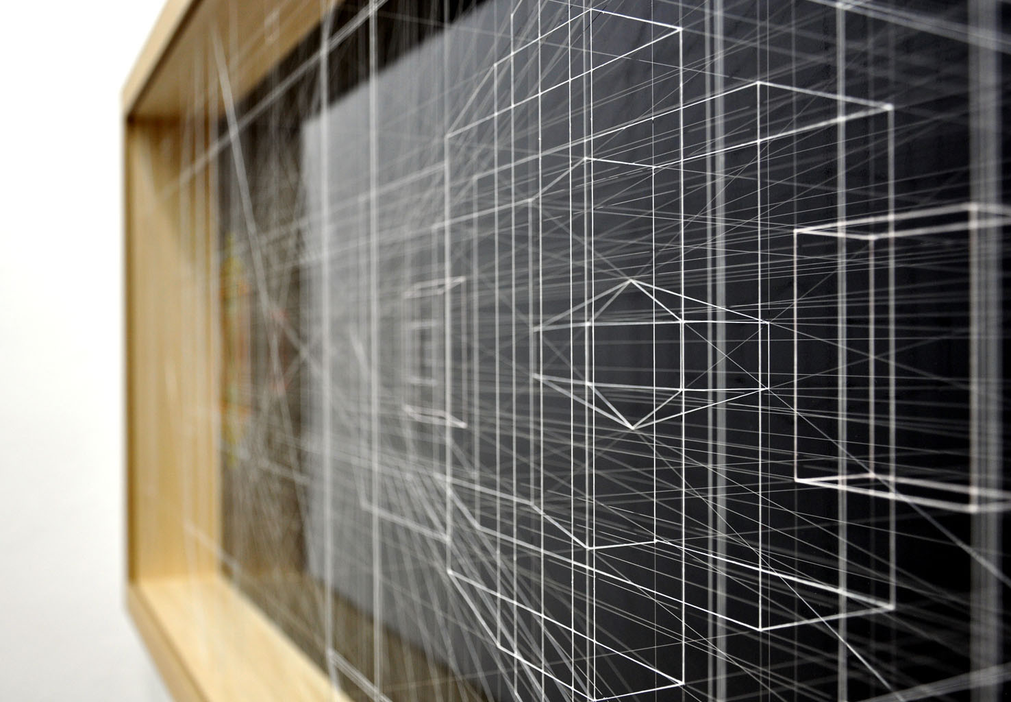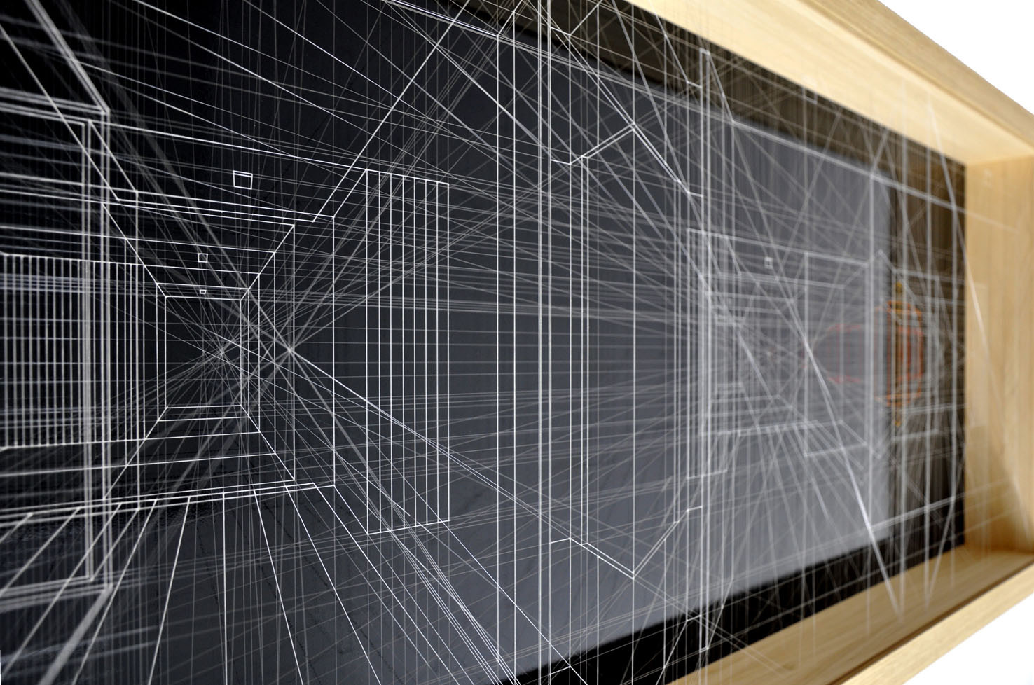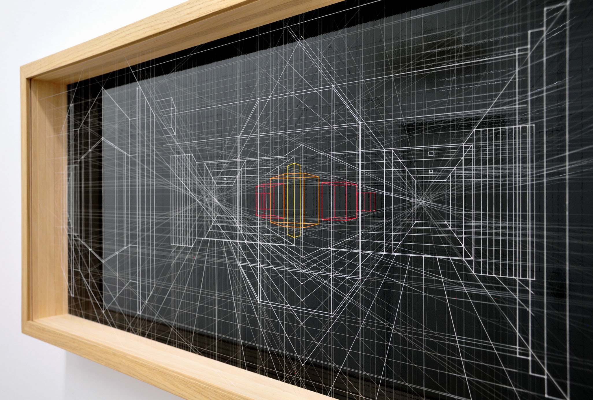 acrylic on fluorocarbon line, wood frame, aluminum background, plexiglas