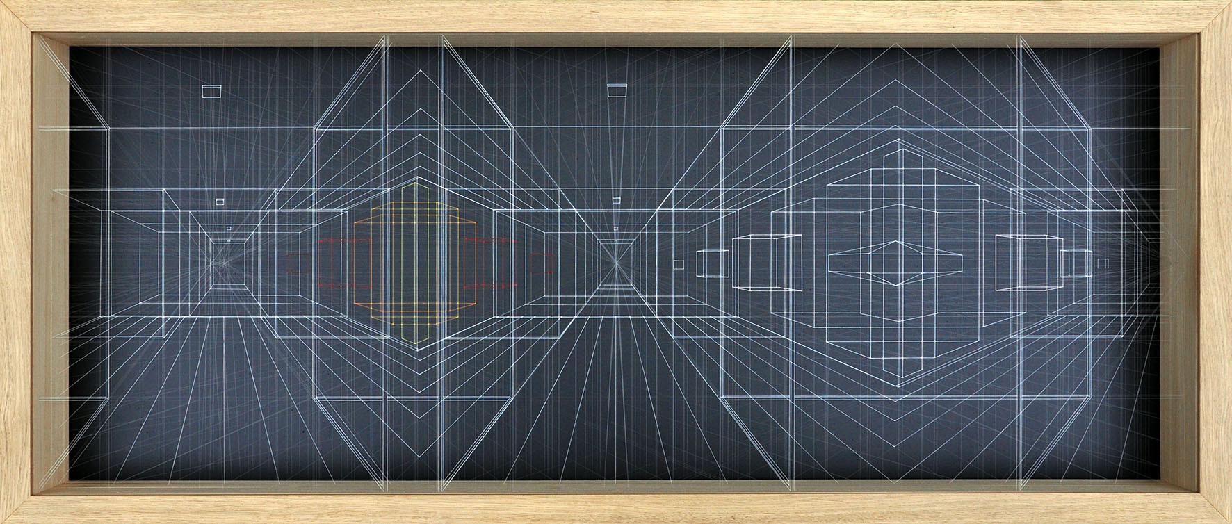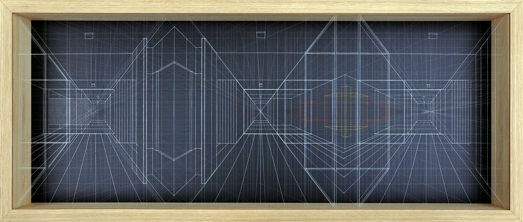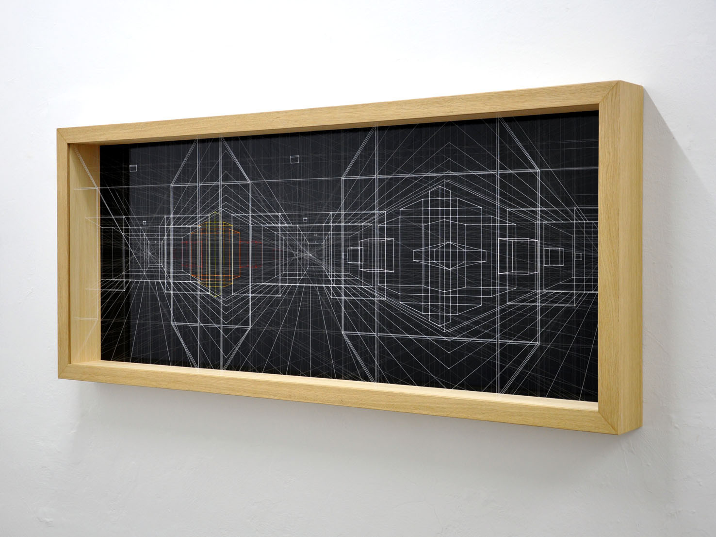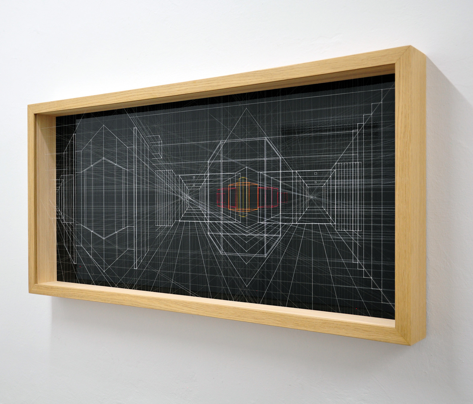 acrylic on fluorocarbon line, wood frame, aluminum background, plexiglas