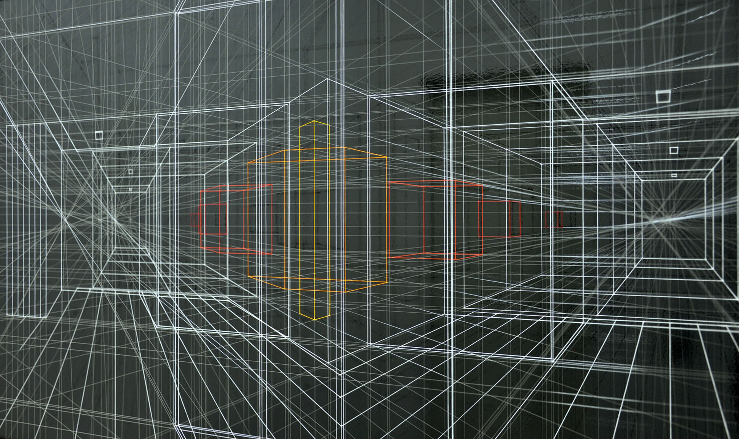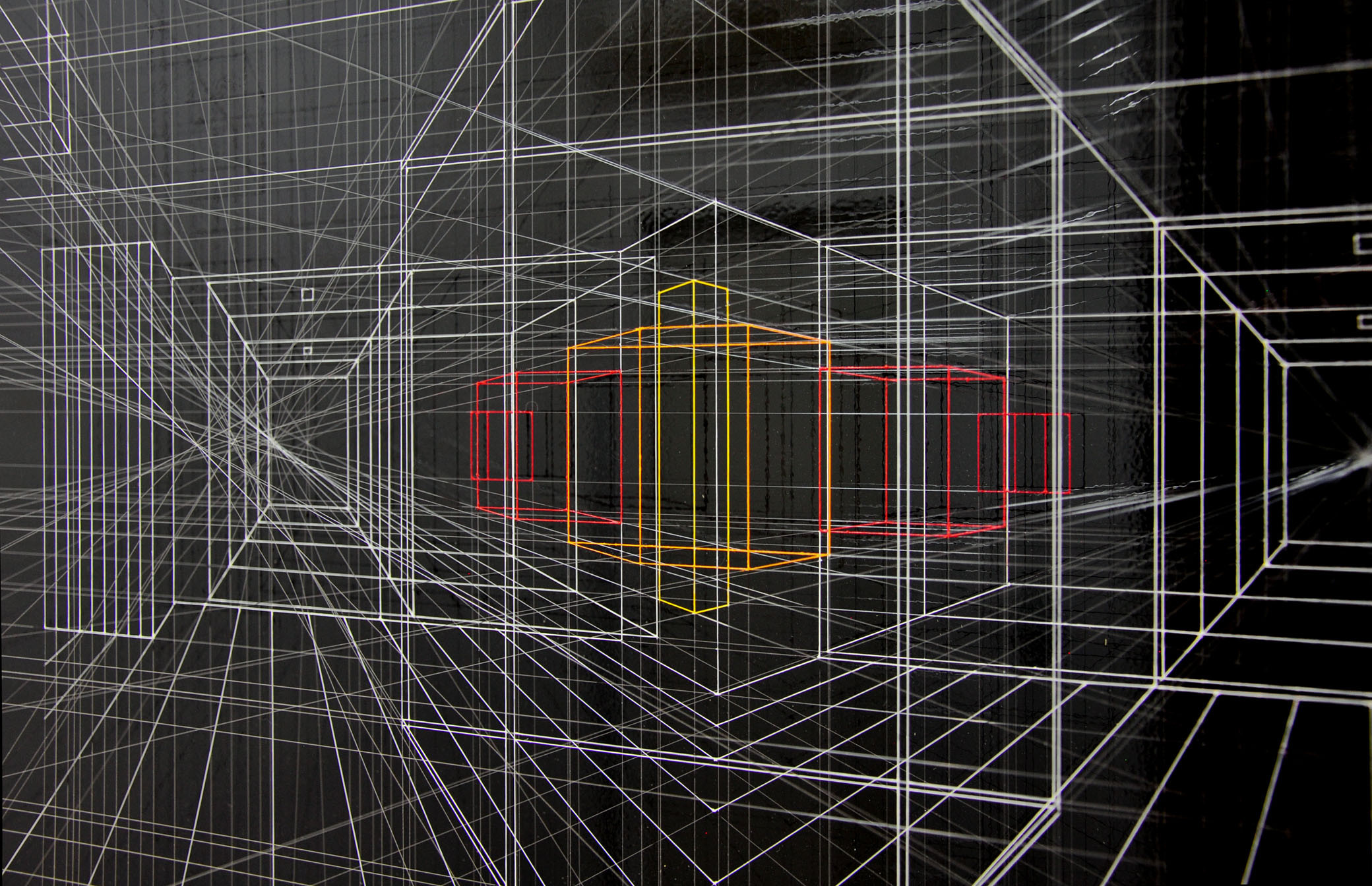 Continuous City is a sophisticated three-dimensional drawing made with thin and transparent fluorocarbon threads, painted and fixed on various overlapping frames.It present hypothetical urban and architectural spaces, such as limbo, metaphysical spaces, abstractions, liminary spaces.