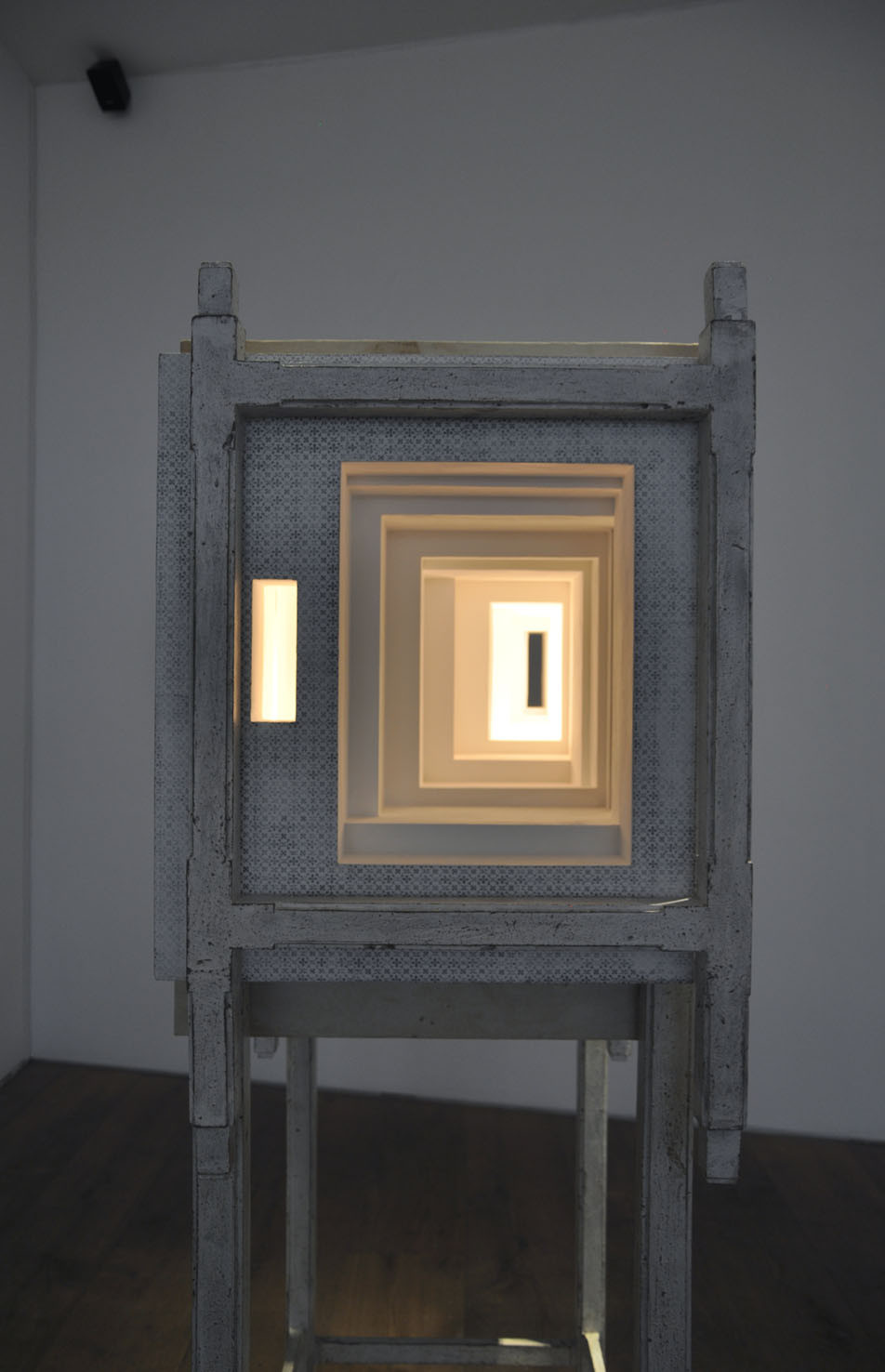 Cardboard, paper, acrylic, earth, texile, lights with timer
