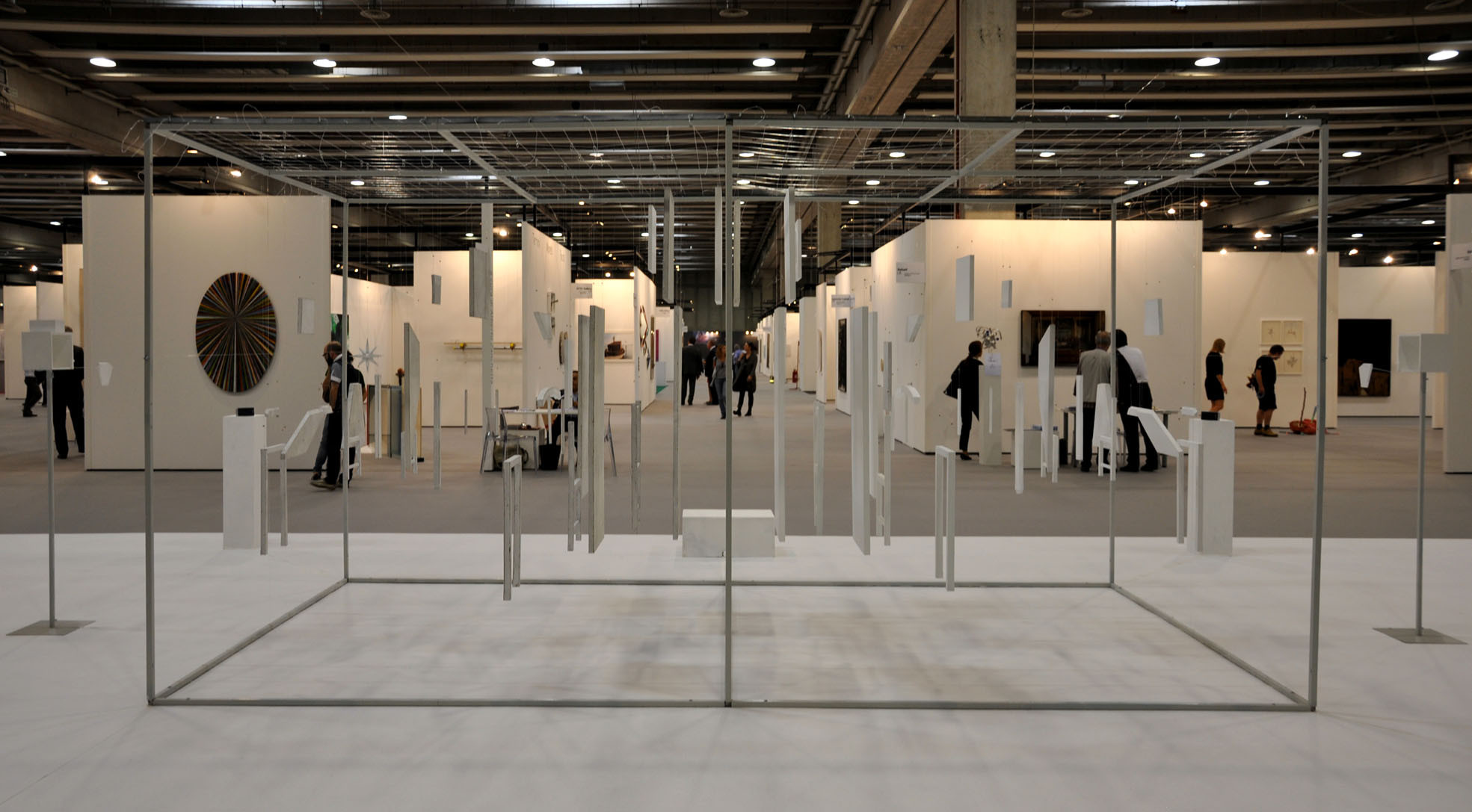 Within a thin metal structure, several geometric solids are suspended and distributed in the space without any apparent logical order, but if they are viewed from a single established point of view, these objects form a furnished and recomposed room.It represents the order of things, beyond which the viewer perceives only a chaotic set of elements in the space.