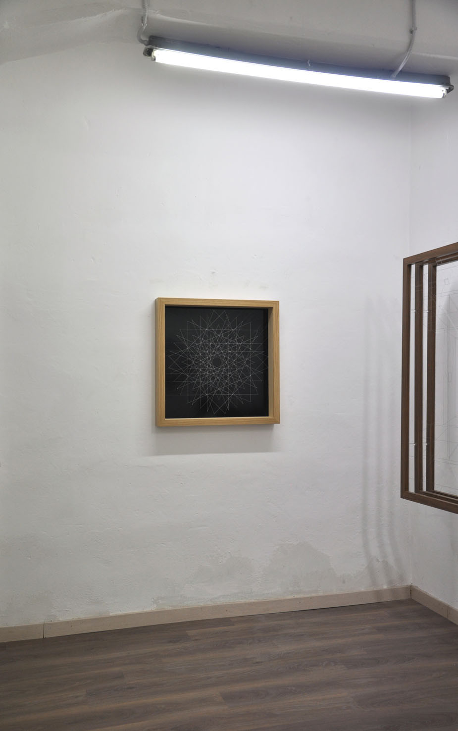 acrylic on nylon line, wood frame, metal background, plexiglas