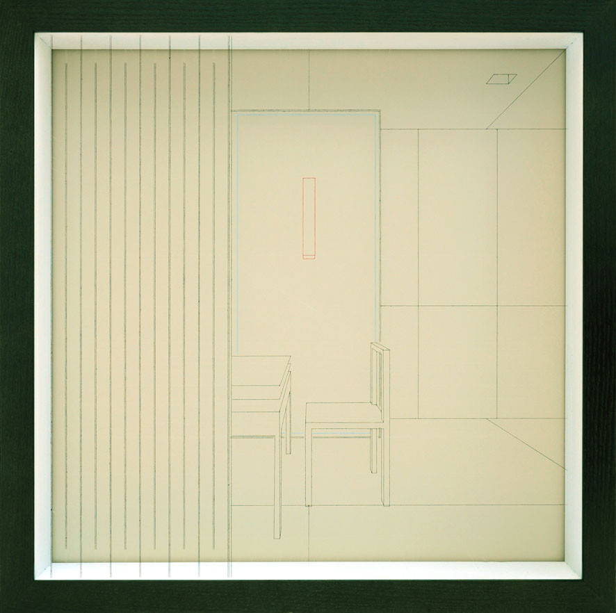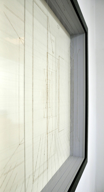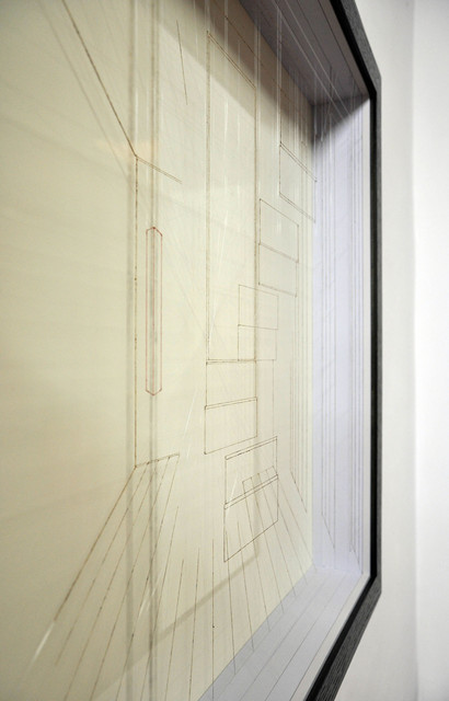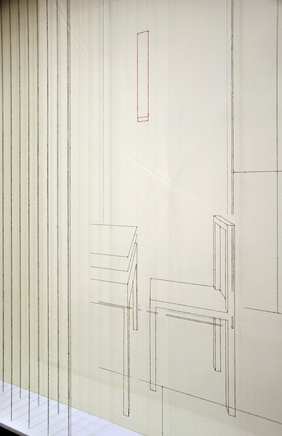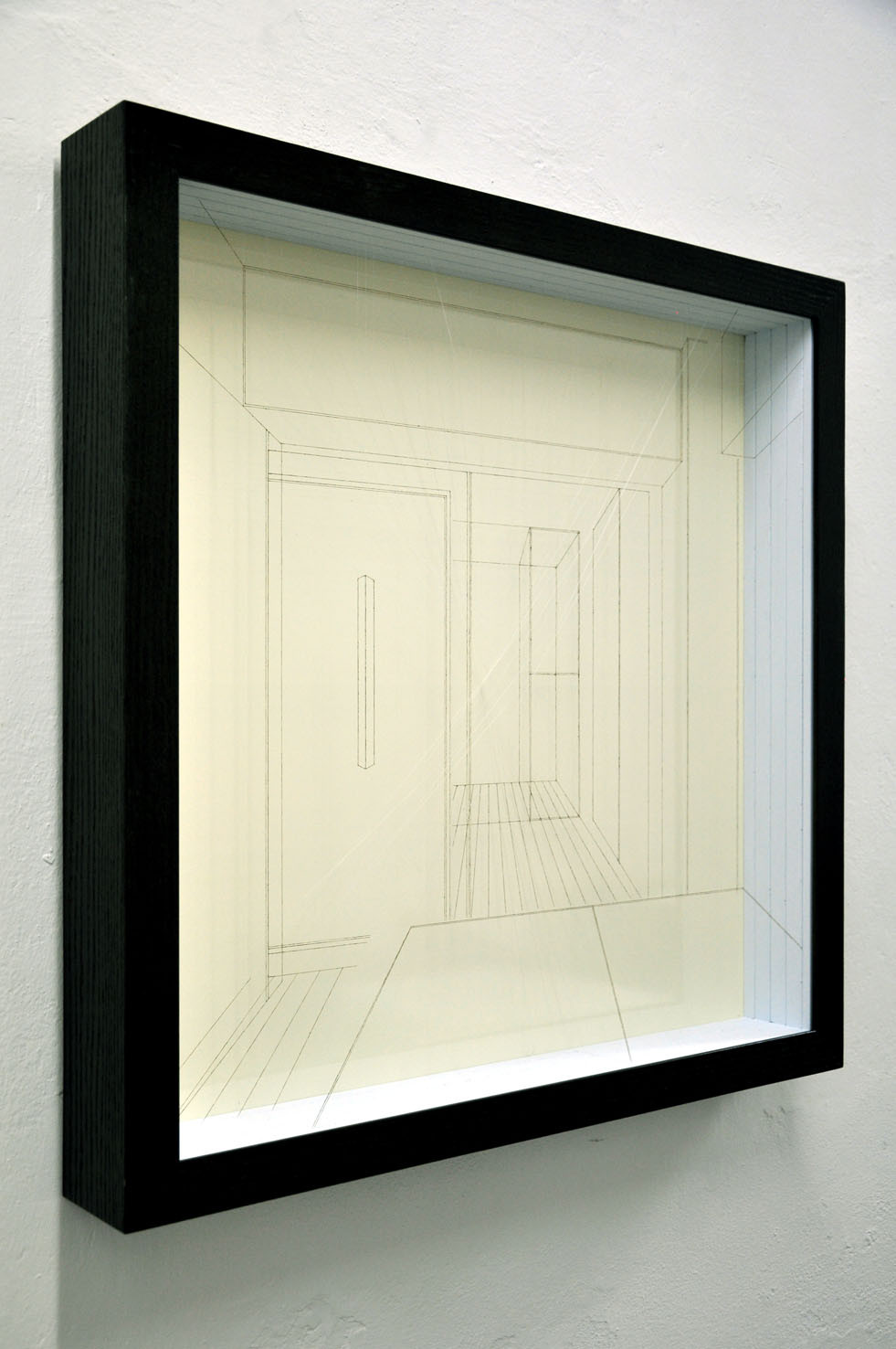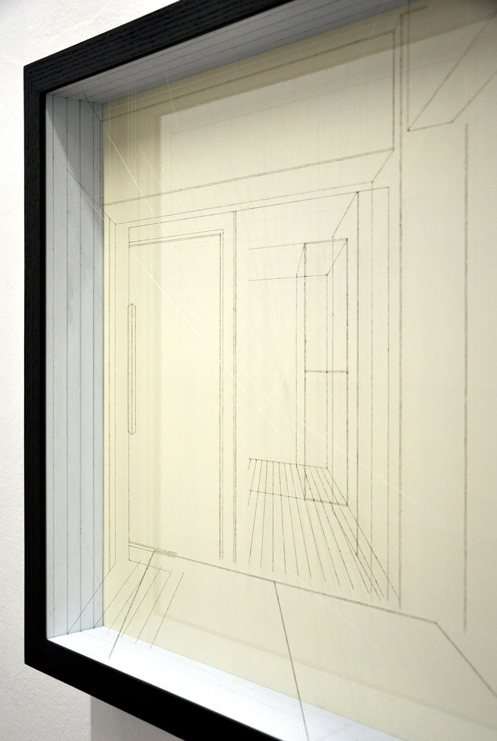 acrylic on fluorocarbon line, wood frame, metal background, plexiglas