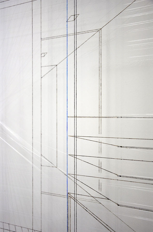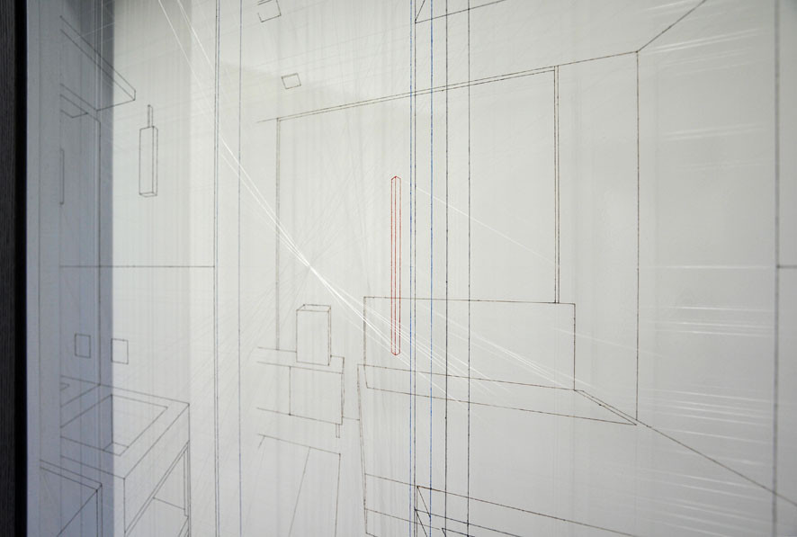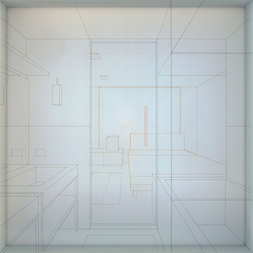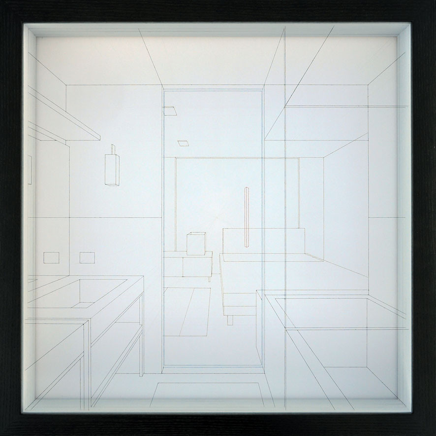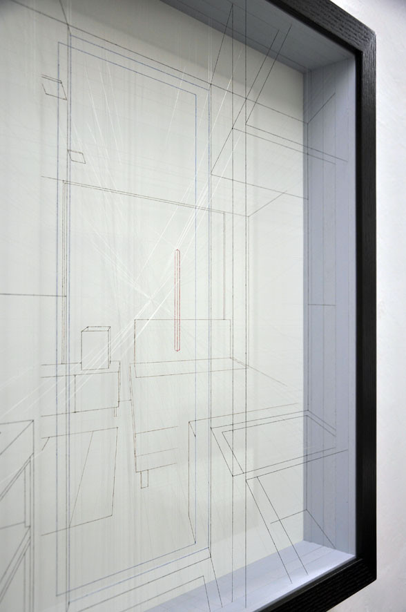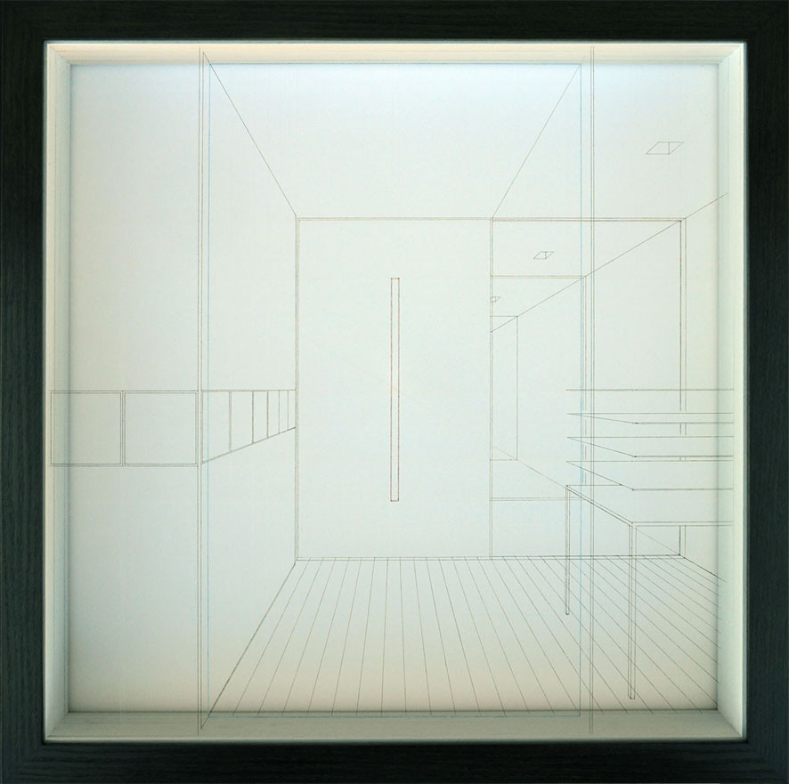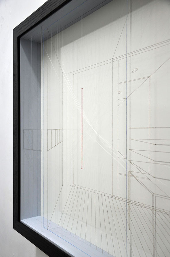 Acrylic on fluorocarbon thread, wood frame, aluminum background, plexiglas