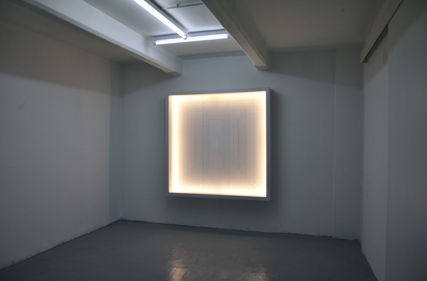 Enamel on fluorocarbon line, wooden box, LED light system, plexiglas