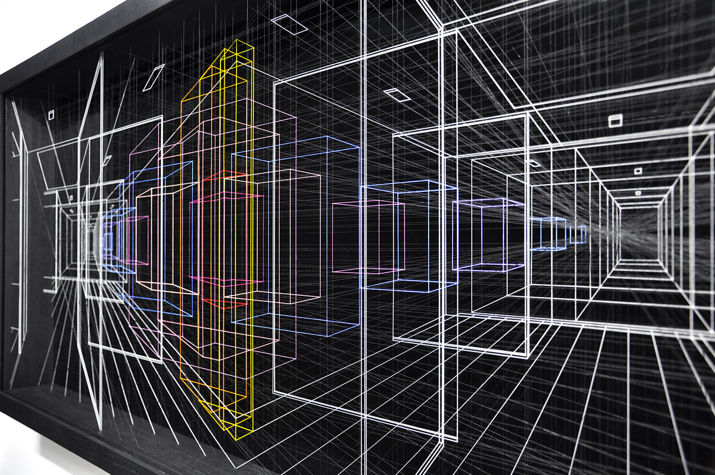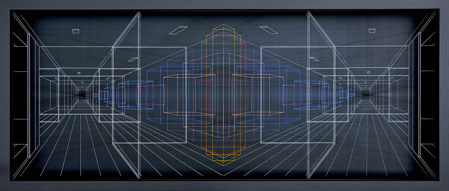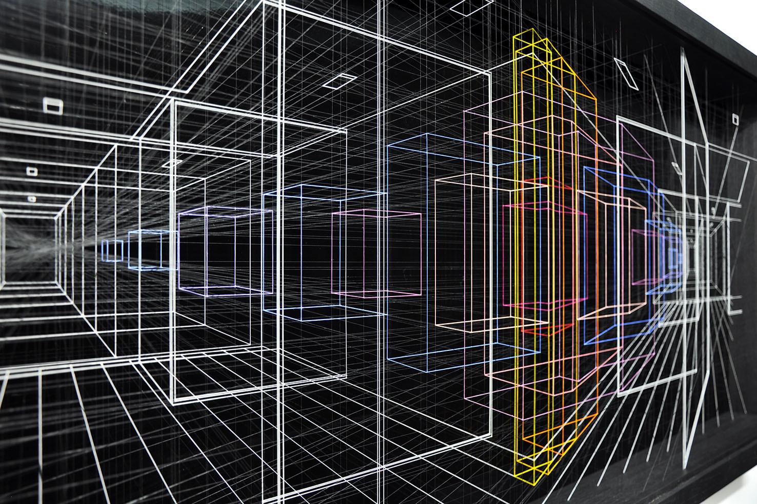 enamel and acrylic on fluorocarbon thread, wood frame, aluminium background, Museum Glass