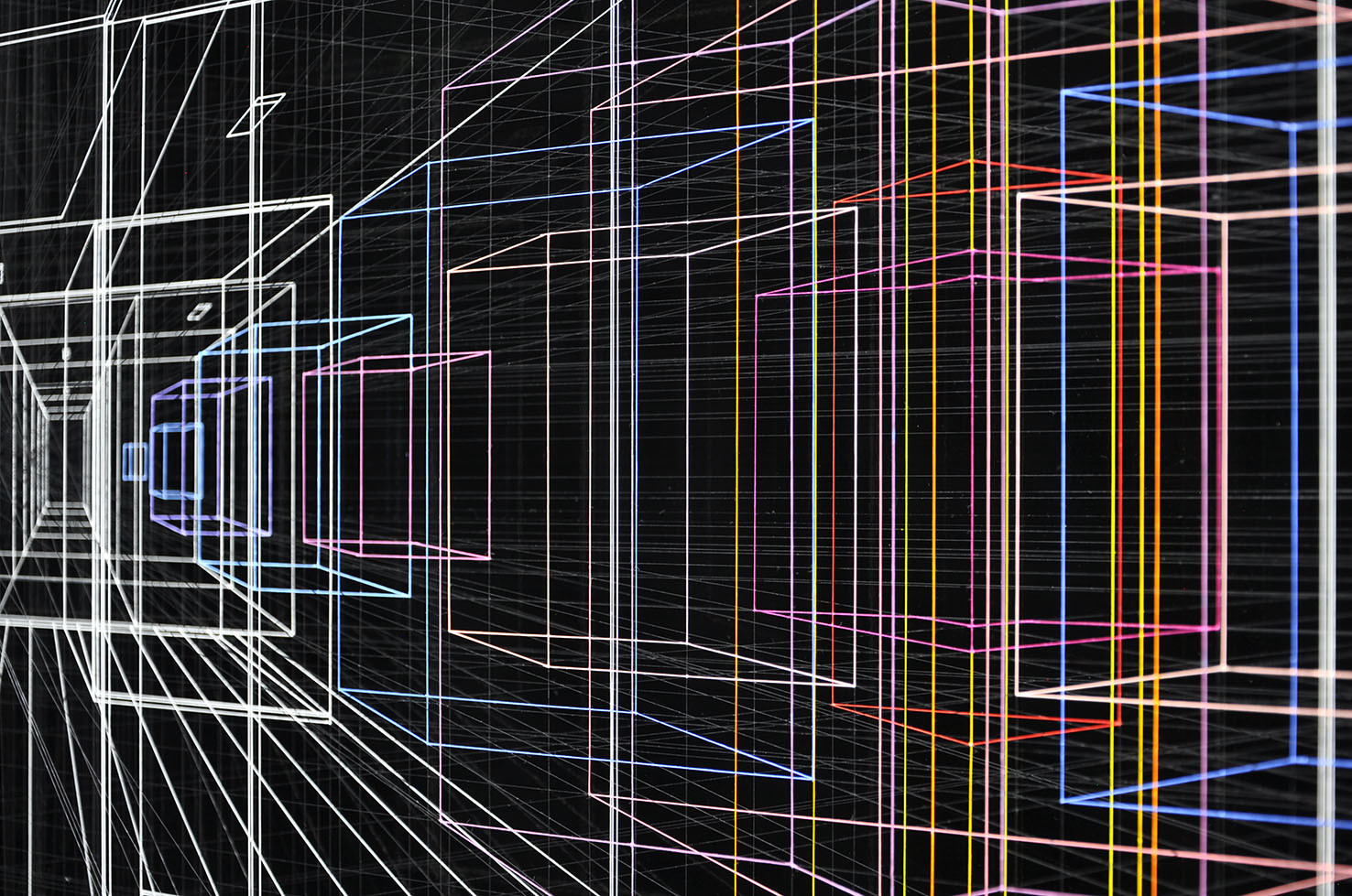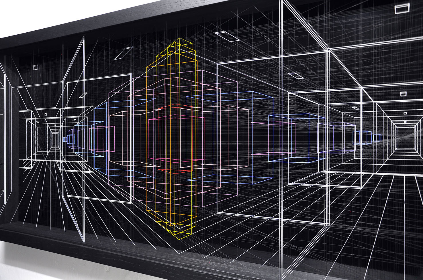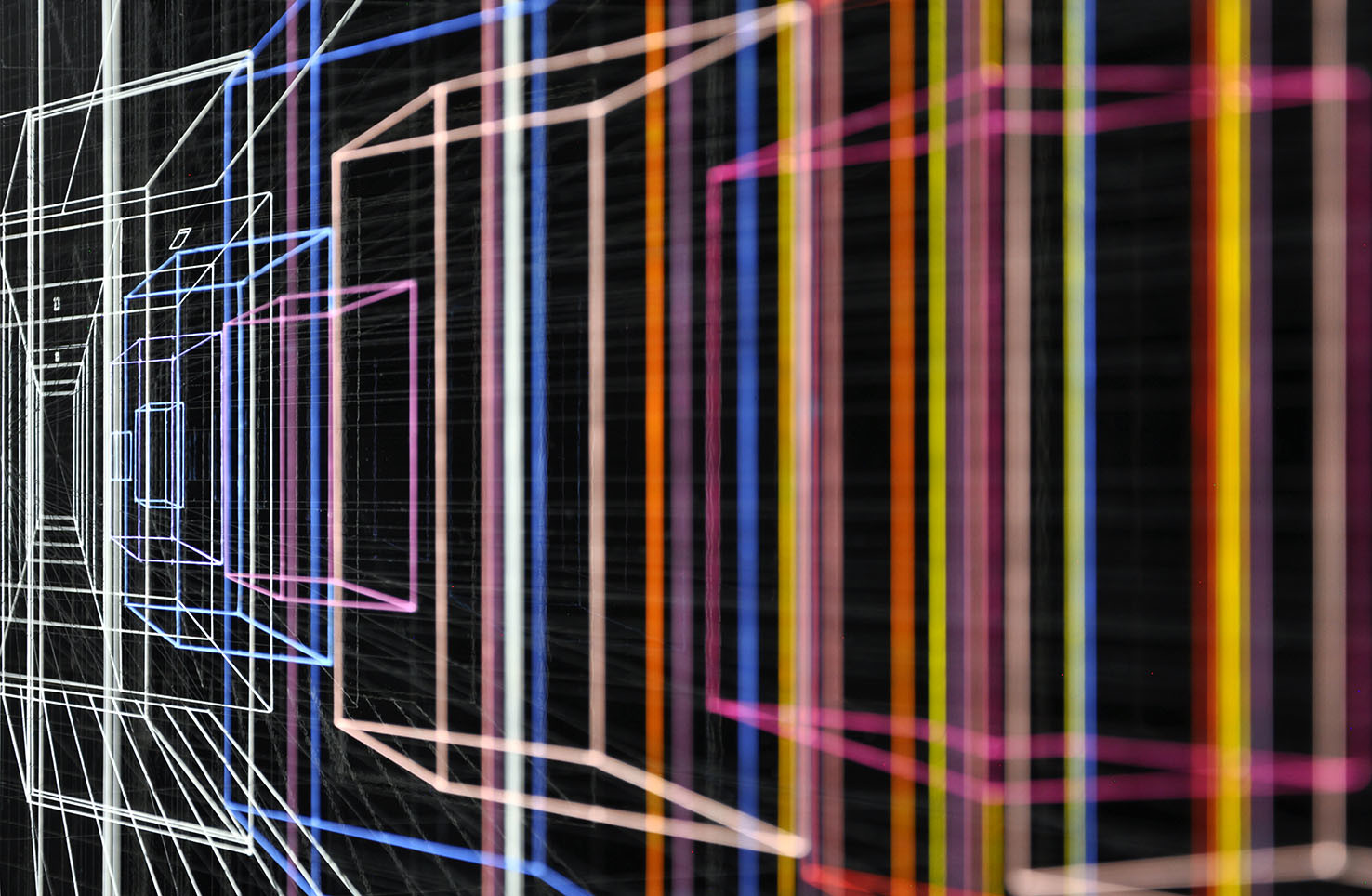 enamel and acrylic on fluorocarbon thread, wood frame, aluminium background, Museum Glass