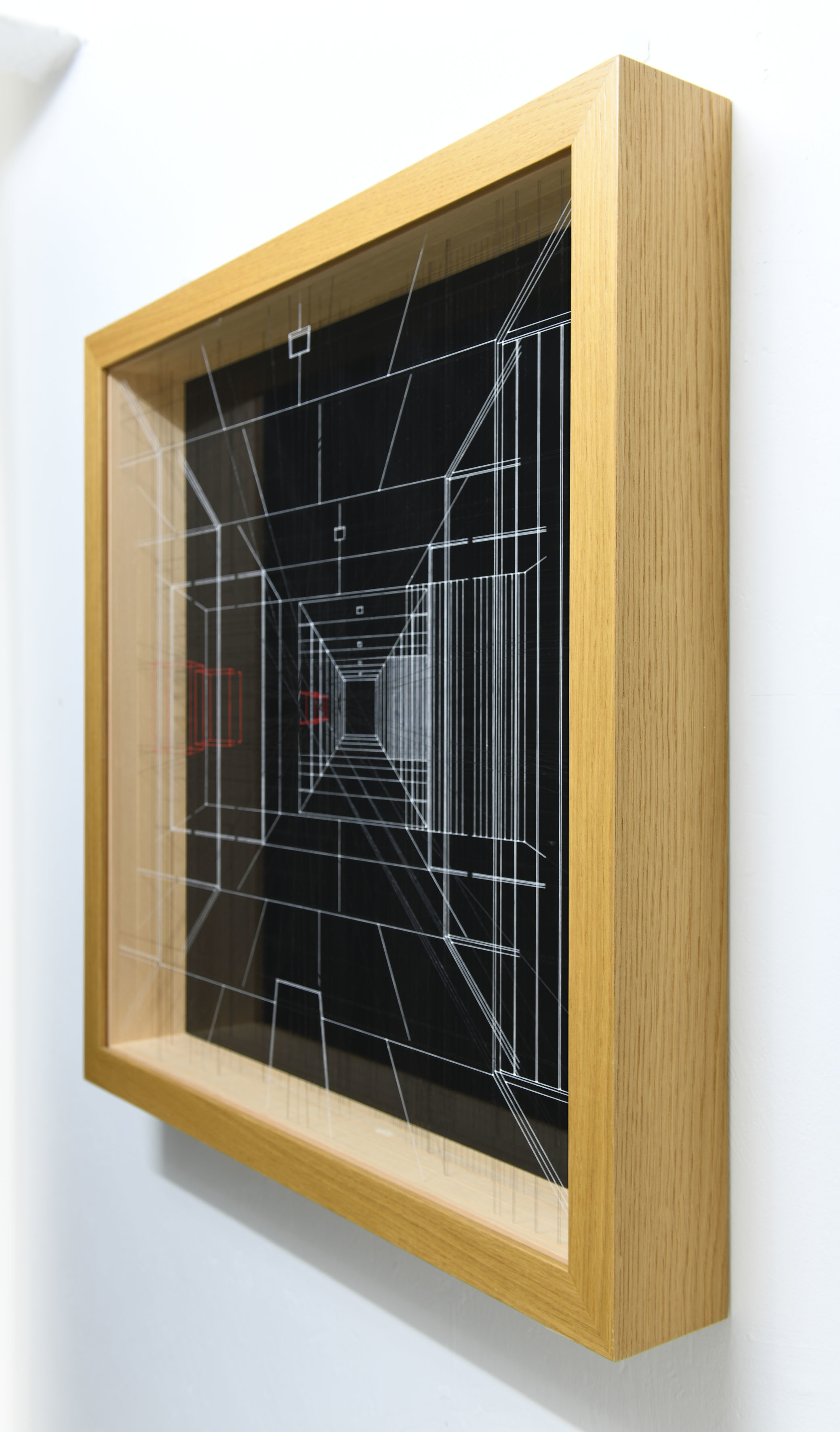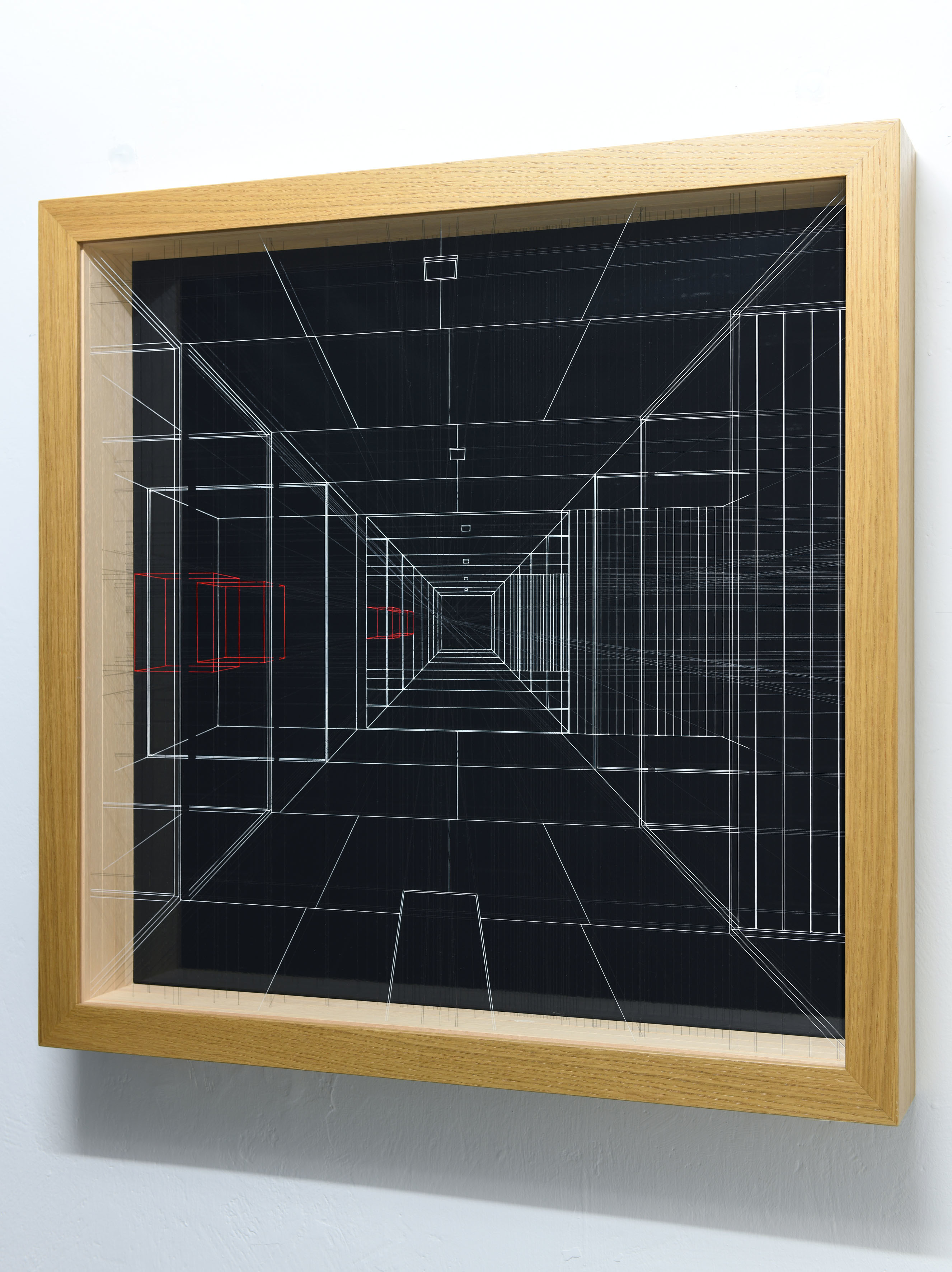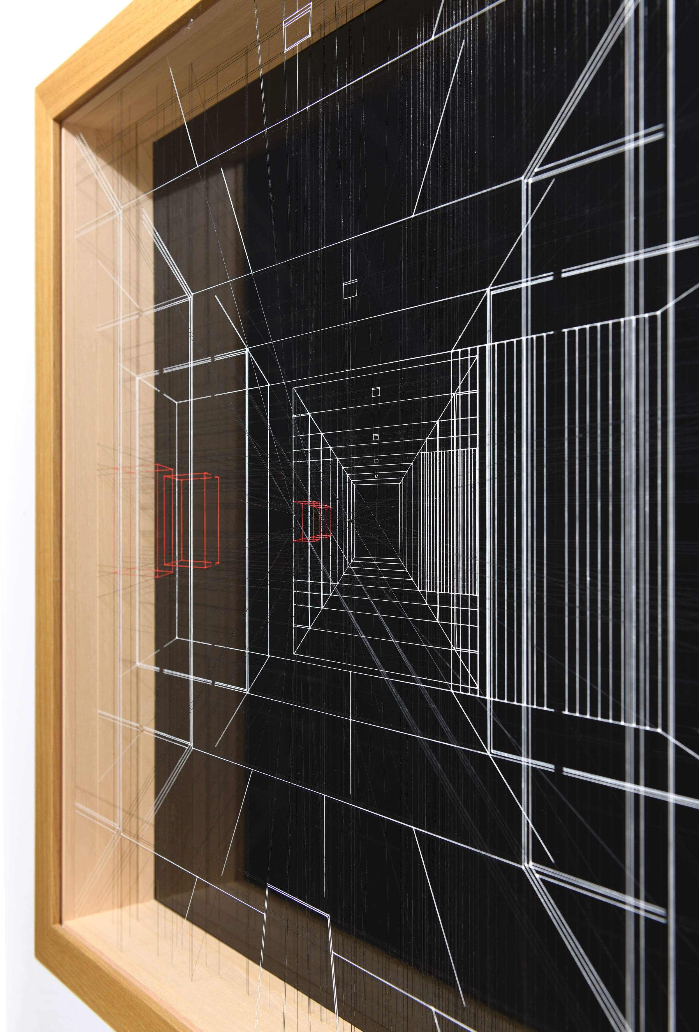 Enamel and acrylic on fluorocarbon thread, wood frame, painted steel background, external protective plexiglas