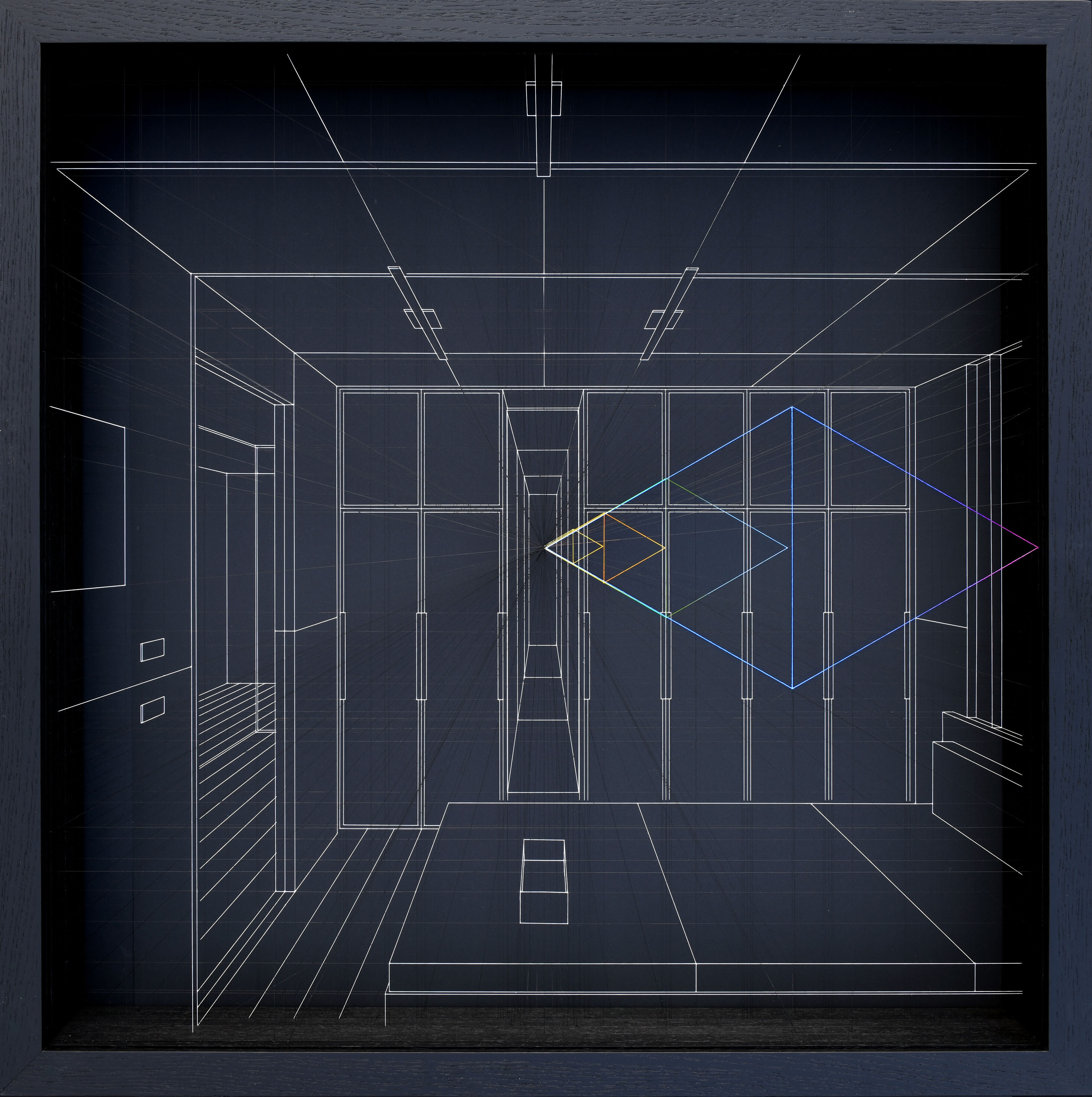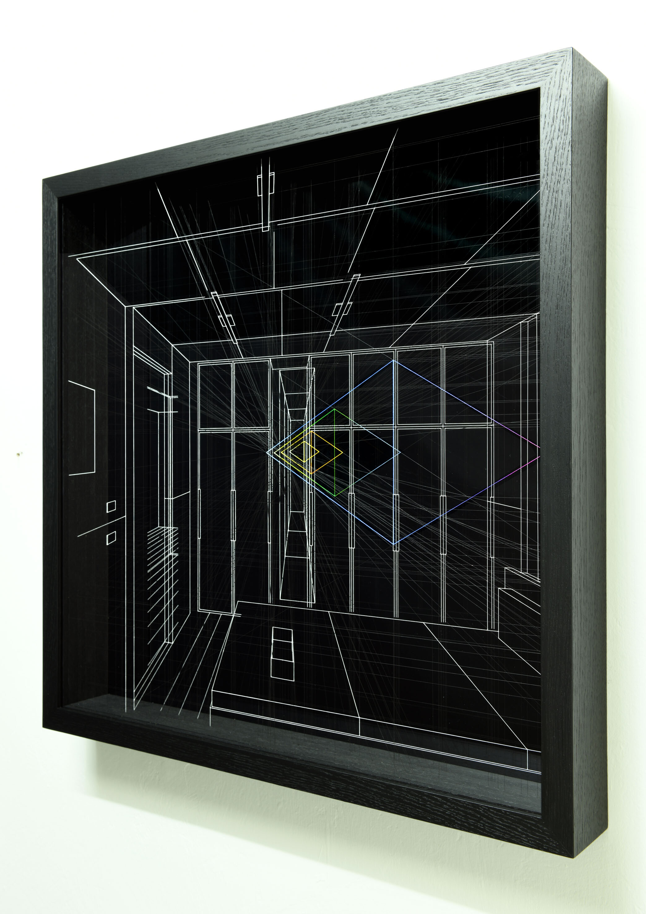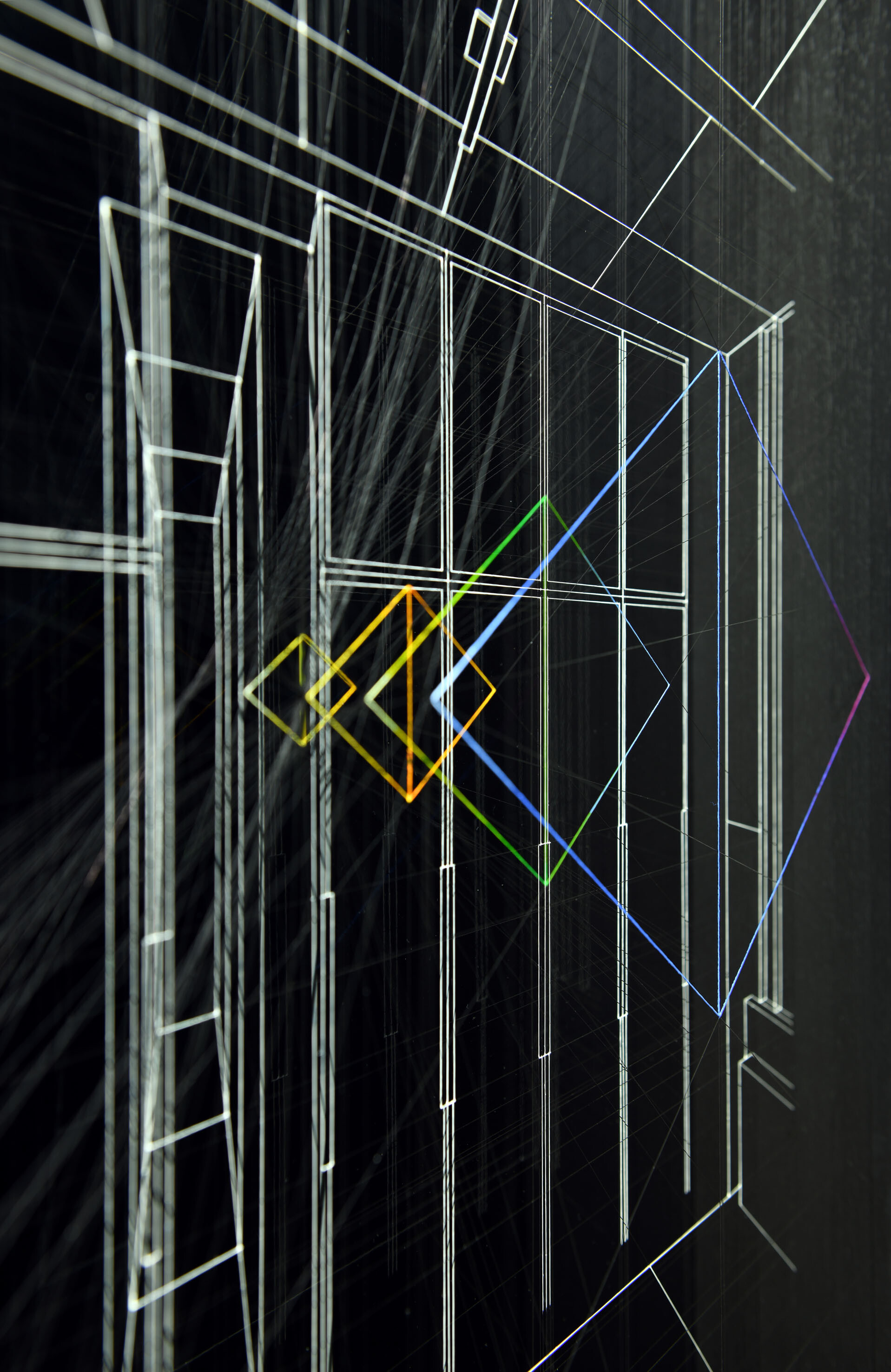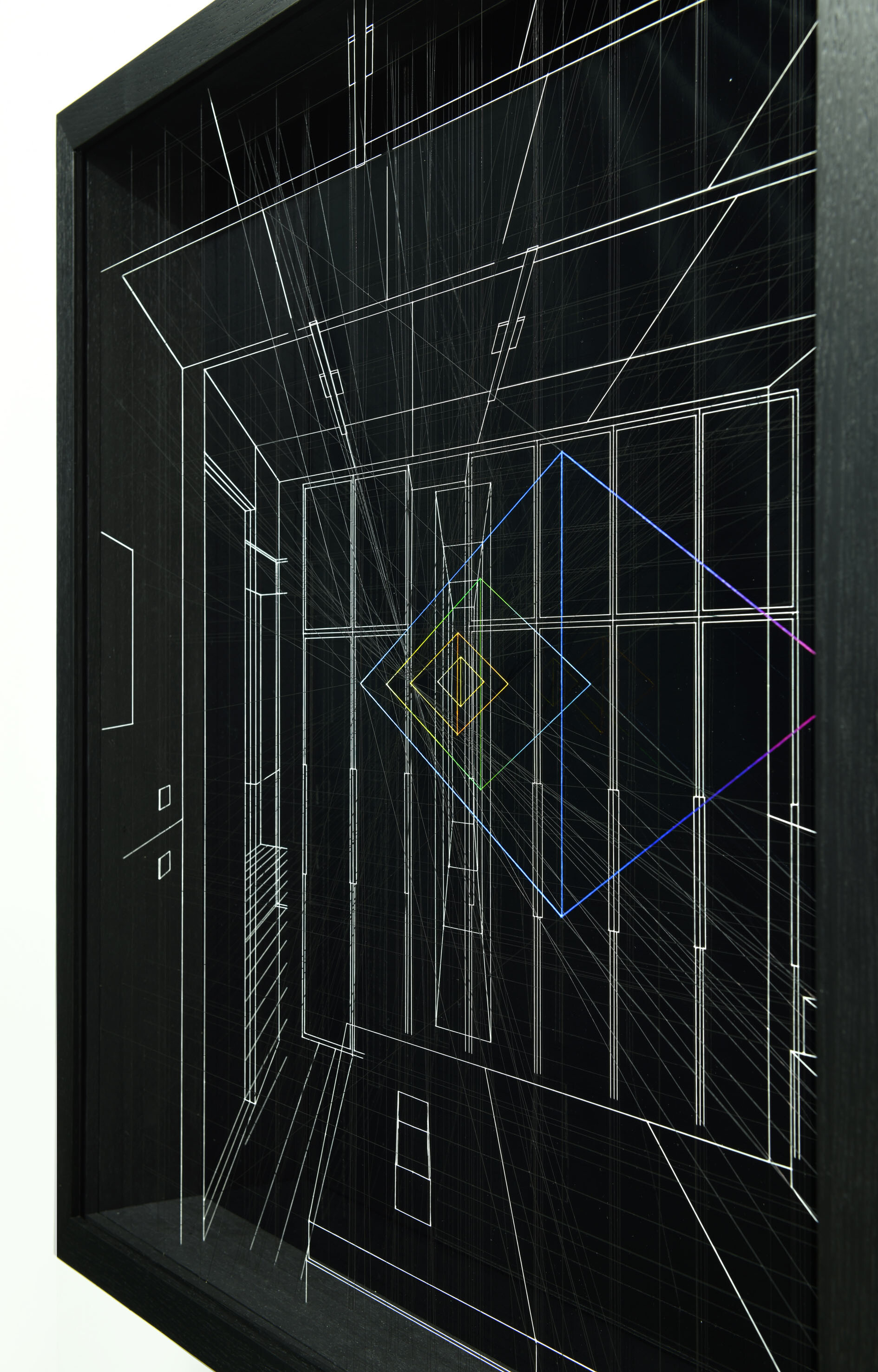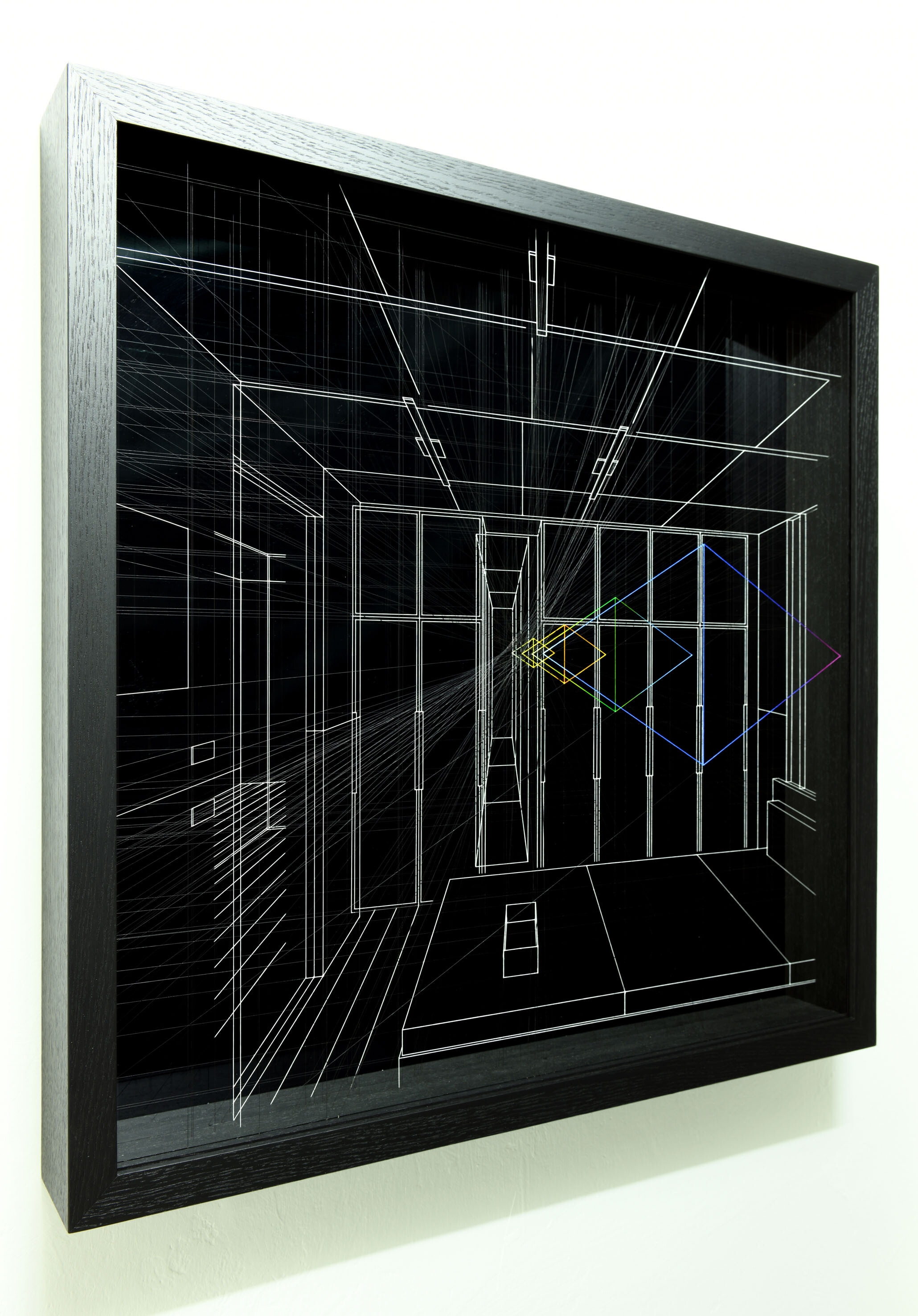 Smalto e acrilico su filo in fluorocarbonio, cornice esterna e telia interni in legno laccato nero, fondo in laminato nero specchiante, vetro museale protettivo esterno
