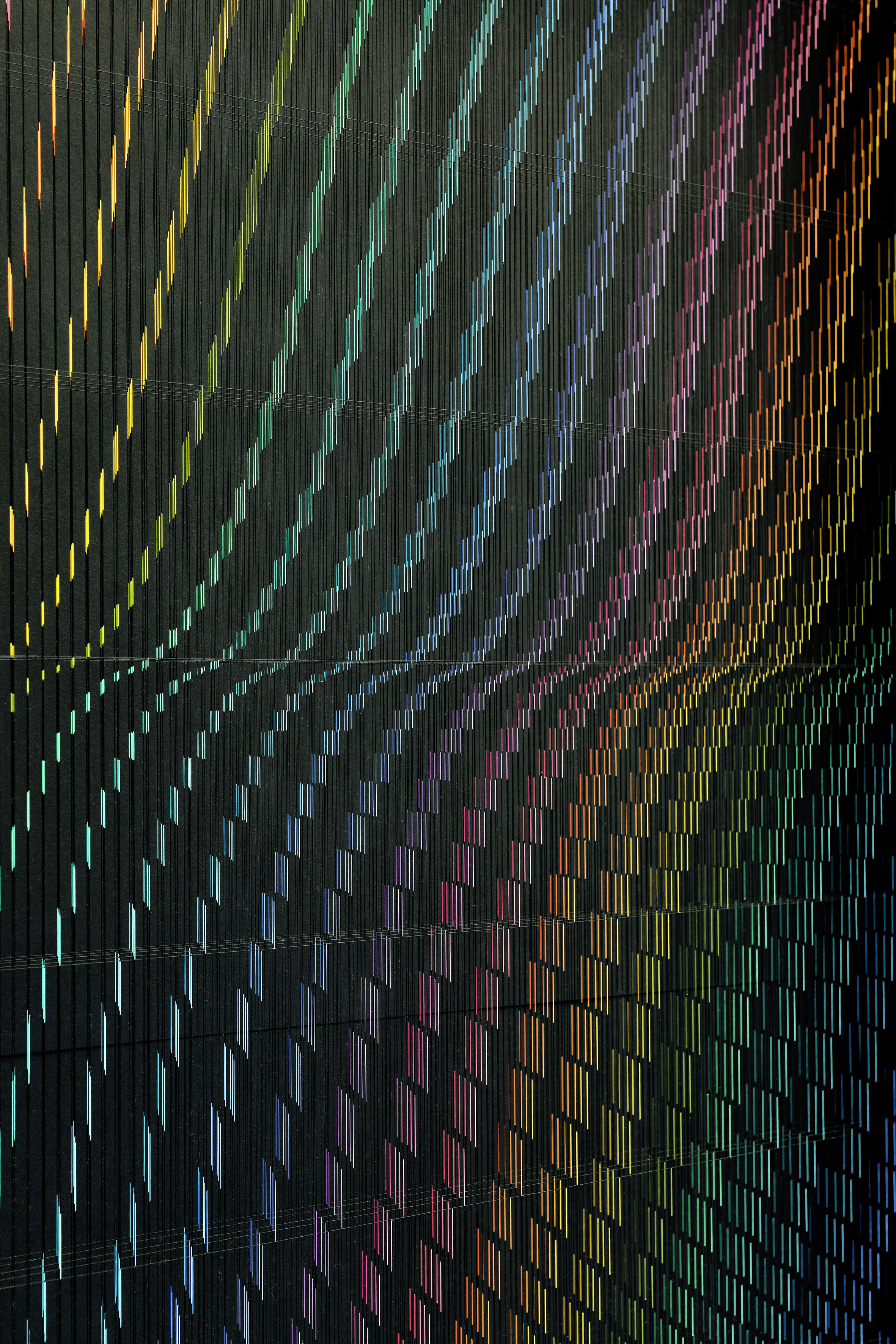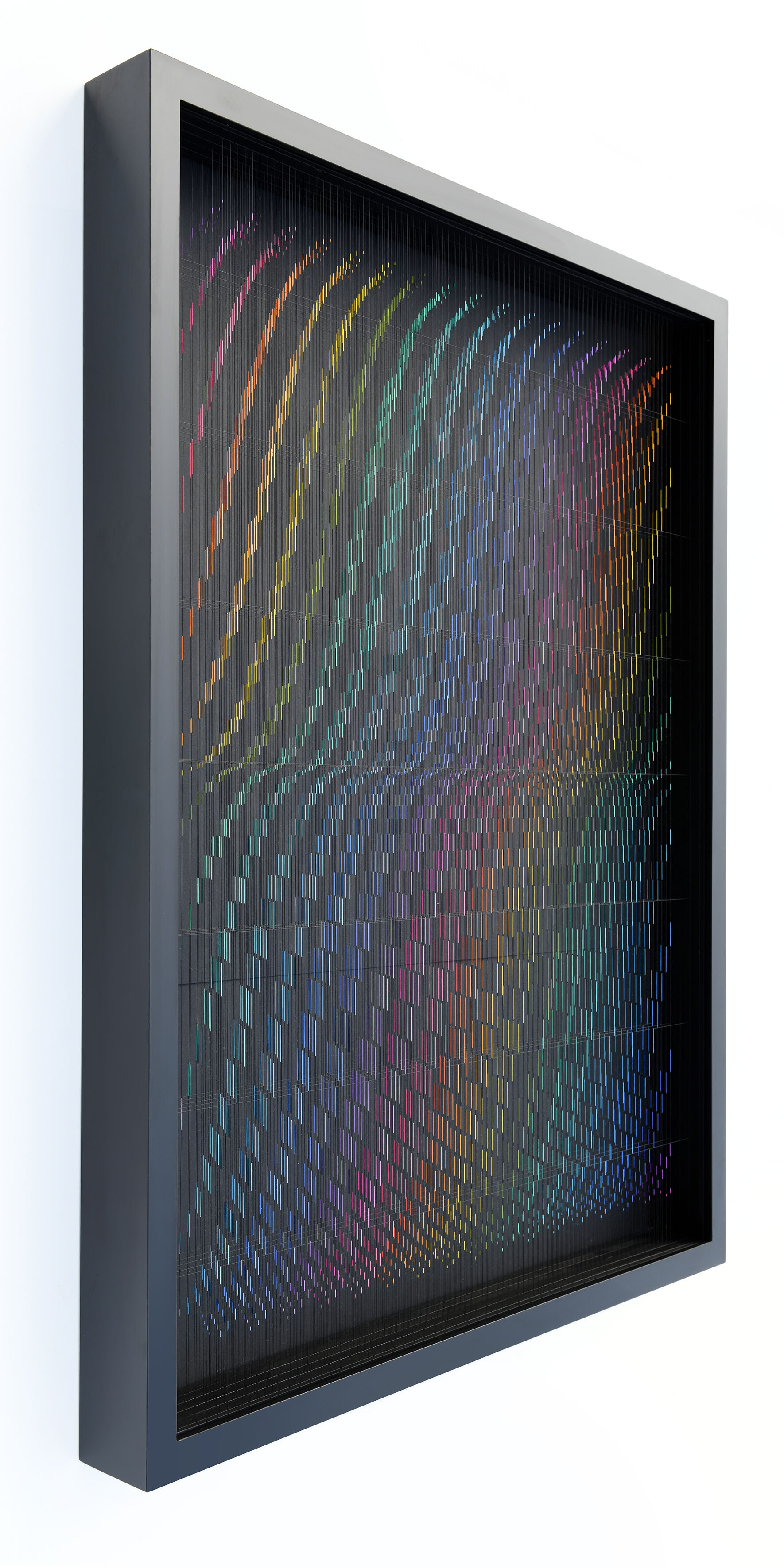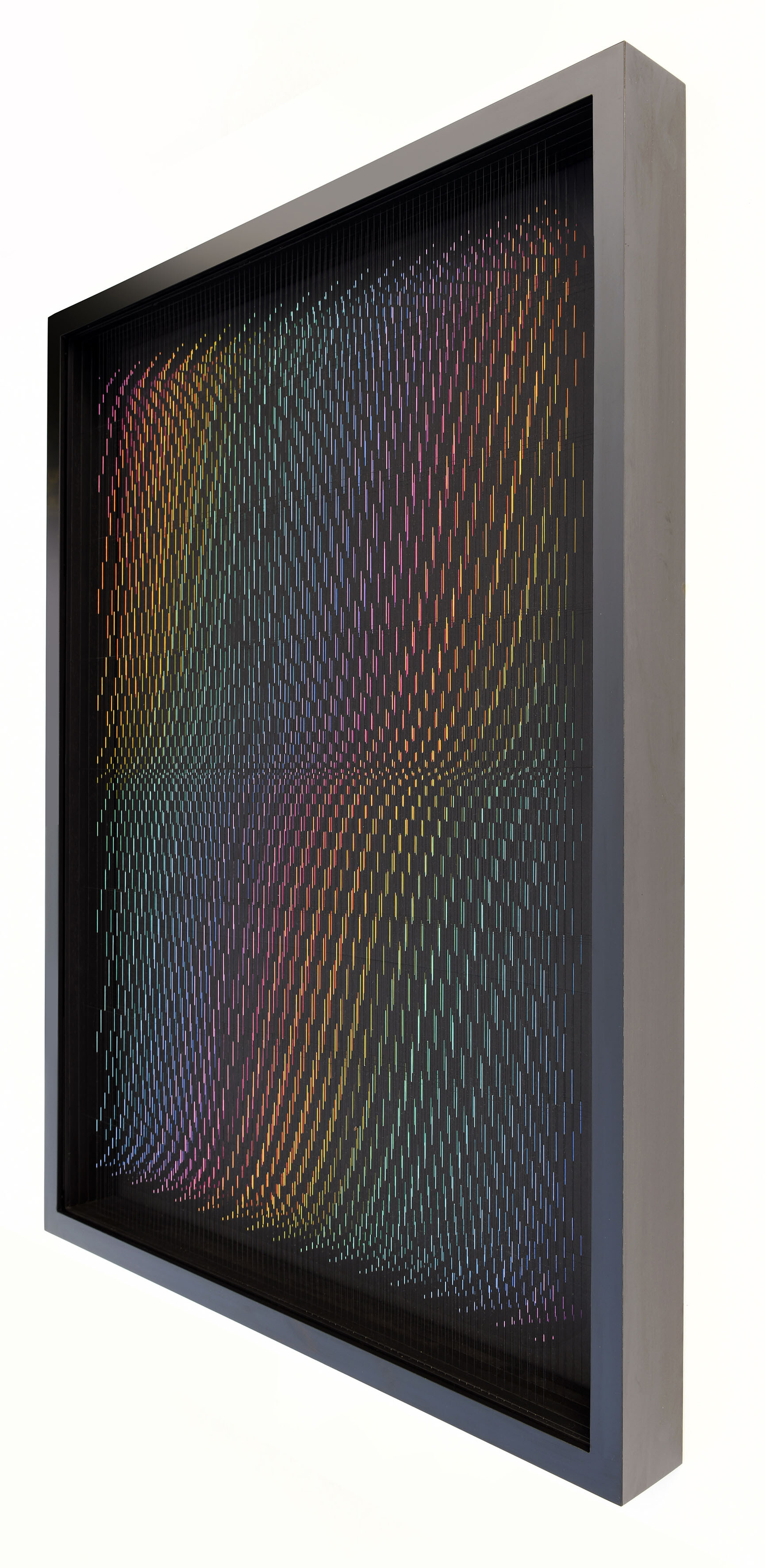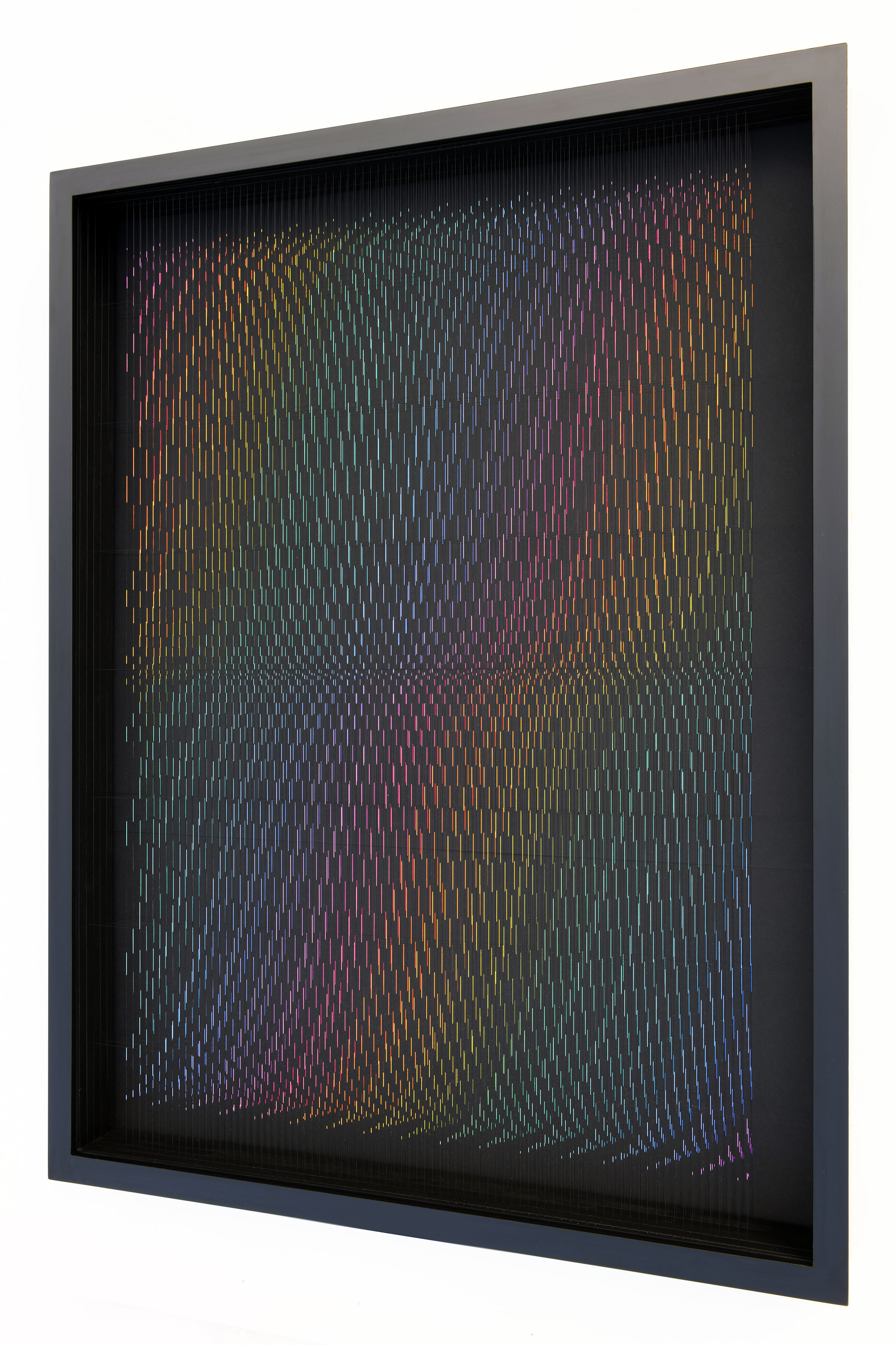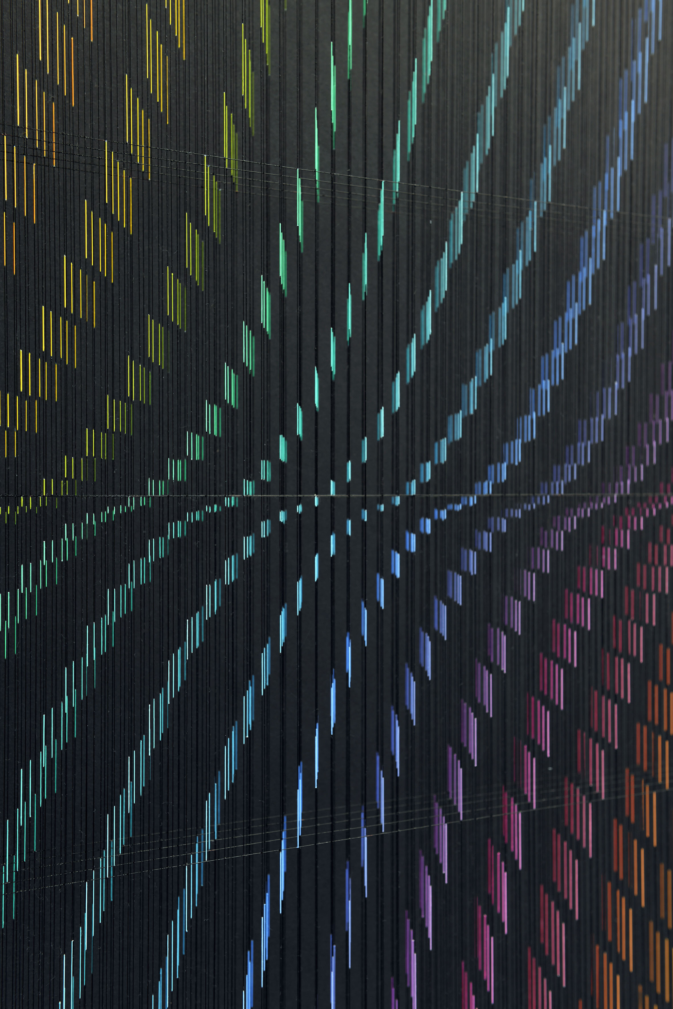 Enamel and acrylic on fluorocarbon thread, frame in wood and glossy black laminate, internal frames in lacquered wood and steel, painted aluminum background, Museum Glass
