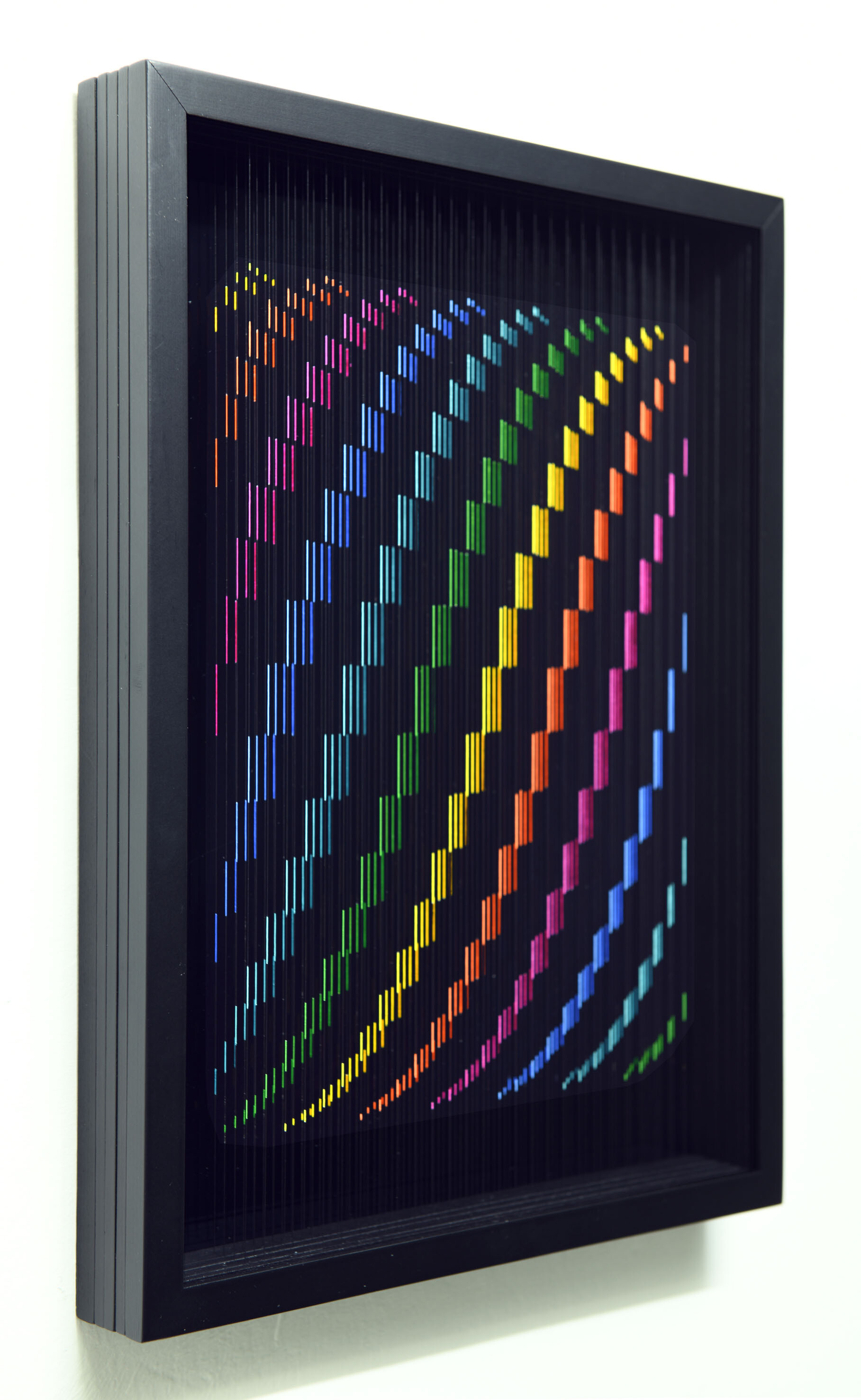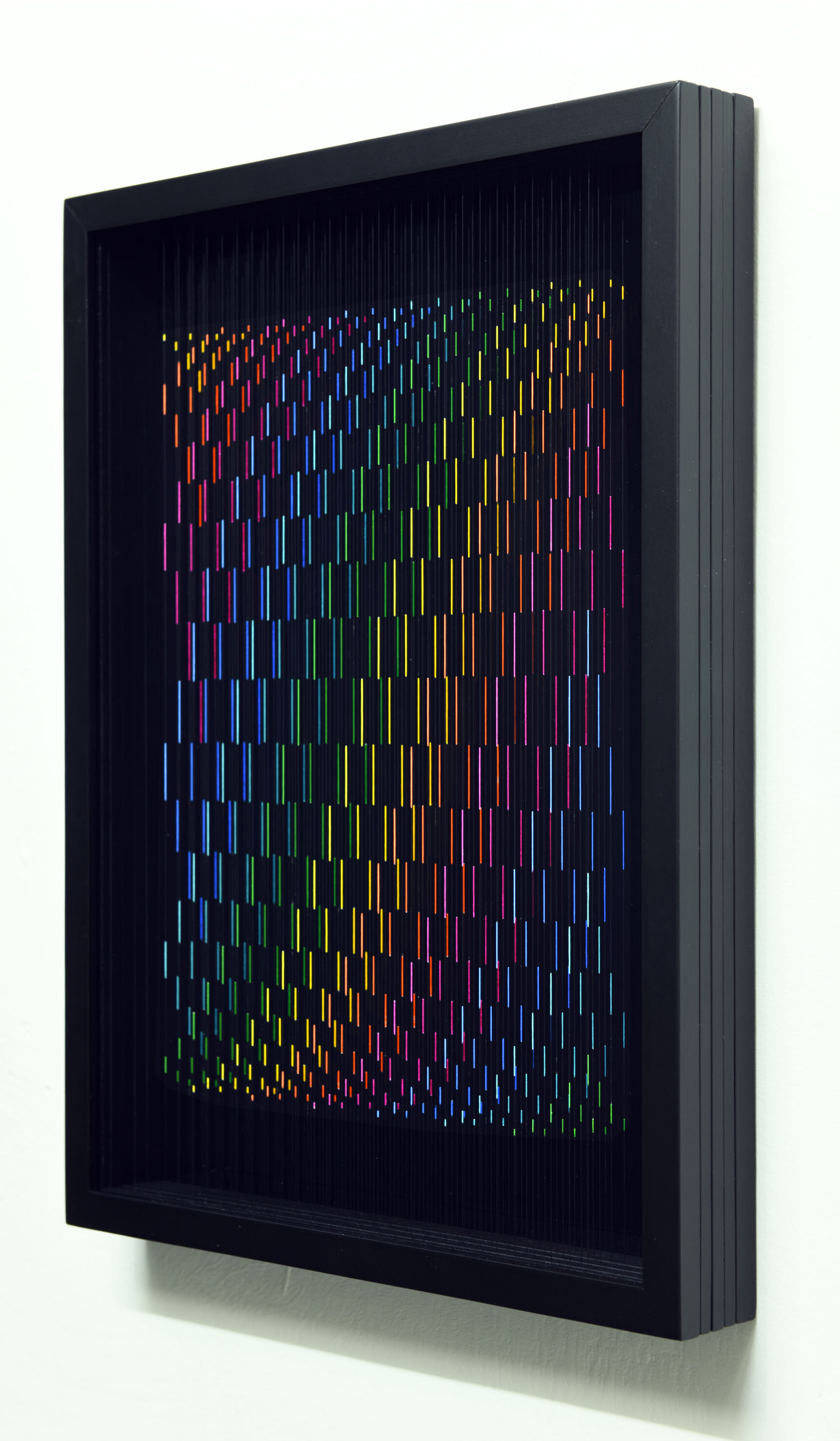 Enamel and acrylic on fluorocarbon thread, wooden frame, glossy black laminate background, museum glass