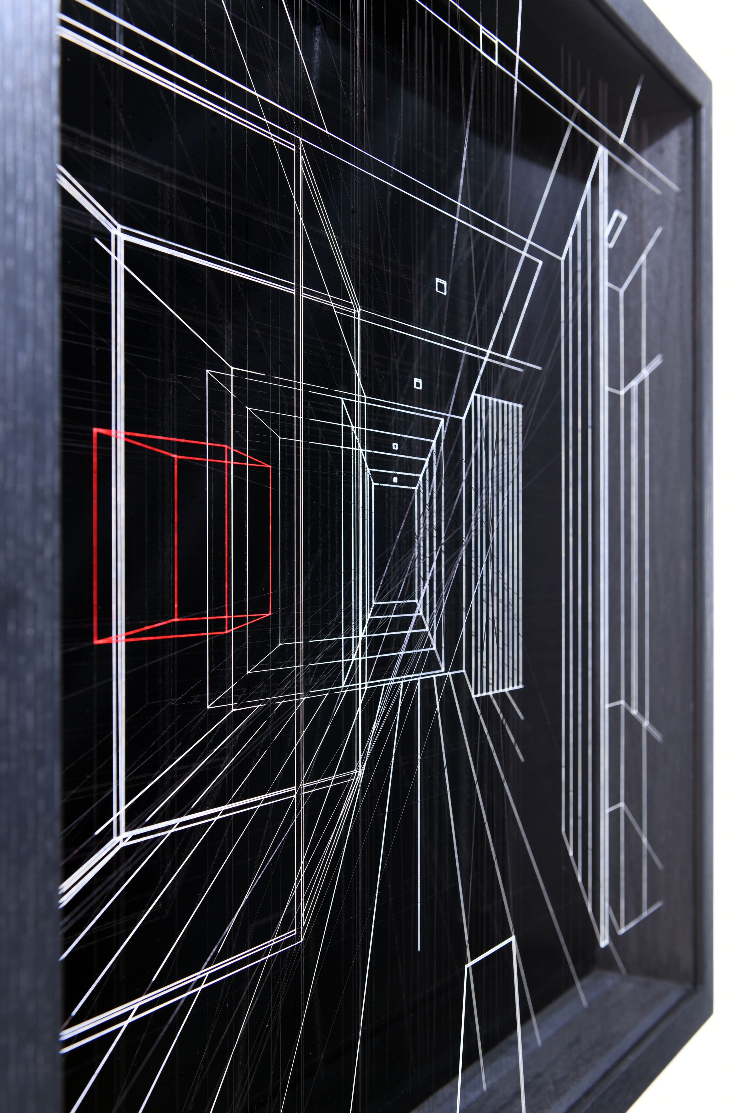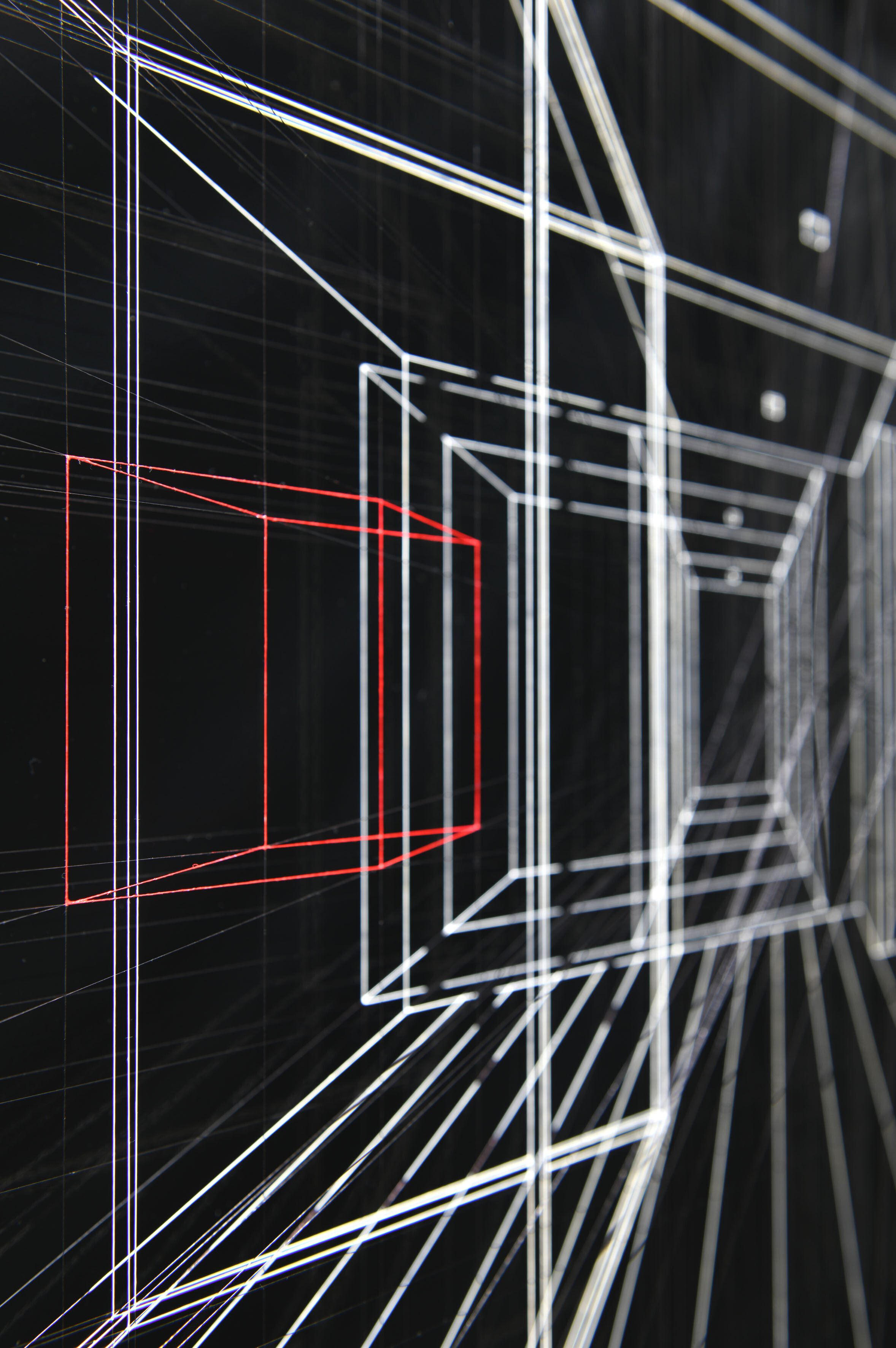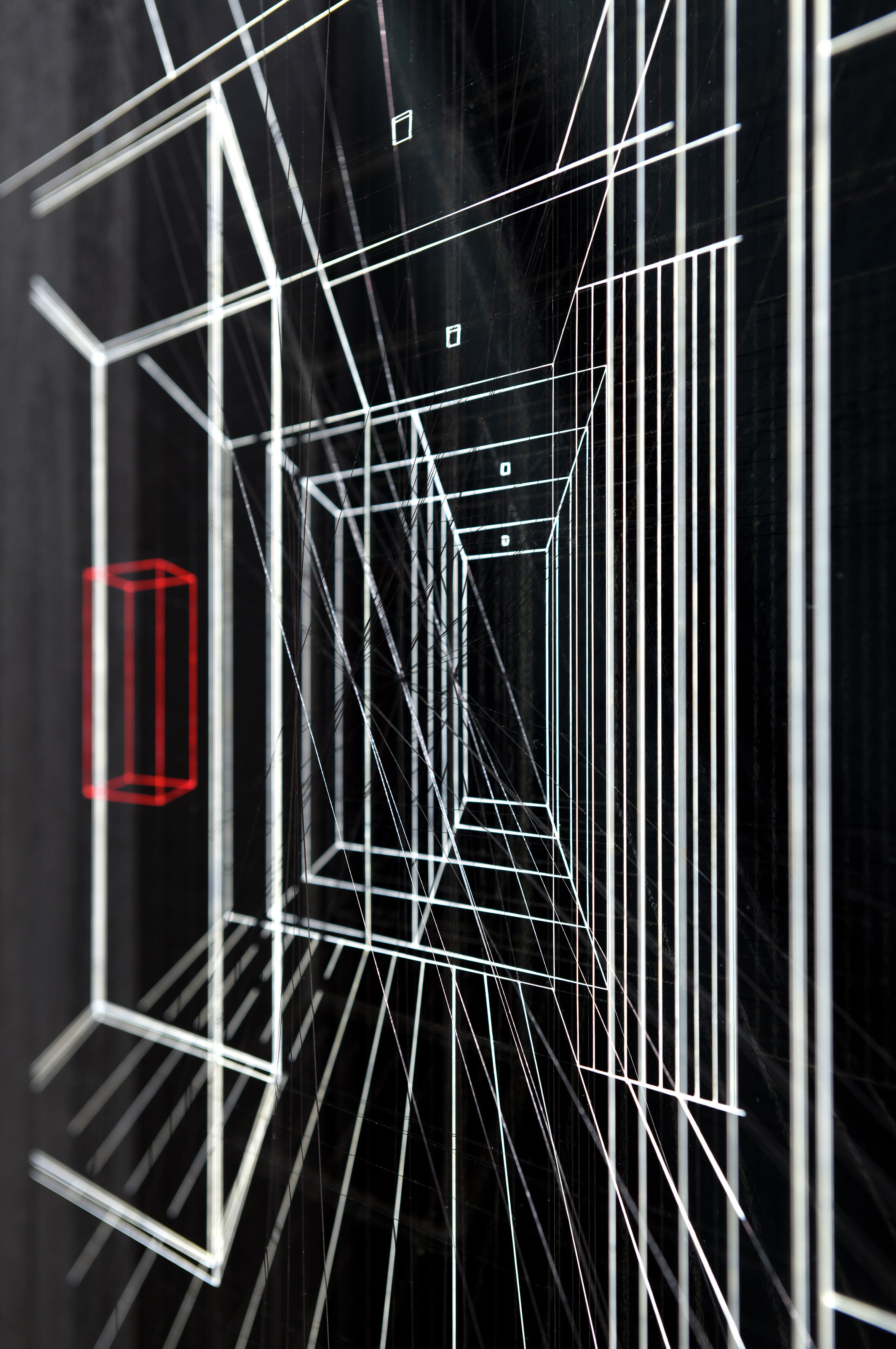 Enamel and acrylic on fluorocarbon thread, internal frames and frame in lacquered wood, painted aluminum background, Museum Glass