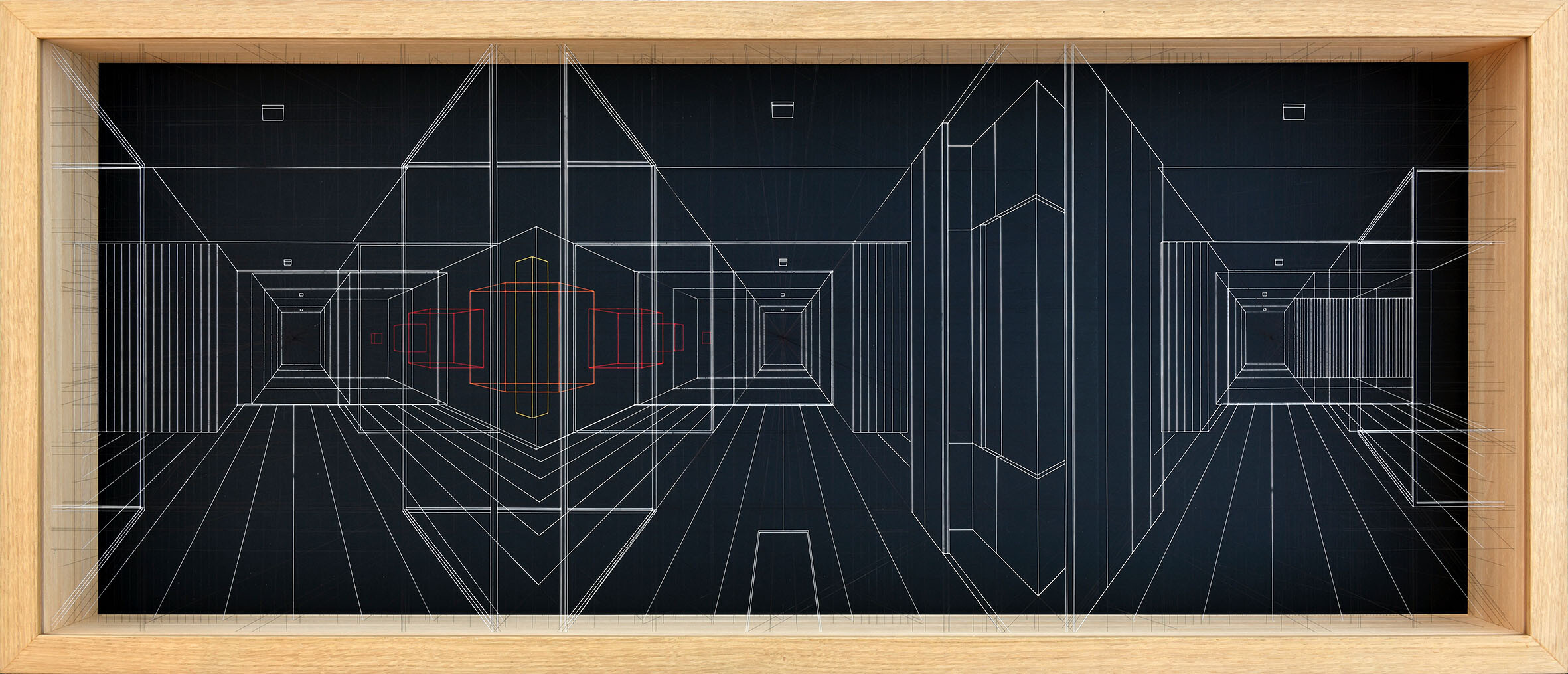 Enamel and acrylic on fluorocarbon thread, frame and internal frames in wood, painted aluminum background, external protective museum glass
