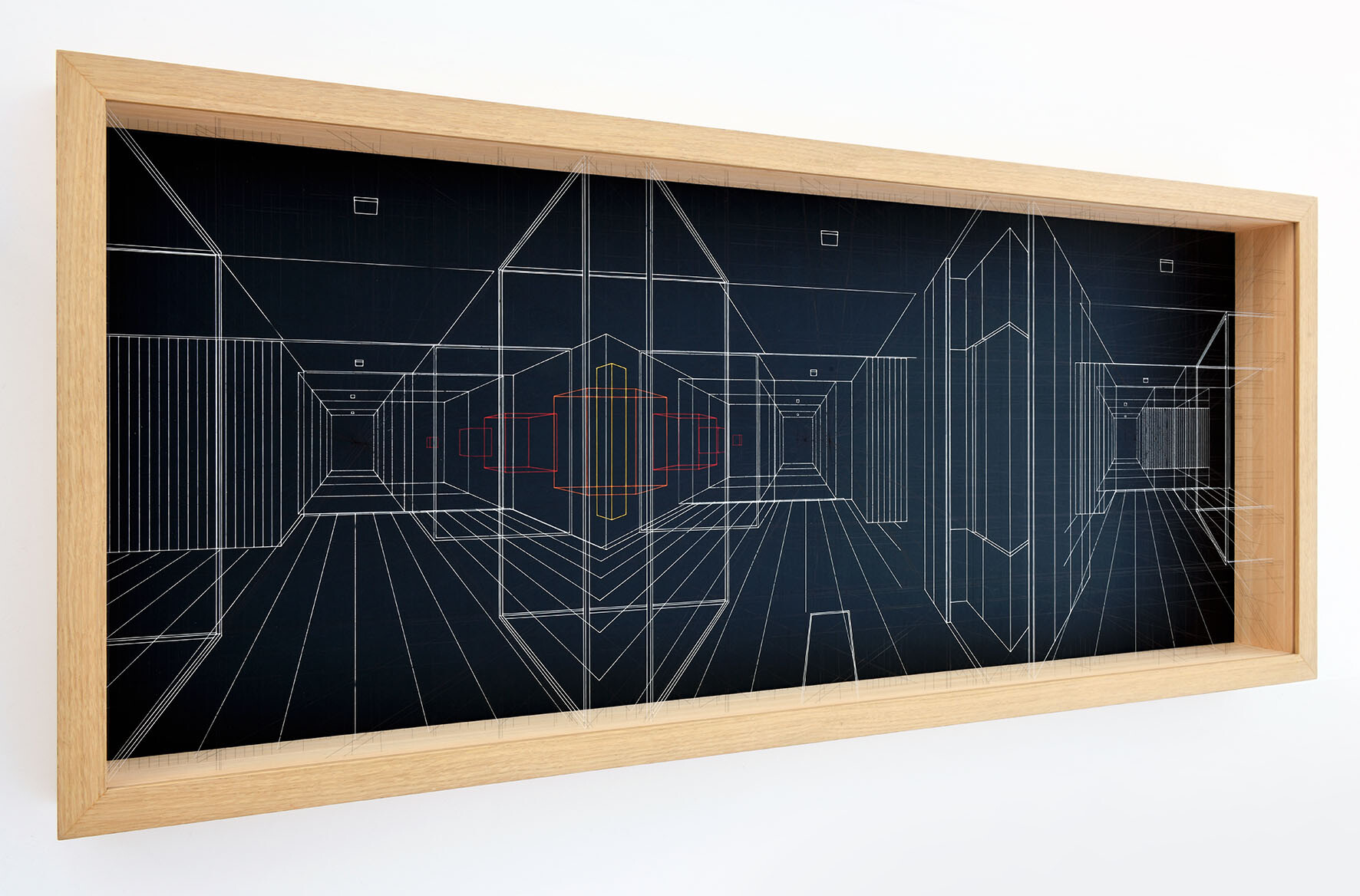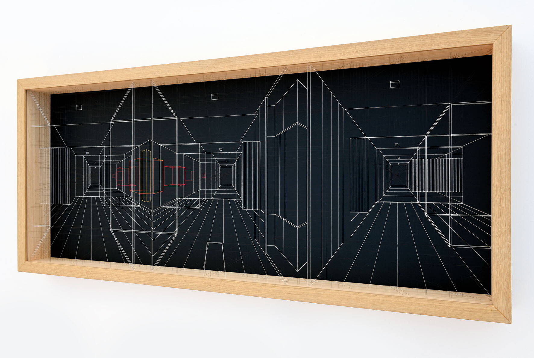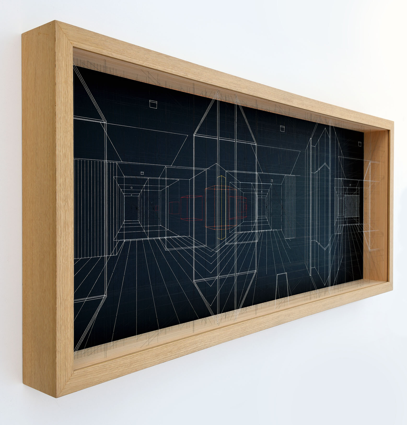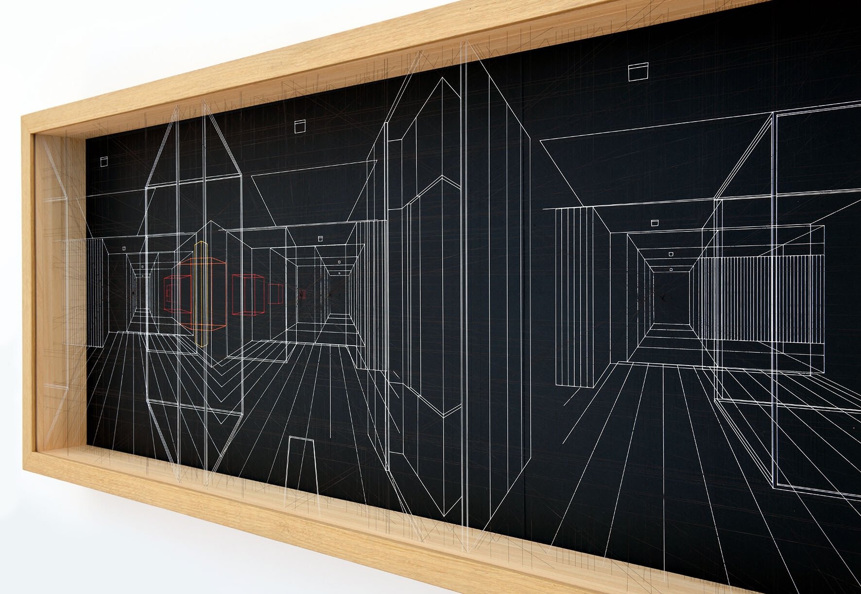 Continuous City is a sophisticated three-dimensional drawing made with thin and transparent fluorocarbon threads, painted and fixed on various overlapping frames.It present hypothetical urban and architectural spaces, such as limbo, metaphysical spaces, abstractions, liminary spaces.