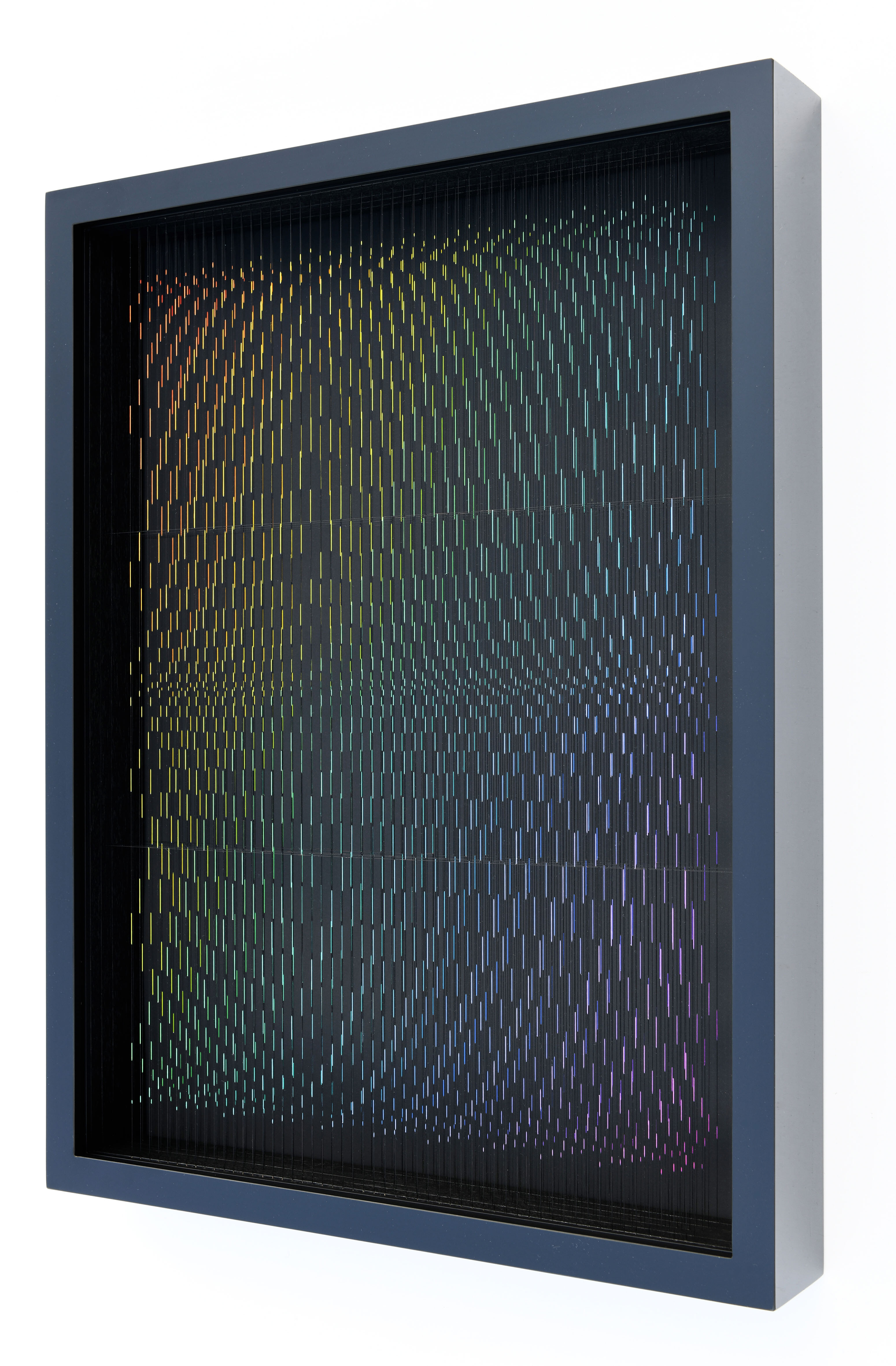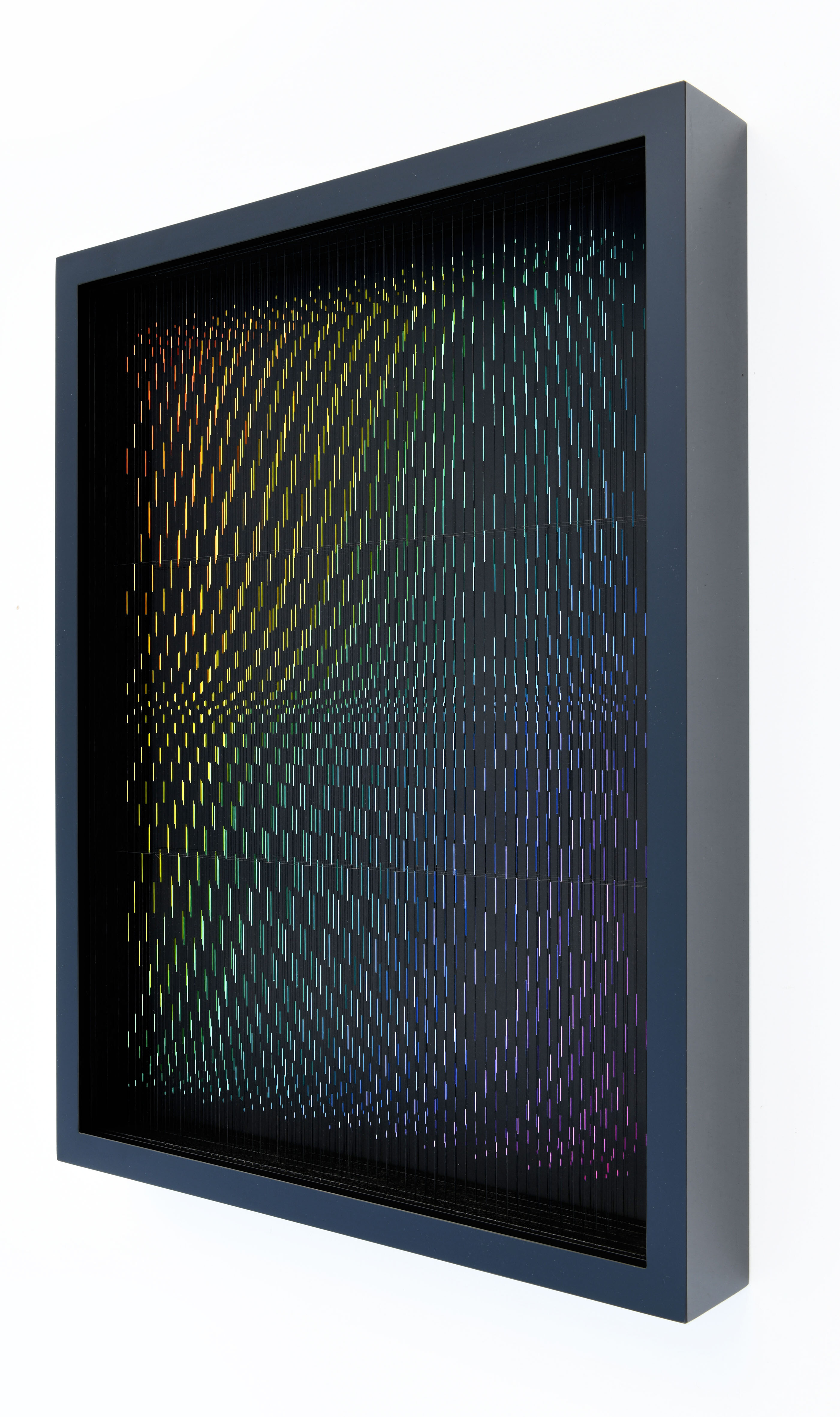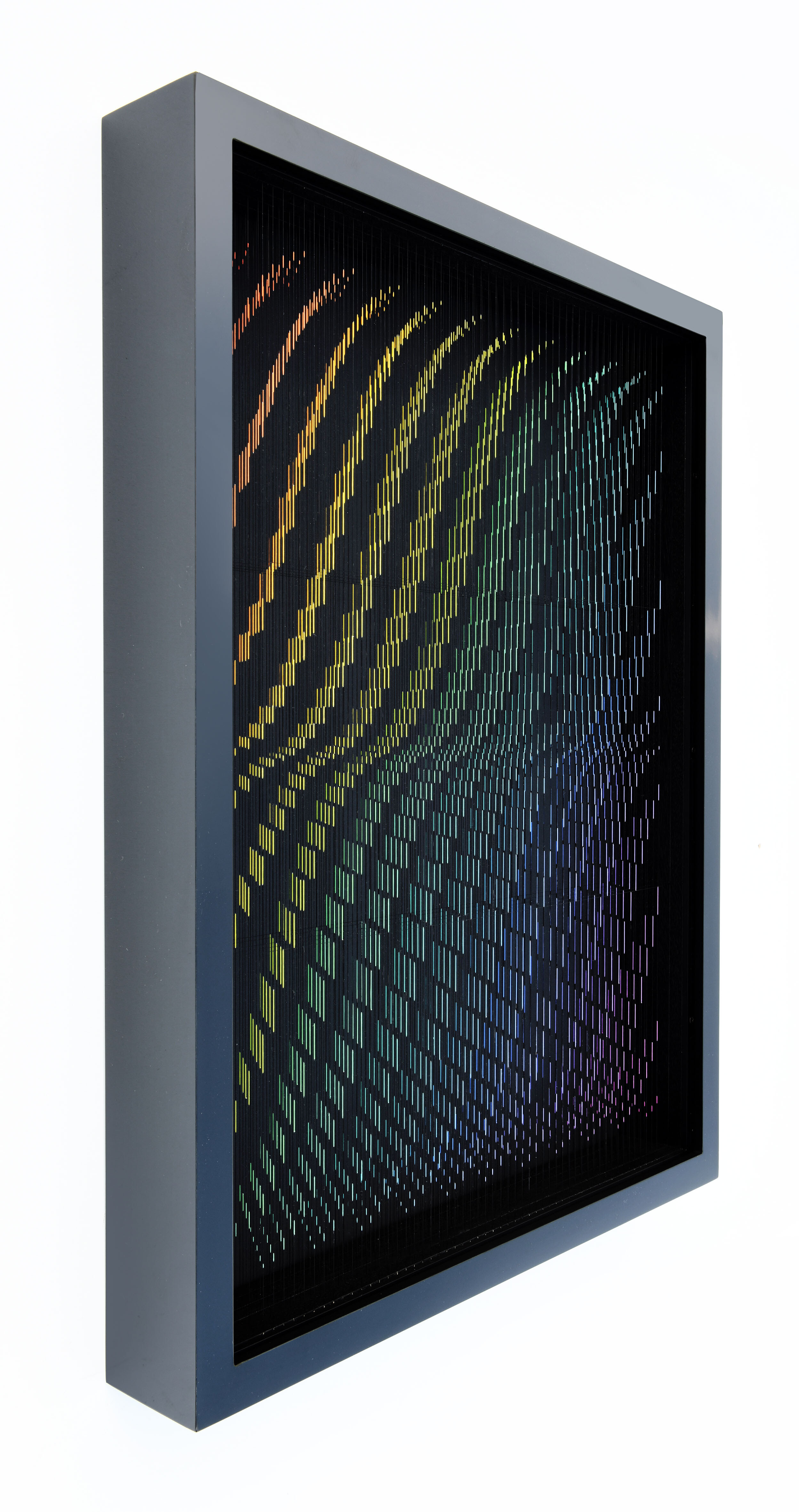 Enamel and acrylic on fluorocarbon thread, frame in wood and glossy black laminate, internal frames in lacquered wood and steel, lacquered wood background, Museum Glass