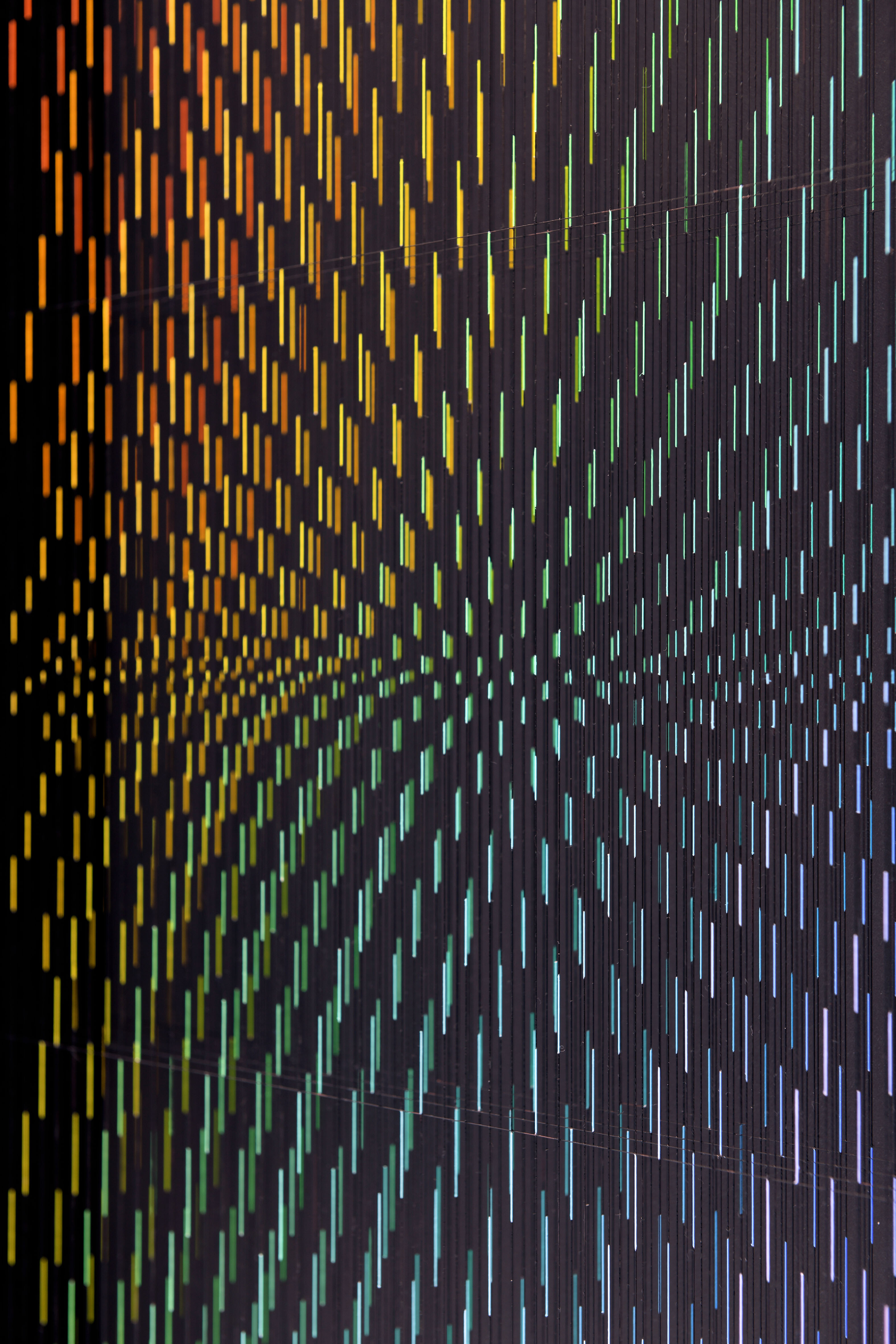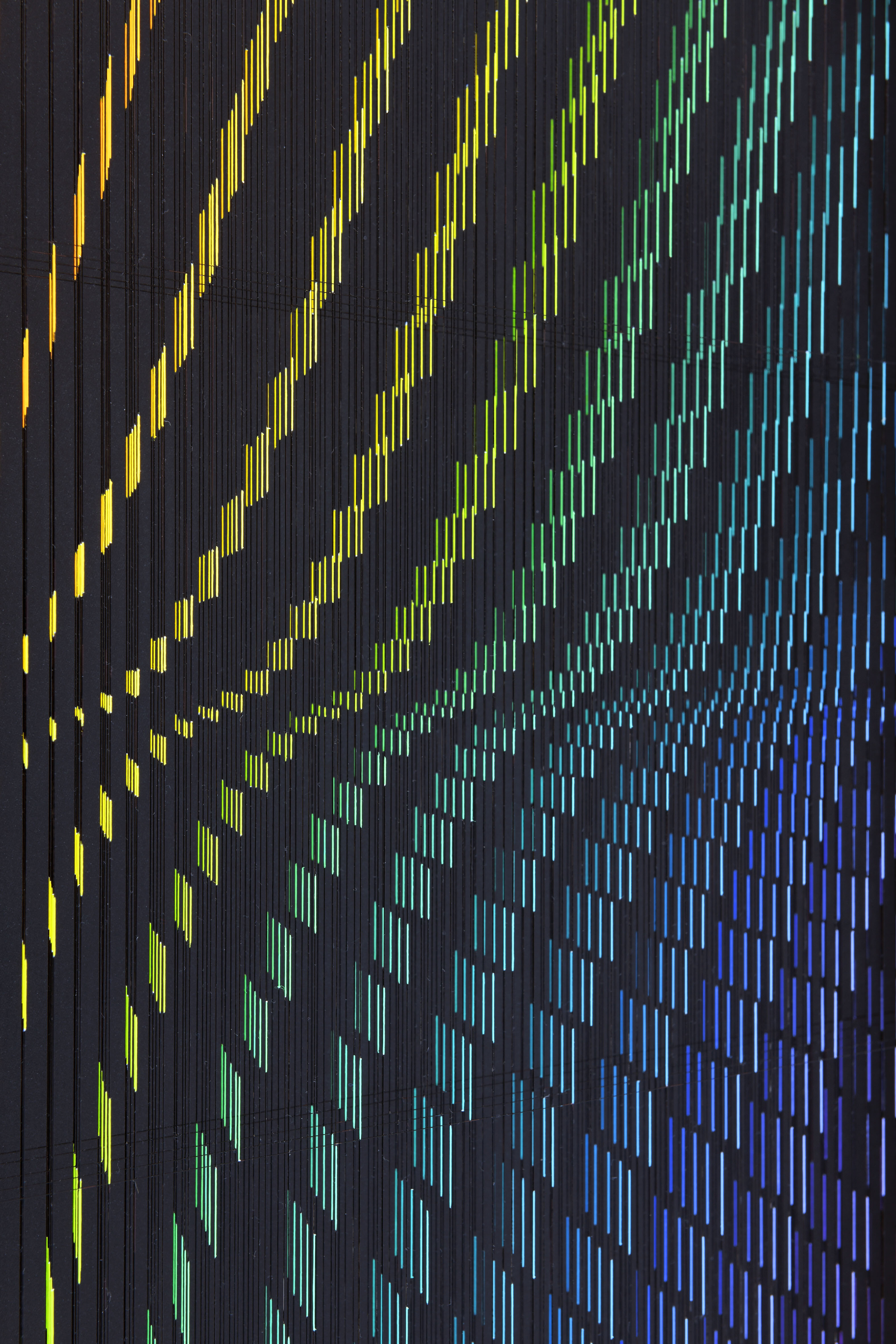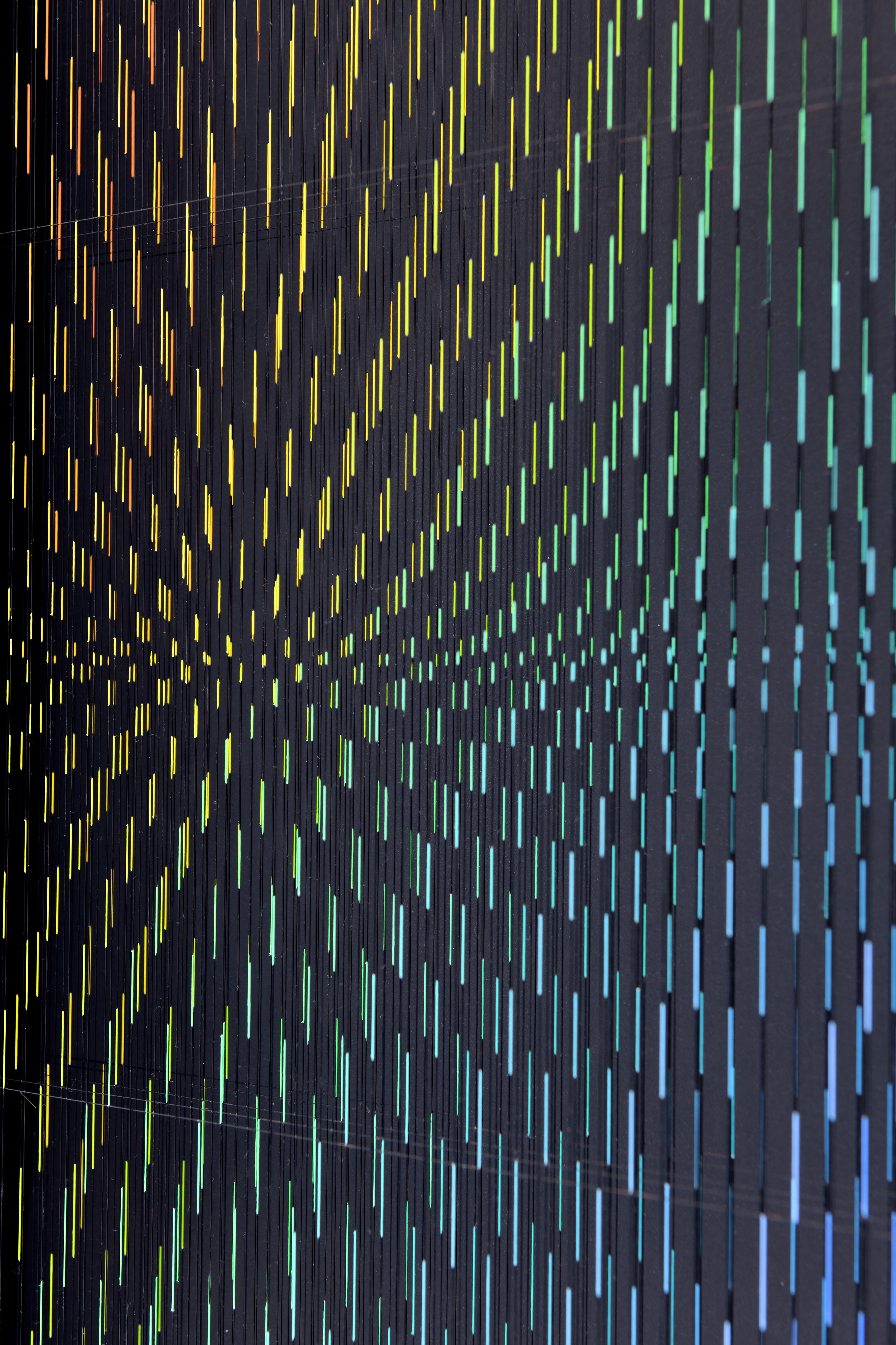 Enamel and acrylic on fluorocarbon thread, frame in wood and glossy black laminate, internal frames in lacquered wood and steel, lacquered wood background, Museum Glass