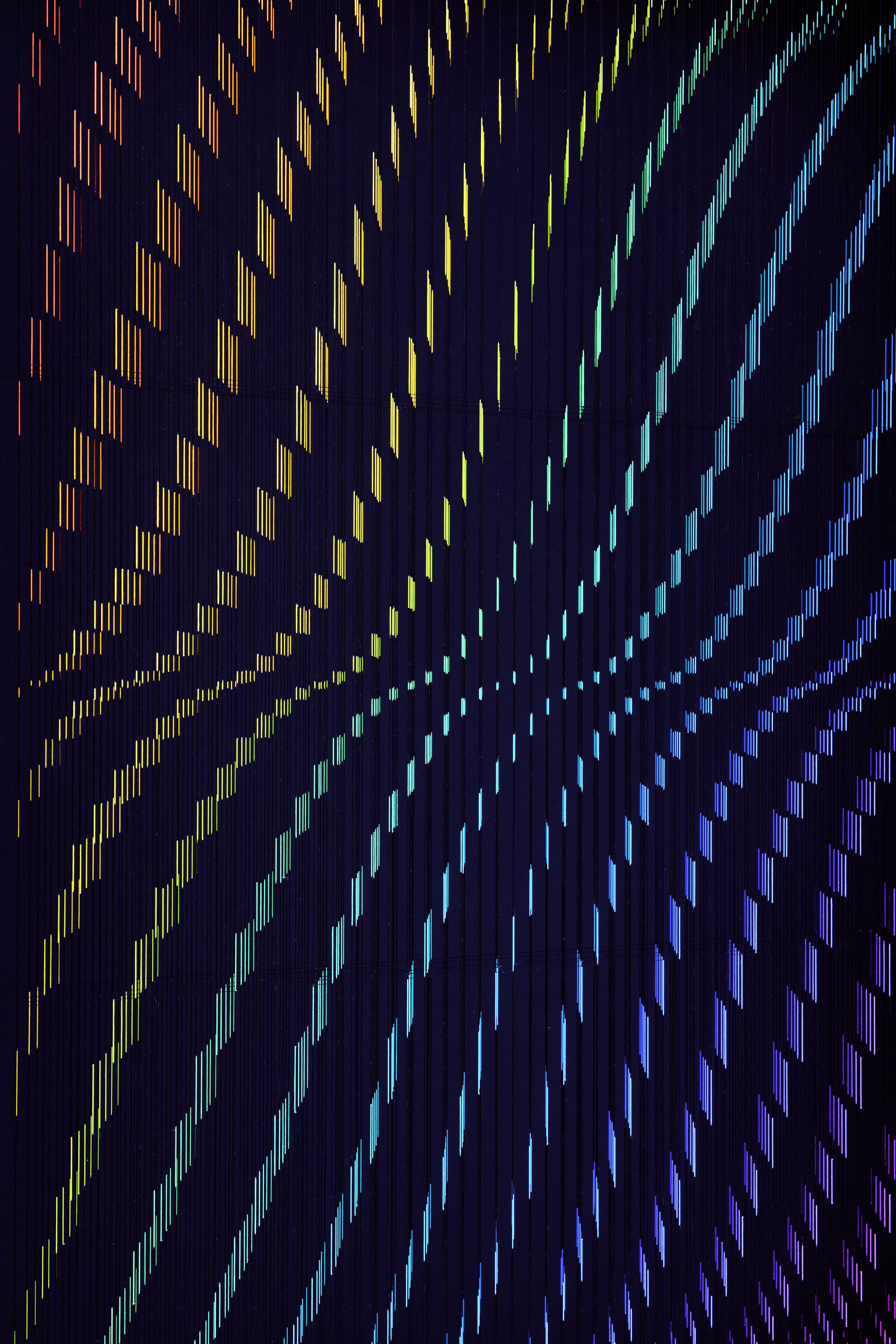 Countless particles of light, between solids and voids, of different lengths and shades, form an alternating series of gravitational waves. Like oscillations of energy, they propagate in space and together they constitute an iridescent pictorial surface, almost as if it were a living body in movement and transformation.