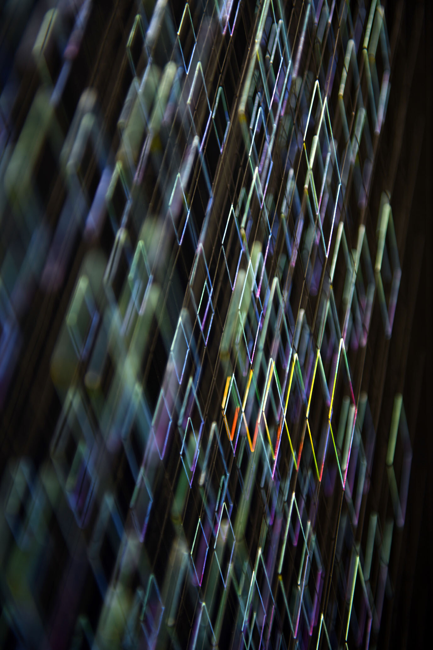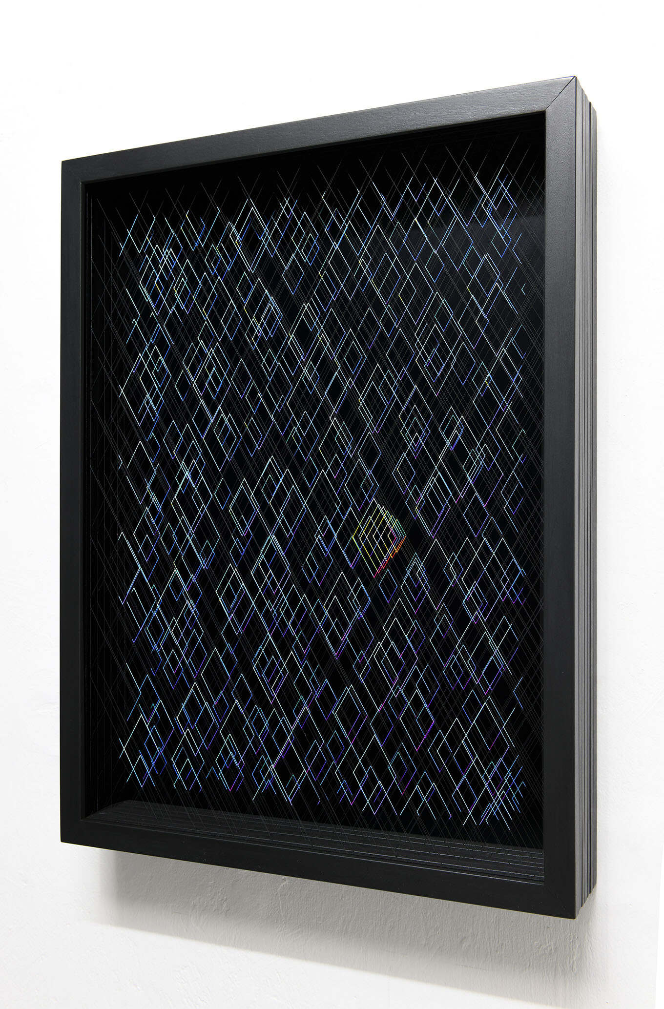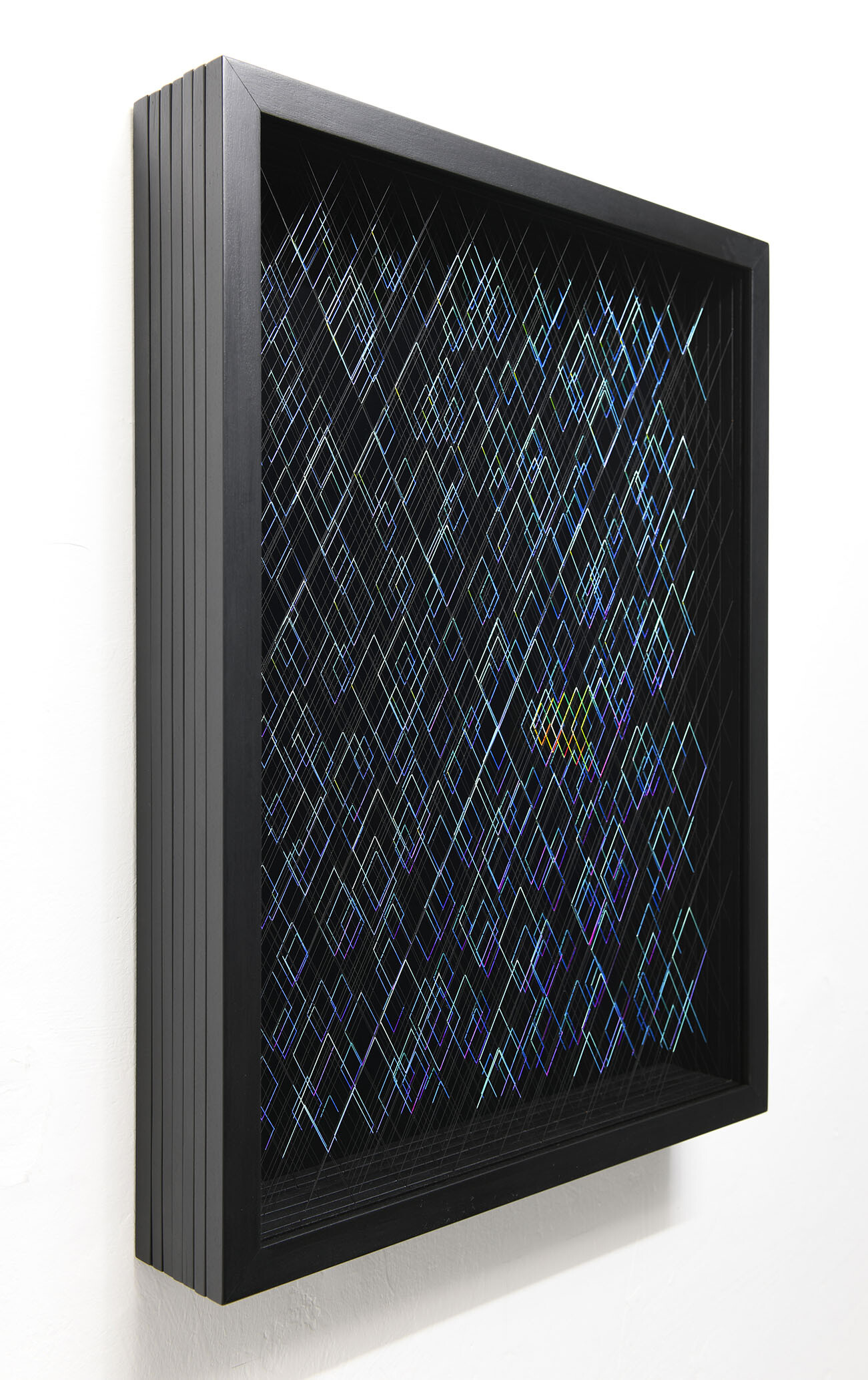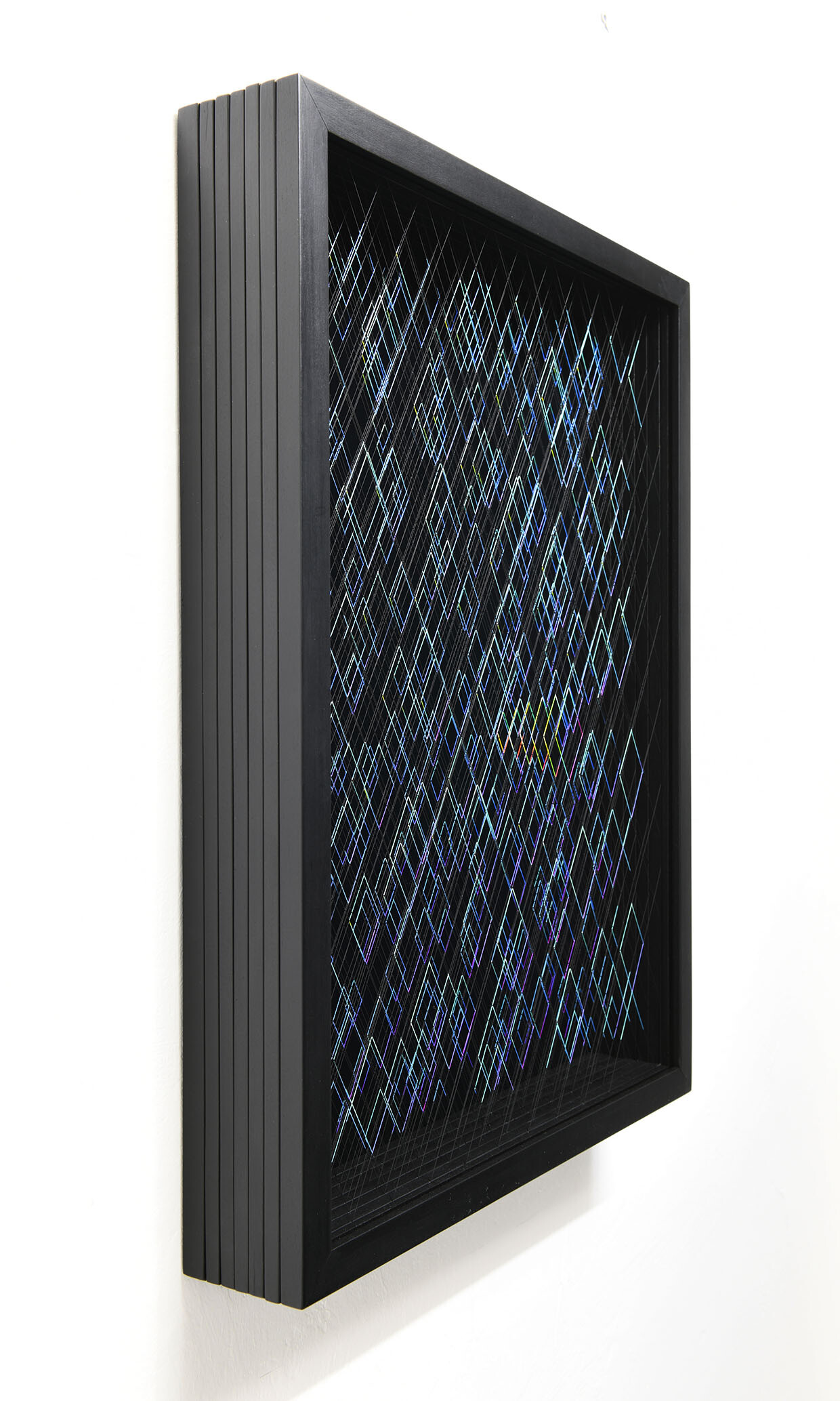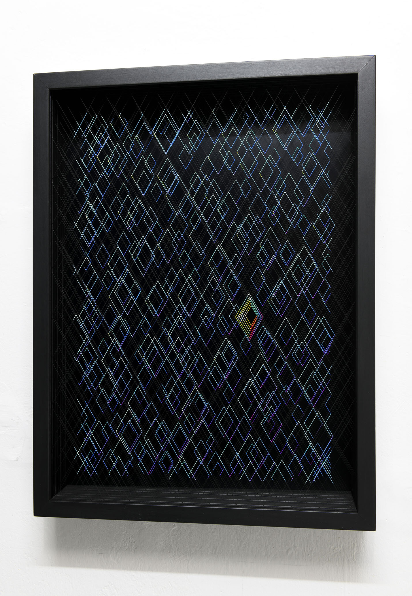 Enamel and acrylic on fluorocarbon thread, wooden frame, painted aluminum background, Museum Glass