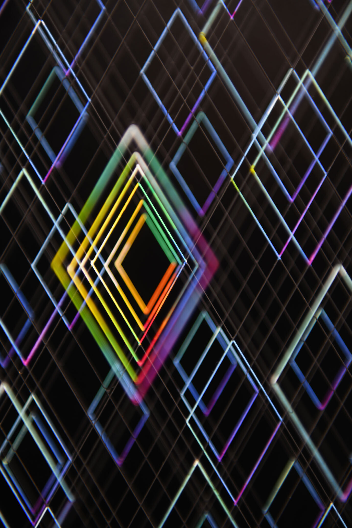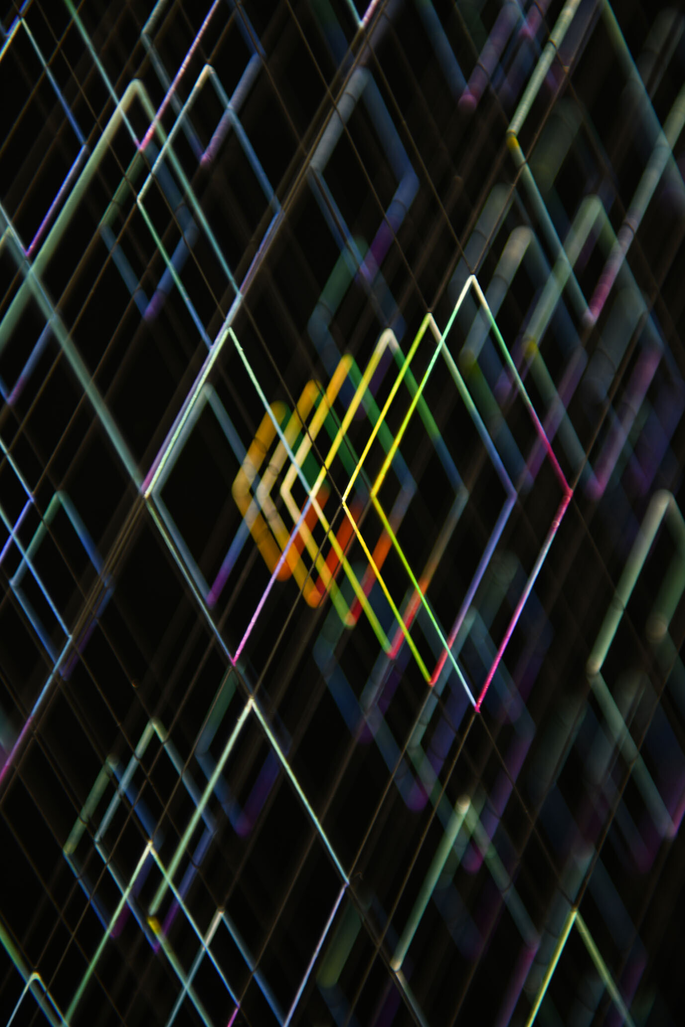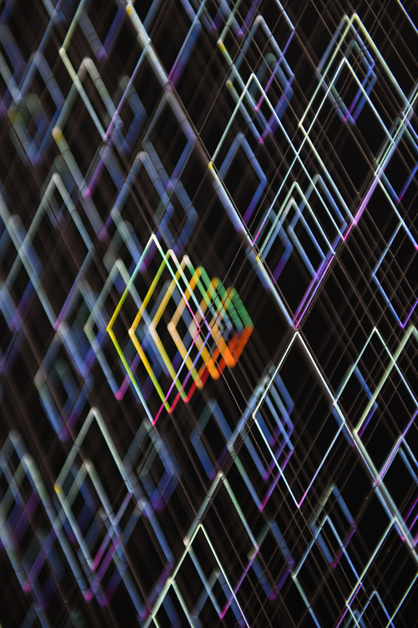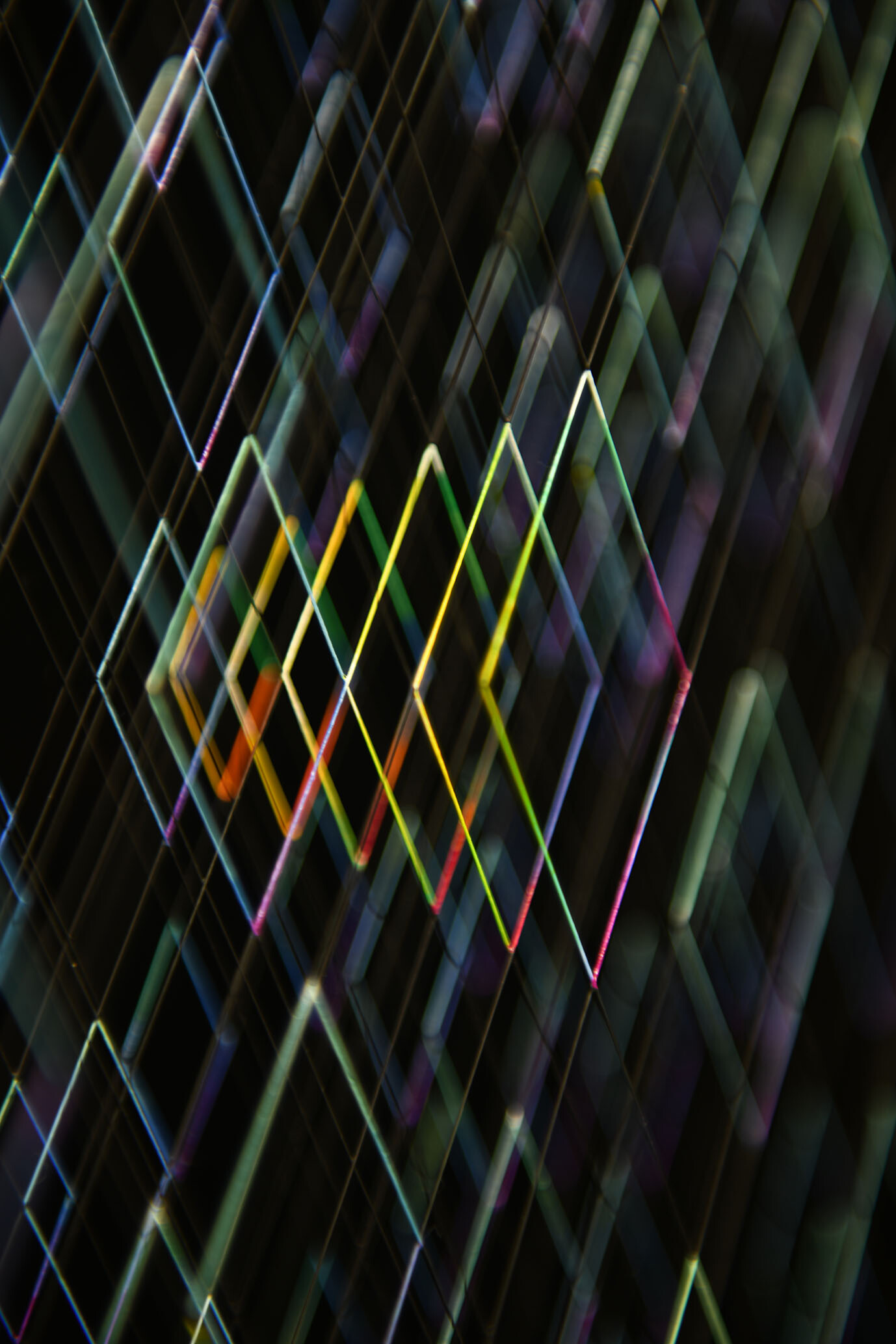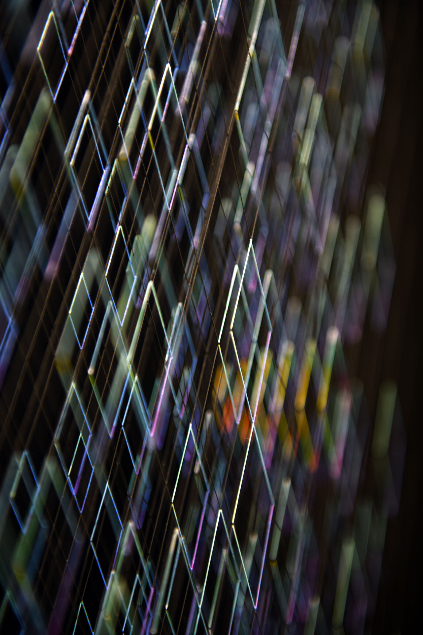 Enamel and acrylic on fluorocarbon thread, wooden frame, painted aluminum background, Museum Glass